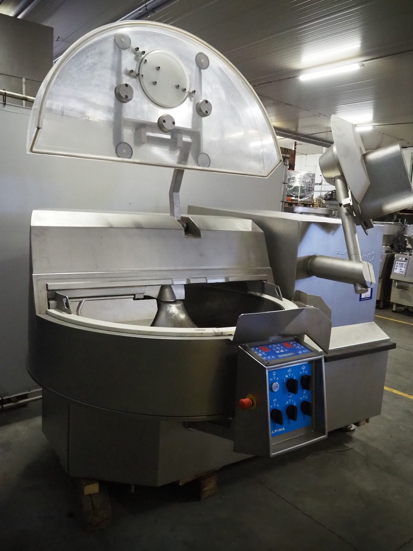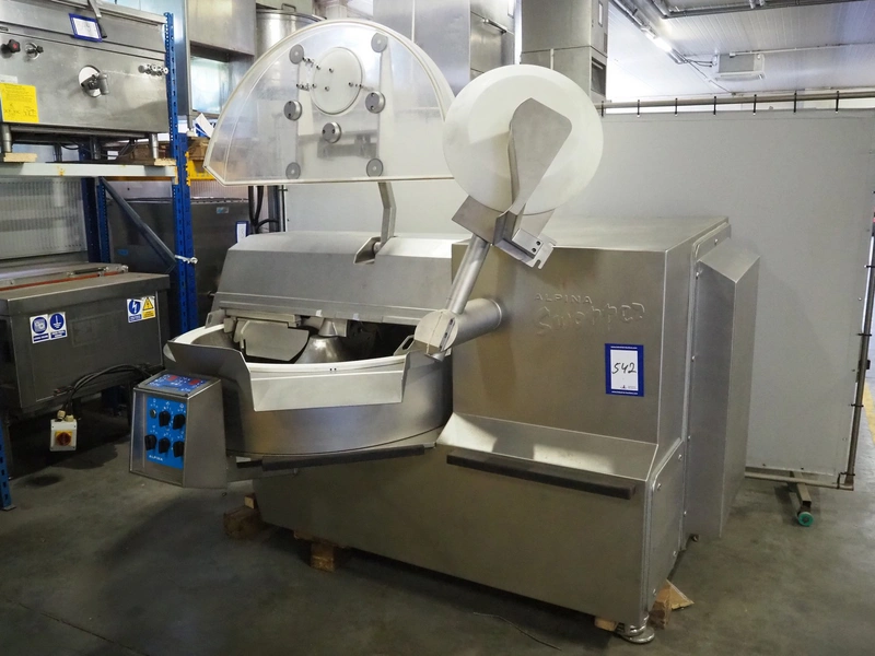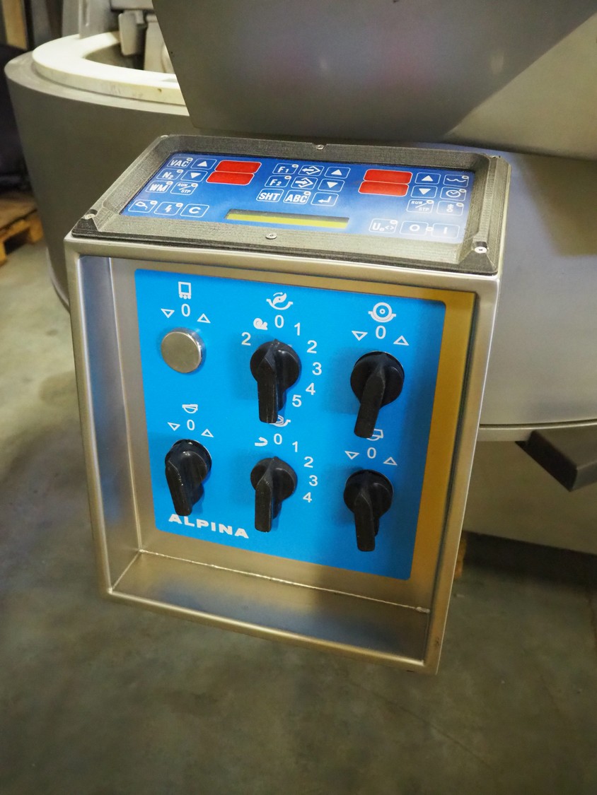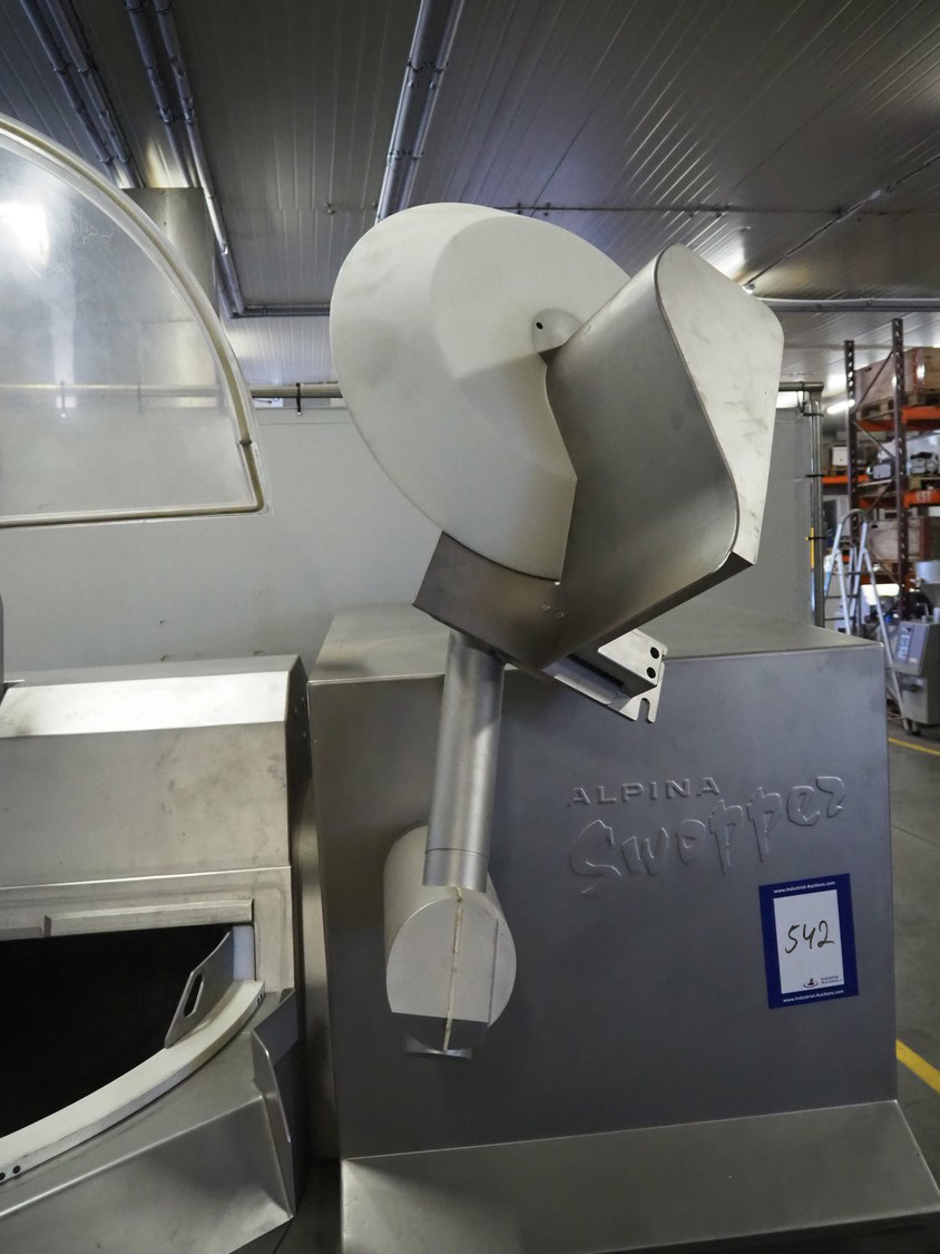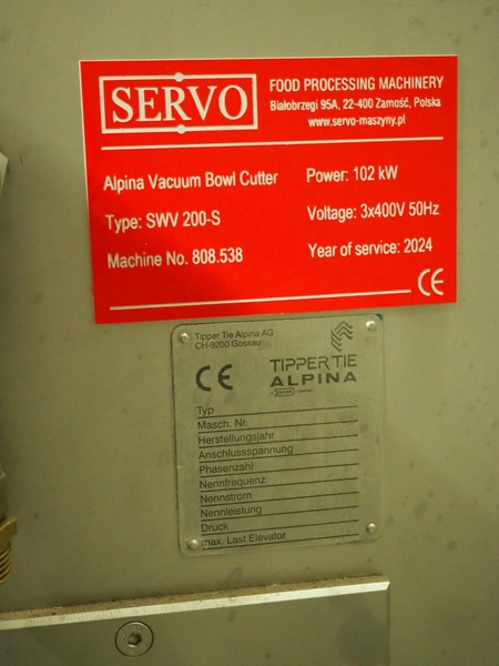 Tipper Tie Alpina AG vacuum bowl cutter with ejector, type: SWV 200-S, machine number: 808.538, year of construction: 2006, year of service: 2024, 400 V, 3 Ph, 50 Hz, 230 A, 102 kW, s/s bowl and knives, dimensions: 2600 mm x 2200 mm x 2300 mm.