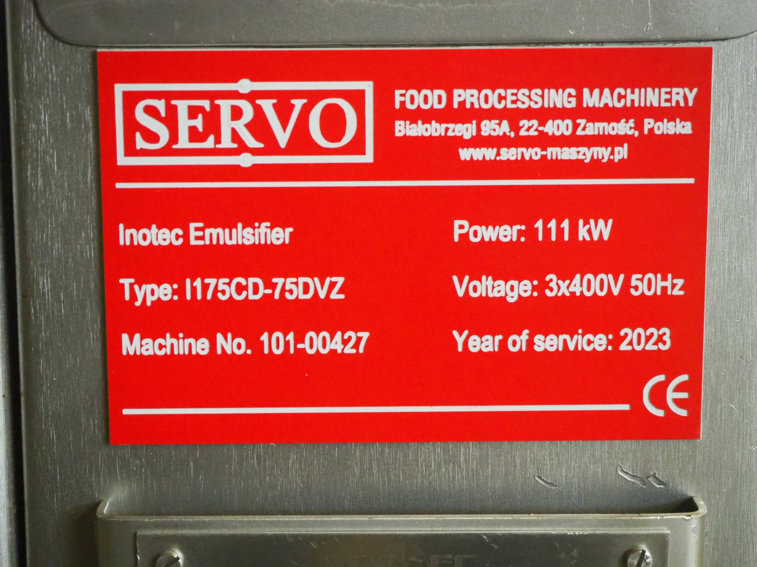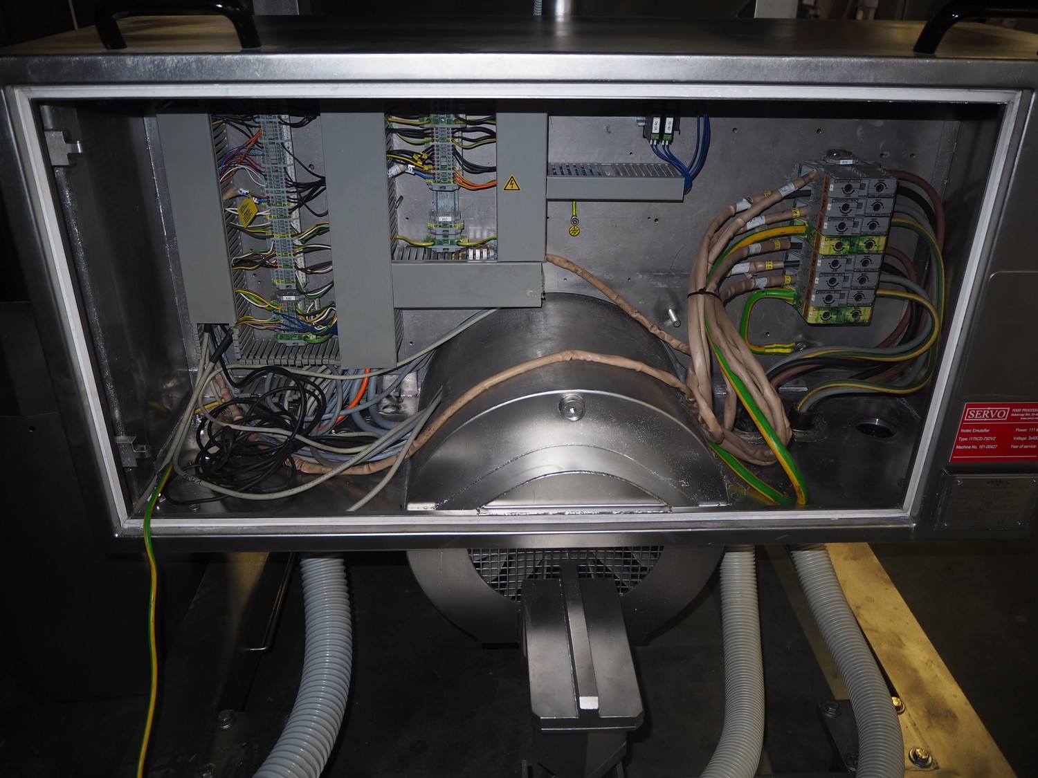 Inotec emulsifier, type: I175CD-75DVZ, number: 101-00427, year of construction: 2005, 230/400 V, 3 Ph, 50 Hz, 182 A, 111 kW, 126 kVa, plate diameter: 175 mm, total dimensions: 1850 mm x 1200 mm x 2785 mm. Including switch cabinet, dimensions: 600 mm x 1250 mm x 2350 mm. Overhauled by Servo.
