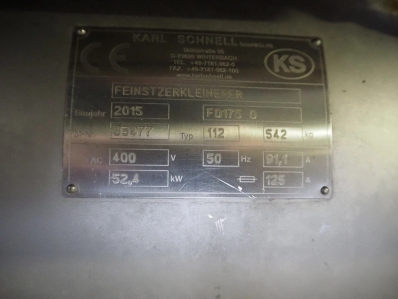 Karl Schnell GmbH & Co. KG mobile micro cutter, model: FD175 D, type: 112, machine number: 35477, year of construction: 2015, 400 V, 50 Hz, 91.1 A, 52.4 kW, weight: 542 kg, diameter plate: 175 mm, total dimensions: 1800 mm x 1000 mm x 900 mm. Including s/s tool trolley, dimensions tool trolley: 550 mm x 500 mm x 640 mm.