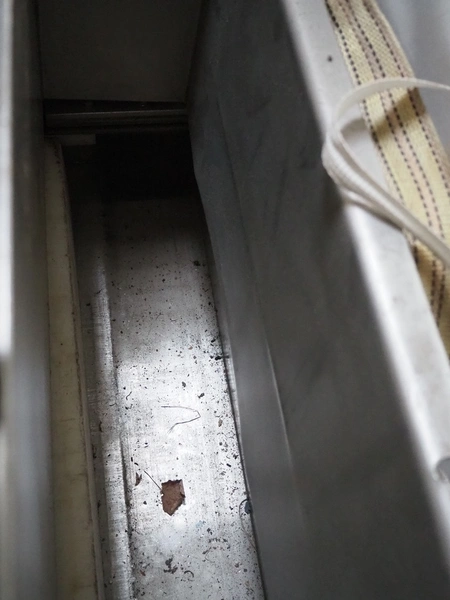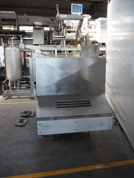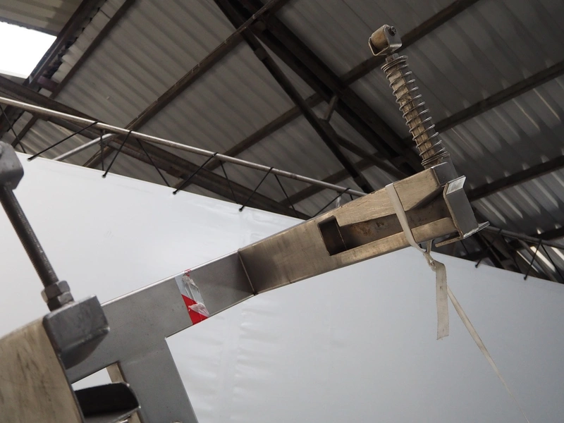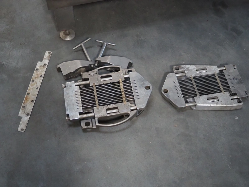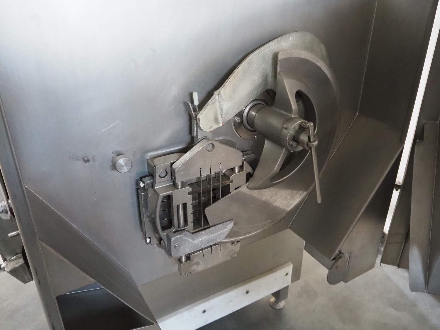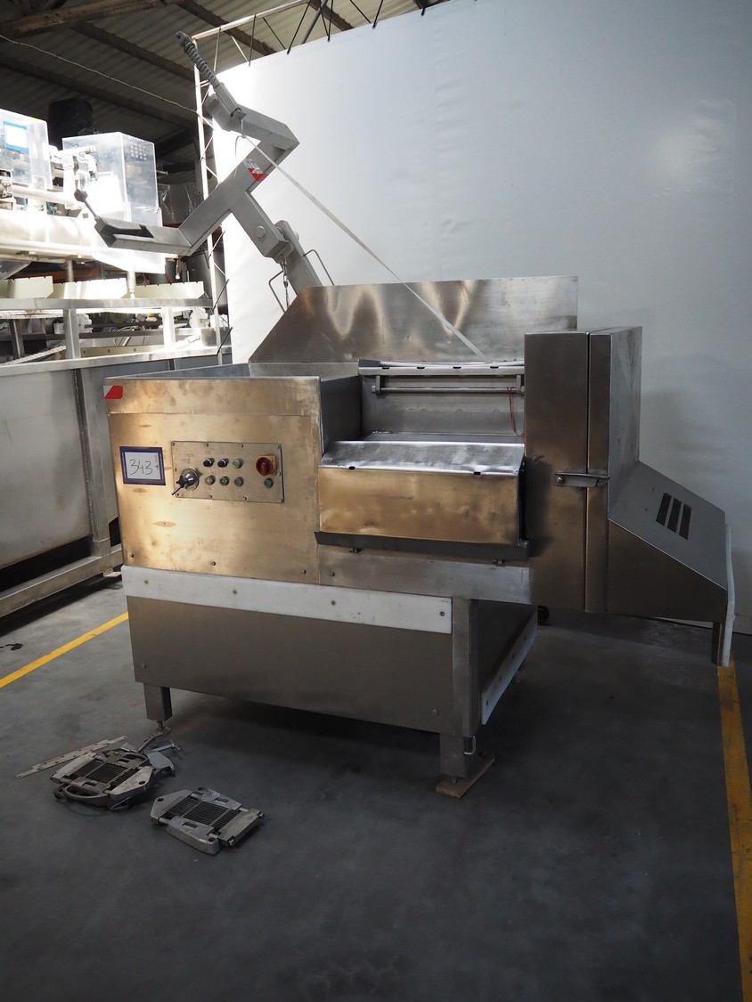 Treif Maschinenbau GmbH dicer with lifter for 200 liter meat bins, type: 1400, machine number: 140006.75041.0224, year of construction: 1994, 380 V, 3 Ph, 50 Hz, 13 A, chamber dimensions: 550 mm x 150 mm x 120 mm, distance between knives: 25 mm, total dimensions: 2600 mm x 1400 mm x 2800 mm. Including extra knife grid, distance between knives: 5 mm.