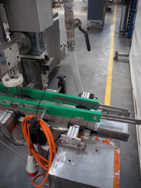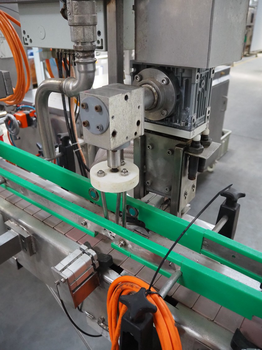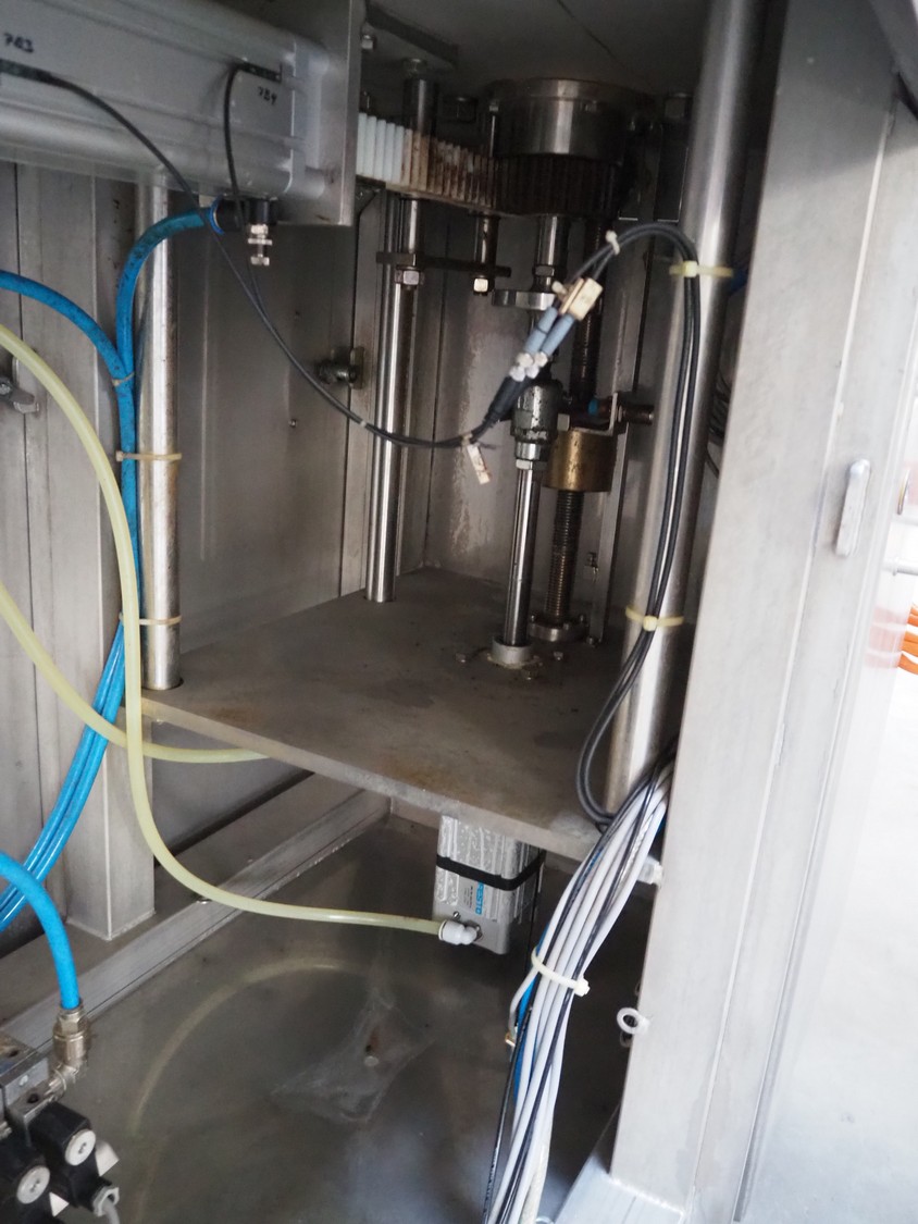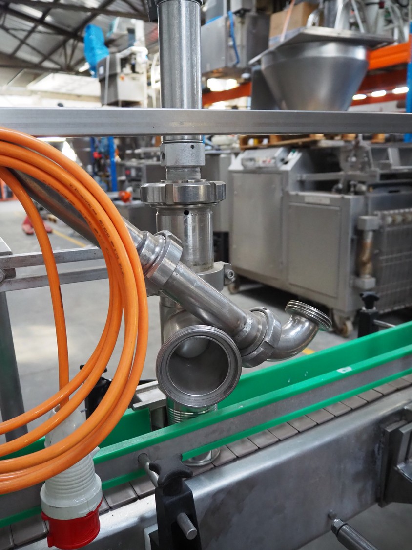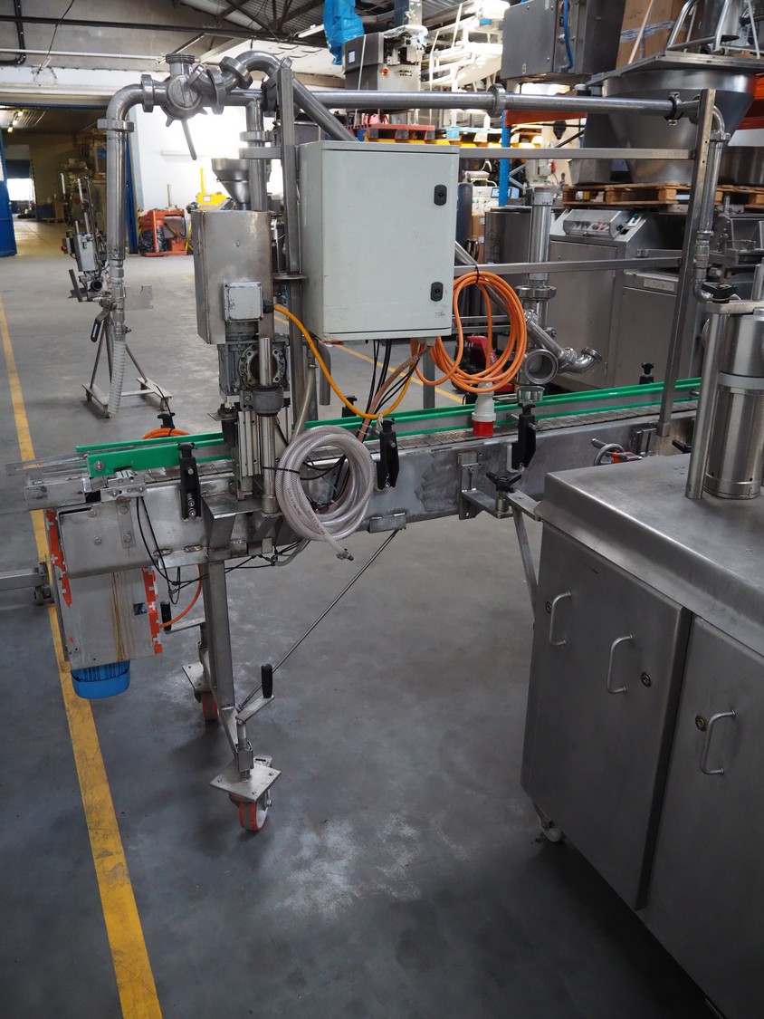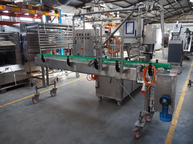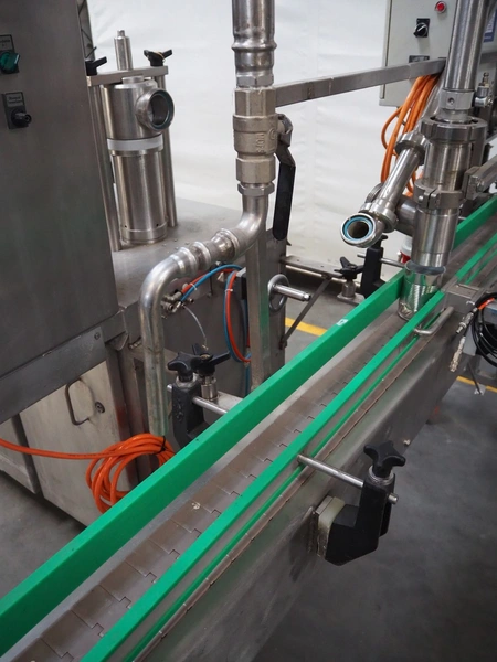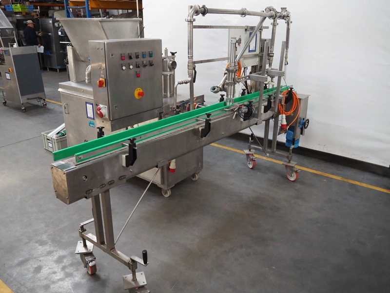 Leonhardt mobile filling station for cans, type: AG 1 DPZ0/S, number: 0140/1022, year of construction: 2002, total dimensions filling machine: 2100 mm x 1300 mm x 1770 mm. With mobile belt, plastic belt, belt width: 100 mm, filling head: Ø 70 mm, total dimensions belt: 3100 mm x 650 mm x 1900 mm.