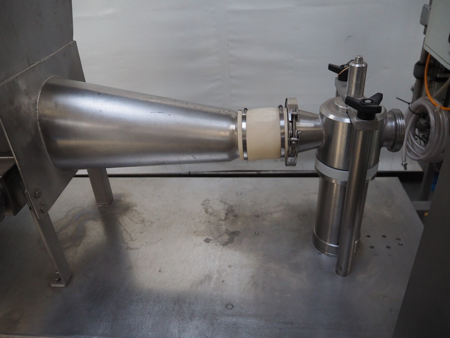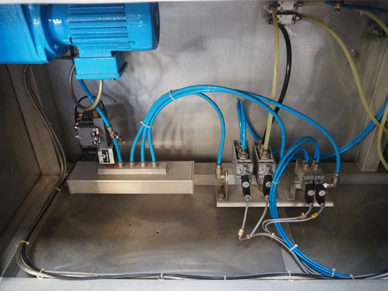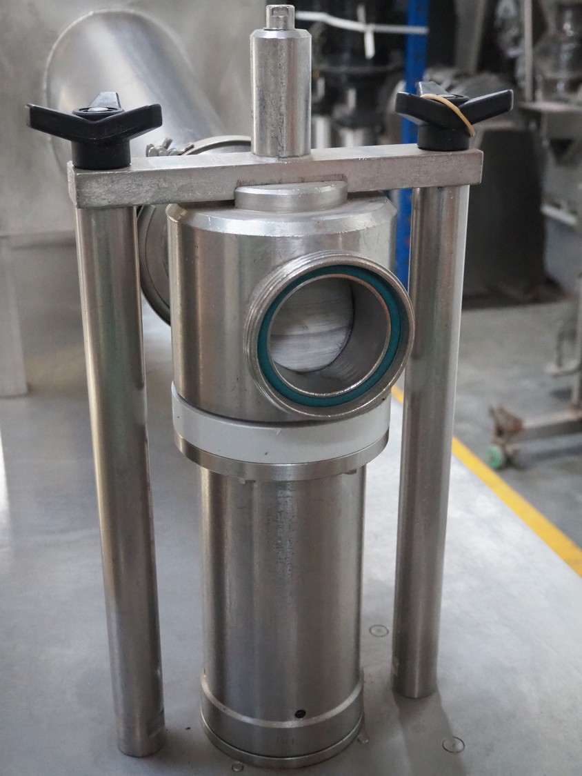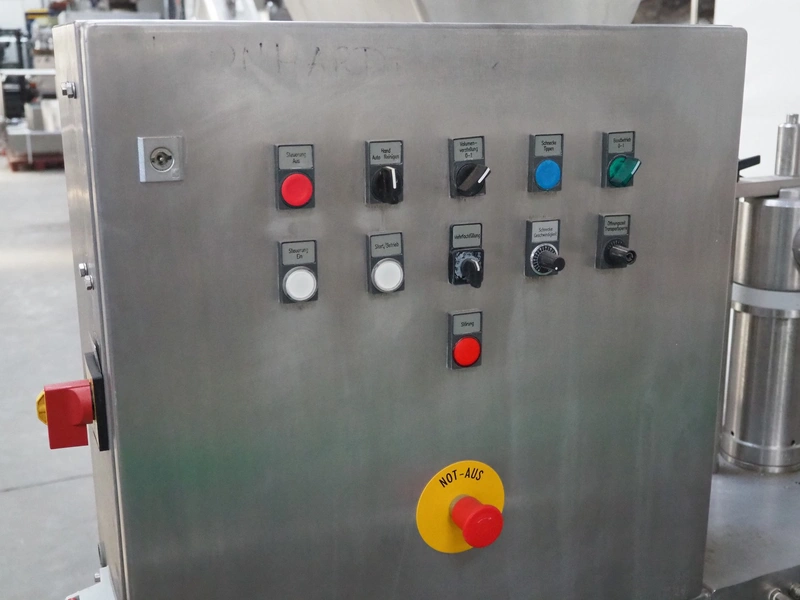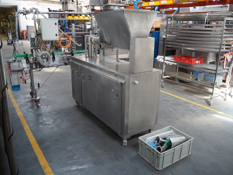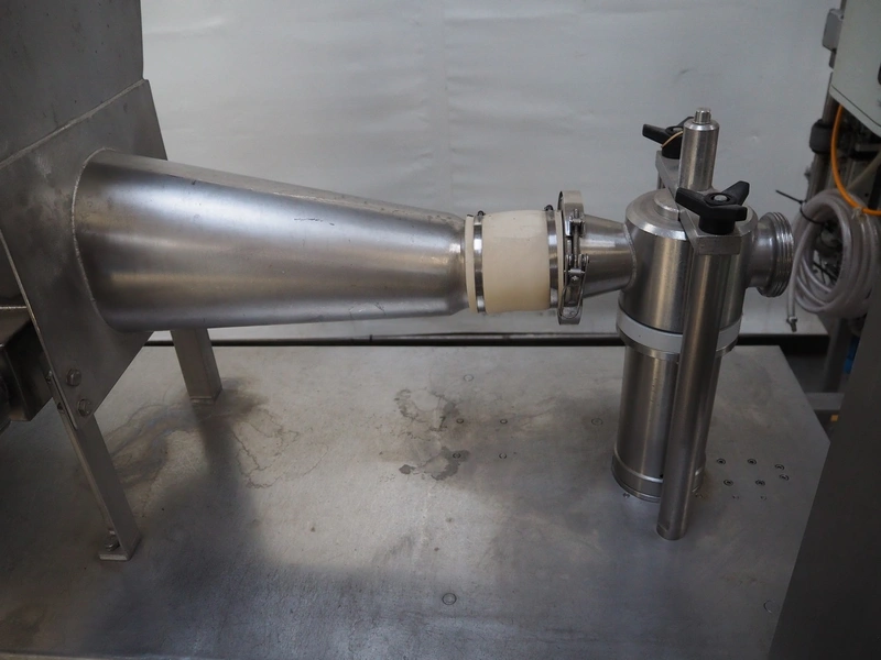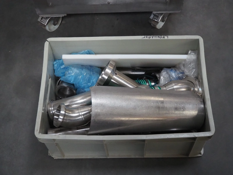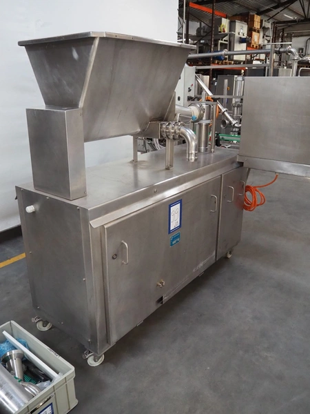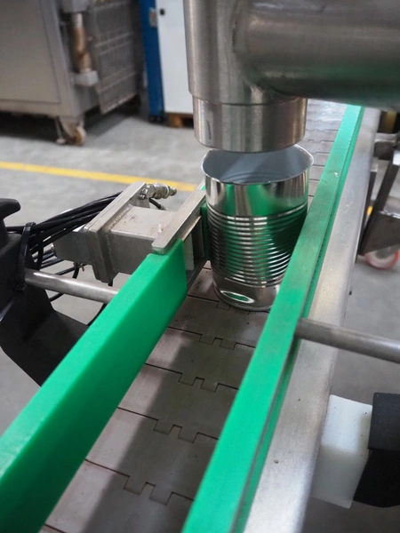 Leonhardt mobile filling station for cans, type: AG 1 DPZ0/S, number: 0140/1022, year of construction: 2002, total dimensions filling machine: 2100 mm x 1300 mm x 1770 mm. With mobile belt, plastic belt, belt width: 100 mm, filling head: Ø 70 mm, total dimensions belt: 3100 mm x 650 mm x 1900 mm.