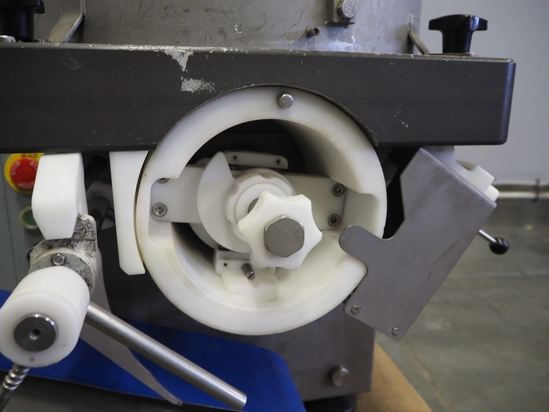 Deighton Manufacturing UK LTD forming machine, oval shaped dye, dimensions dye: 50 mm x 30 mm, plastic belt, belt width: 125 mm, total dimensions: 950 mm x 500 mm x 750 mm. Without plastic cover for forms.