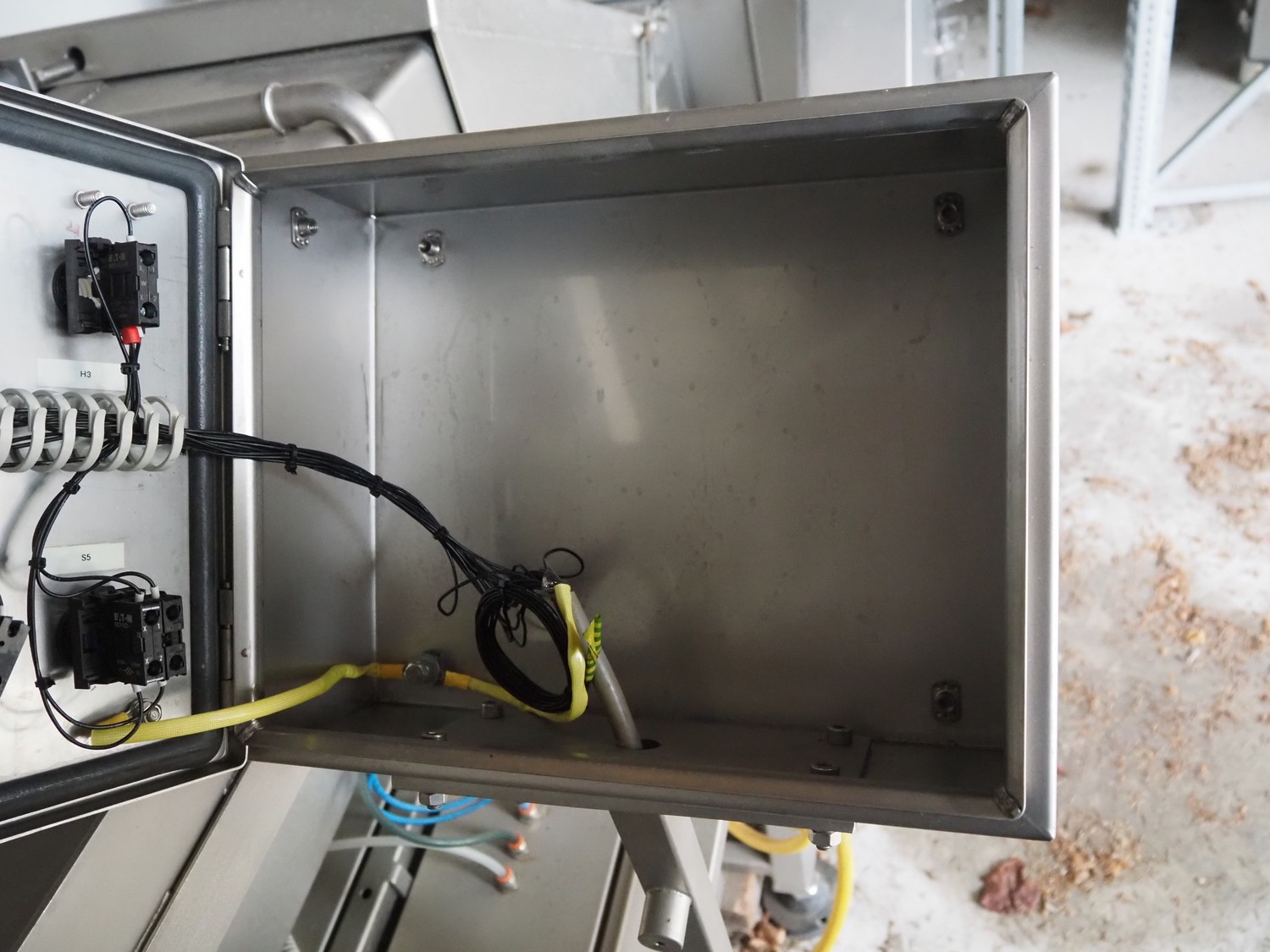 Frozen block cutter, clearance: 600 mm x 230 mm, total dimensions: 2300 mm x 1150 mm x 1300 mm.
