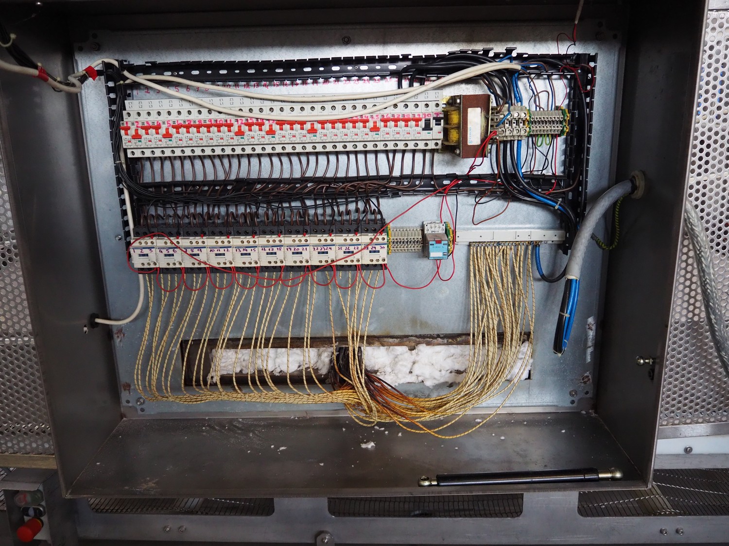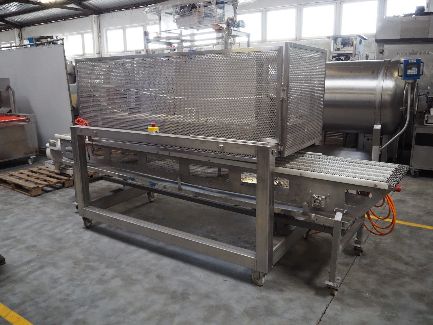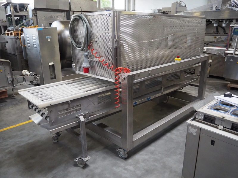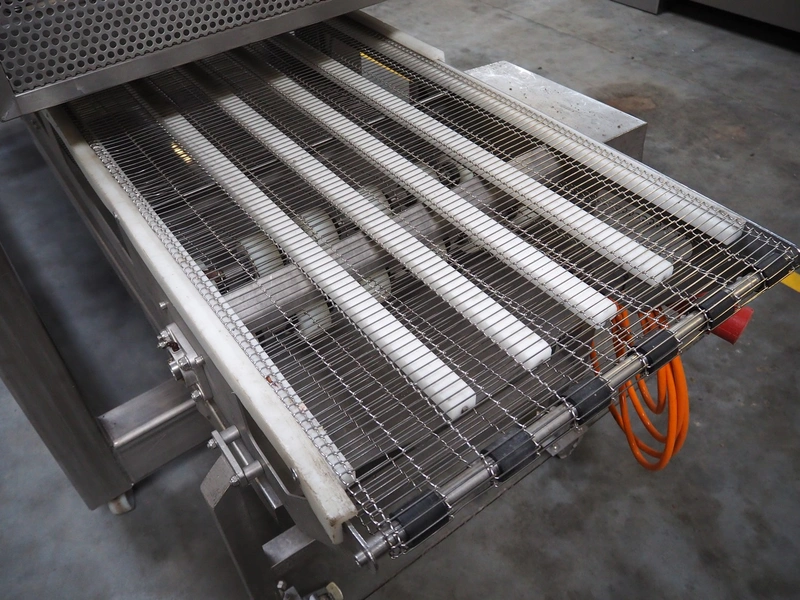 Mobile s/s top grilling belt, grilling surface: 1800 mm x 600 mm, mobile transport belt, s/s frame, s/s mesh belt, belt width: 600 mm, dimensions grilling machine: 2250 mm x 1200 mm x 1900 mm, dimensions transport belt: 3850 mm x 900 mm x 950 mm.