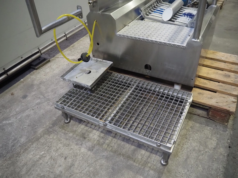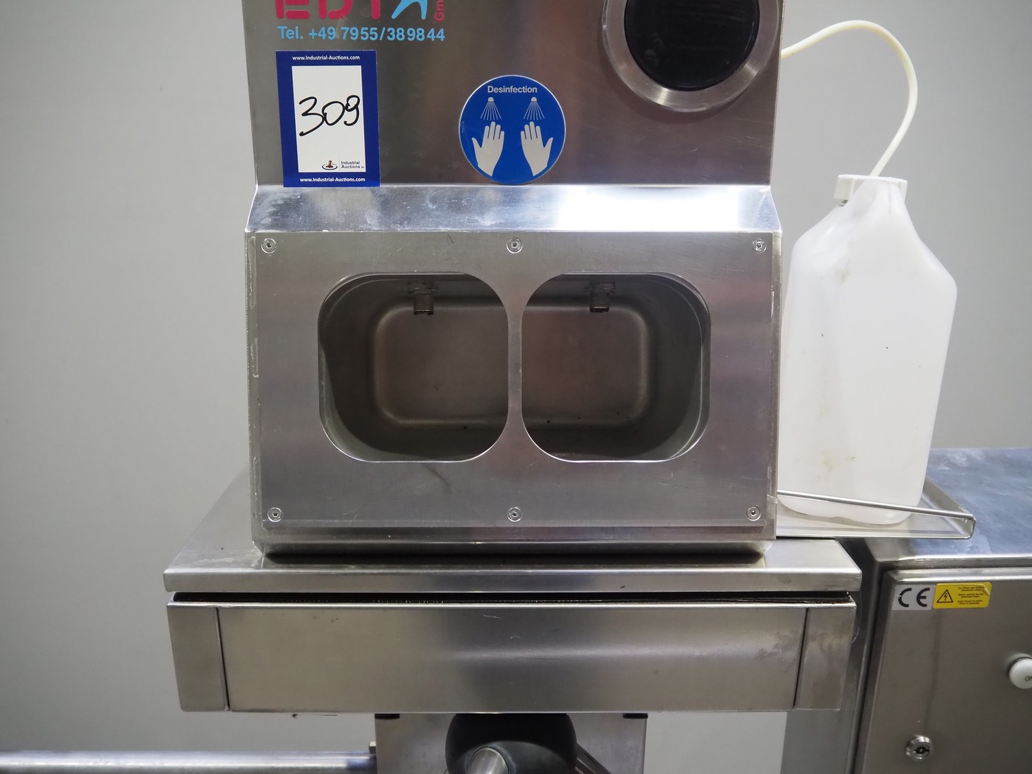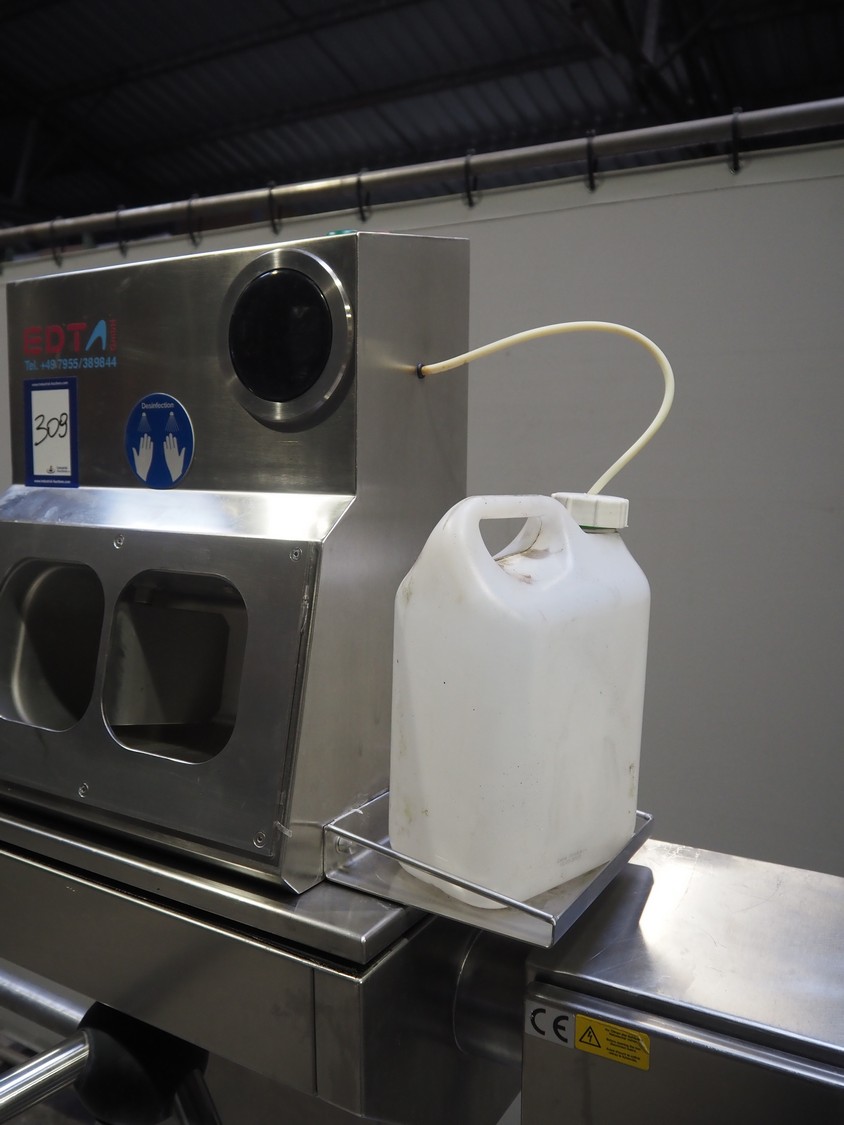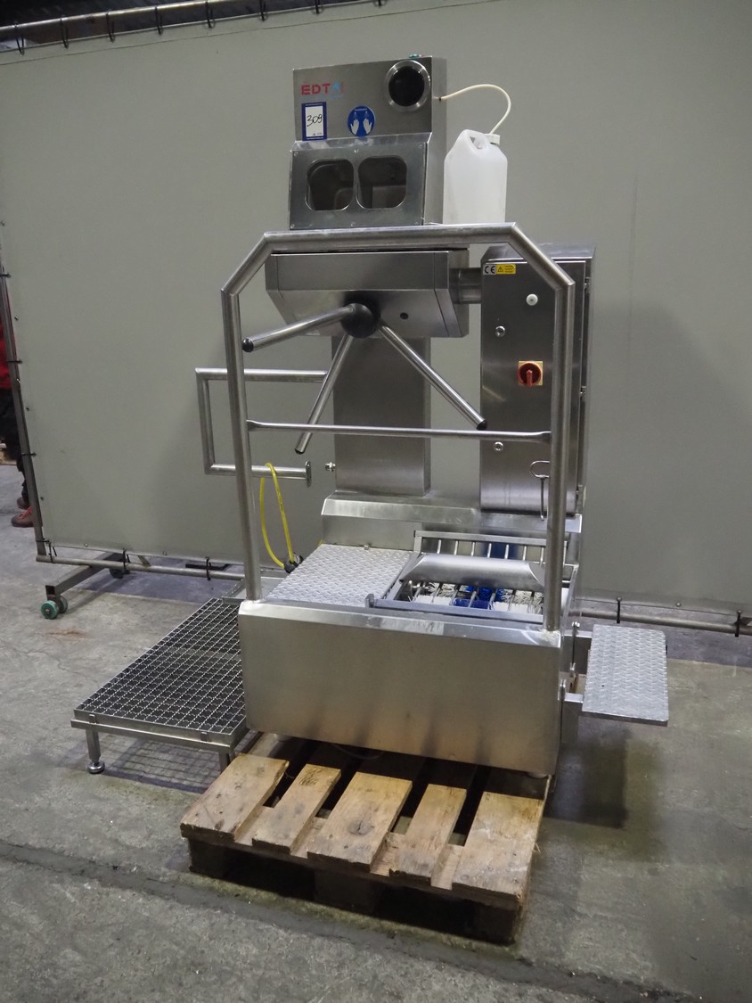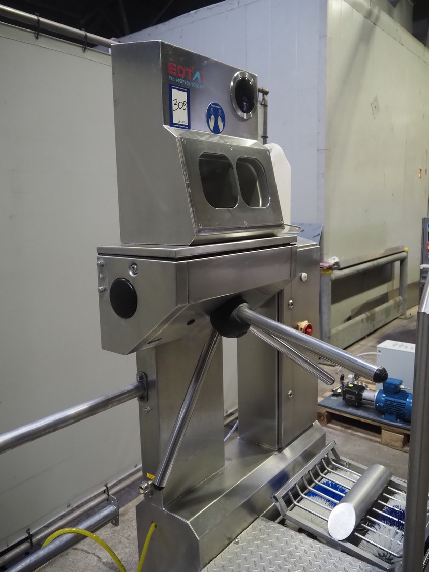 EDTA GmbH hygiene station with sole cleaner, hand disinfection and tourniquet, type: DSR100005A08, year of construction: 2005, 230/400 V, 3 A, 1 kW, brush length: 320 mm, total dimensions: 900 mm x 1700 mm x 1800 mm.