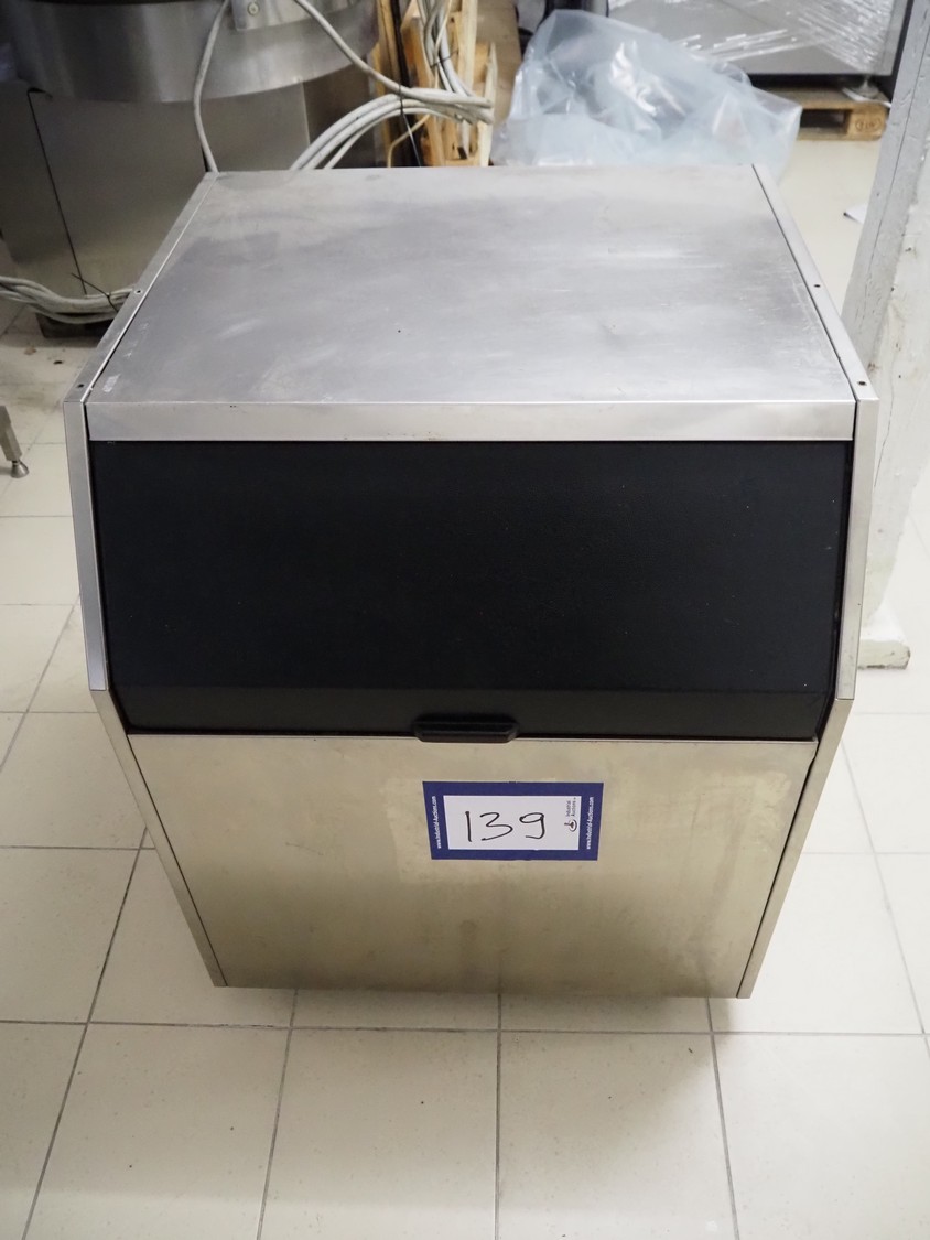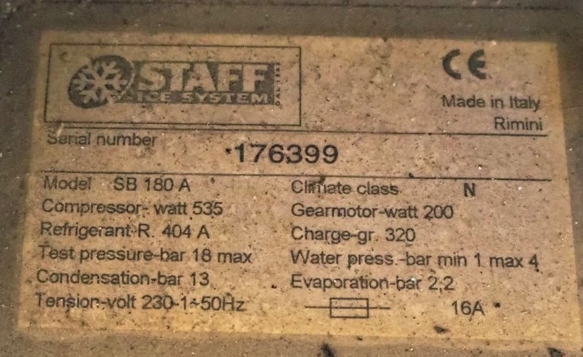 Staff Ice System ice cube machine, model: SB 180 A, serial number: 176399, 230 V, 1 Ph, 50 Hz, 16 A, 200/535 W, refrigerant: R 404A, volume: 320 gr, inside dimensions bunker: 700 mm x 670 mm x 400 mm, total dimensions: 760 mm x 760 mm x 900 mm.