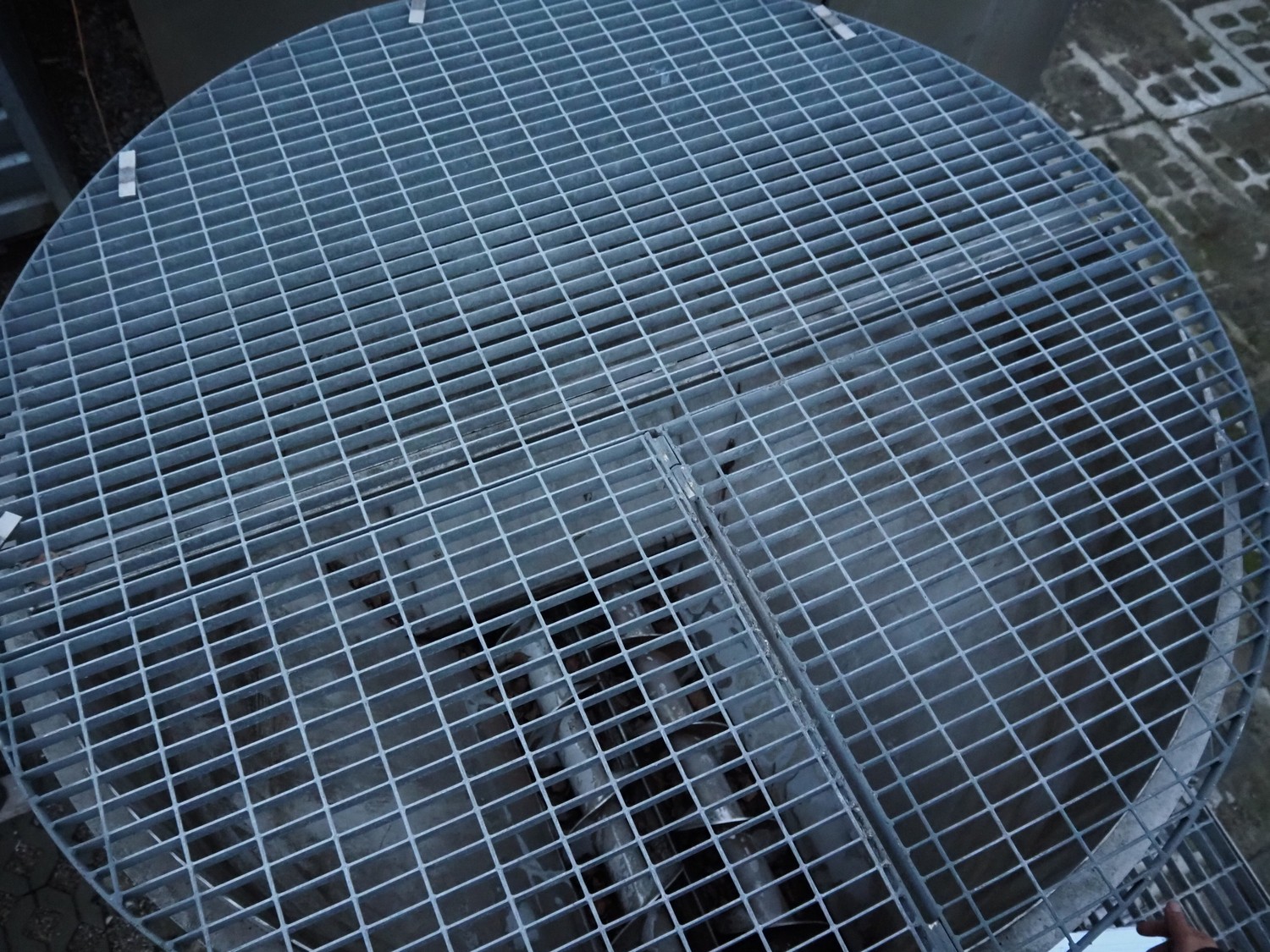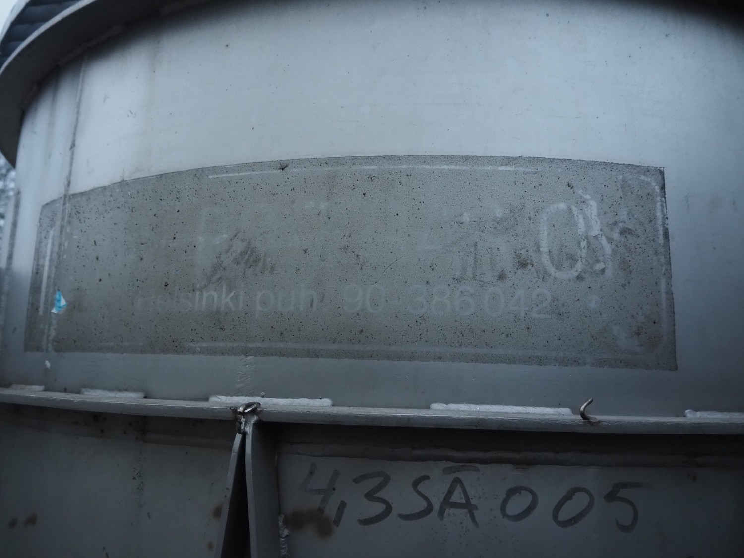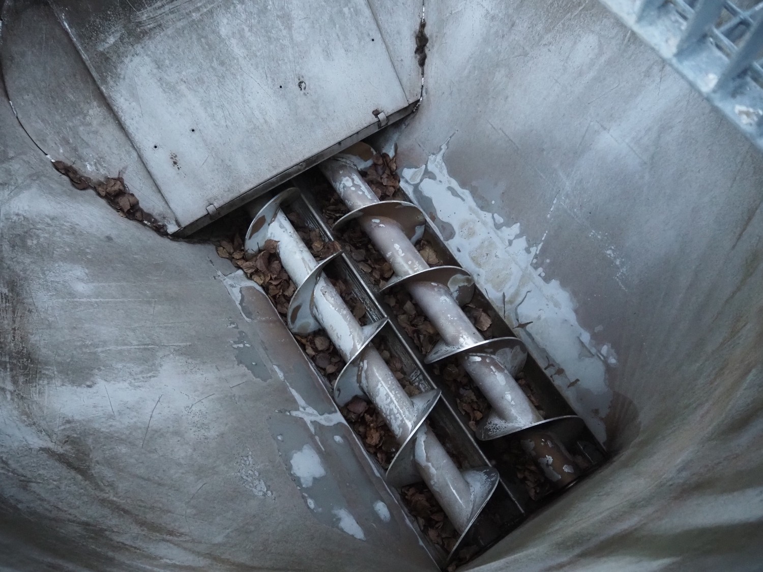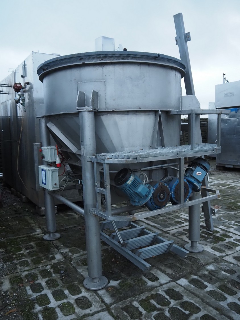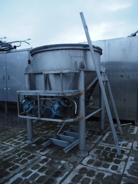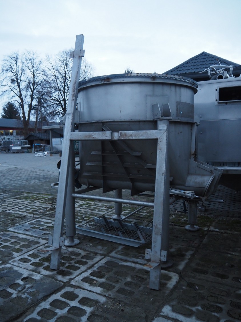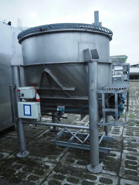 Infeed bunker with double screw, inside dimensions: Ø 1700 mm x 1300 mm, total dimensions: 2600 mm x 1850 mm x 2250 mm.