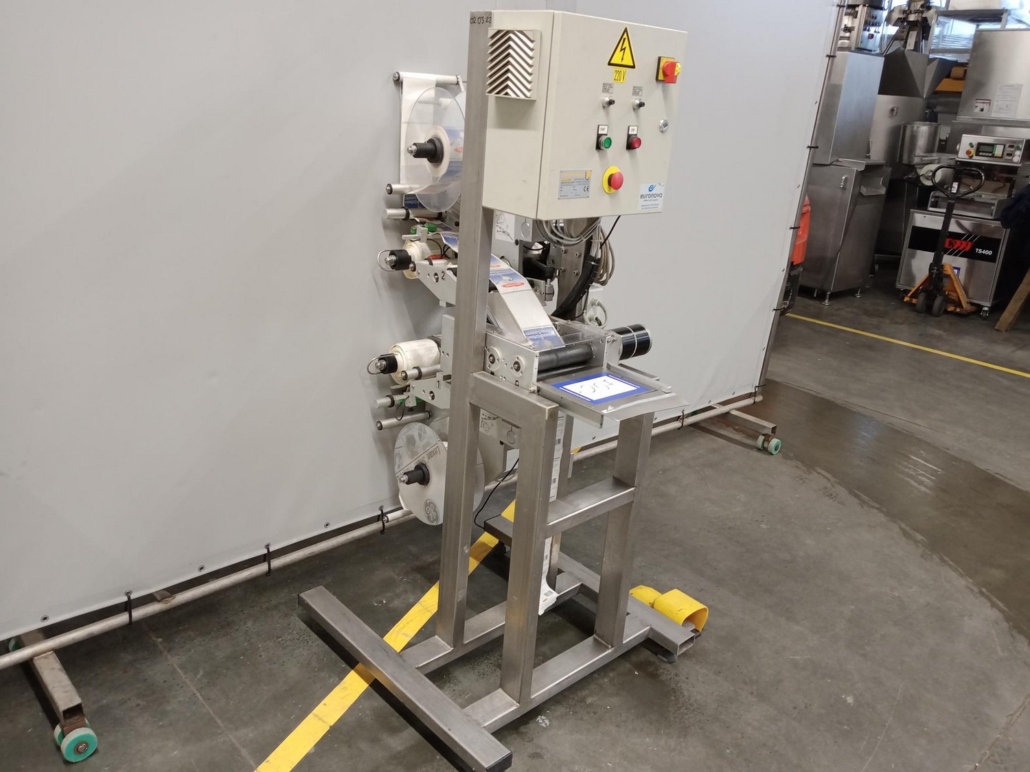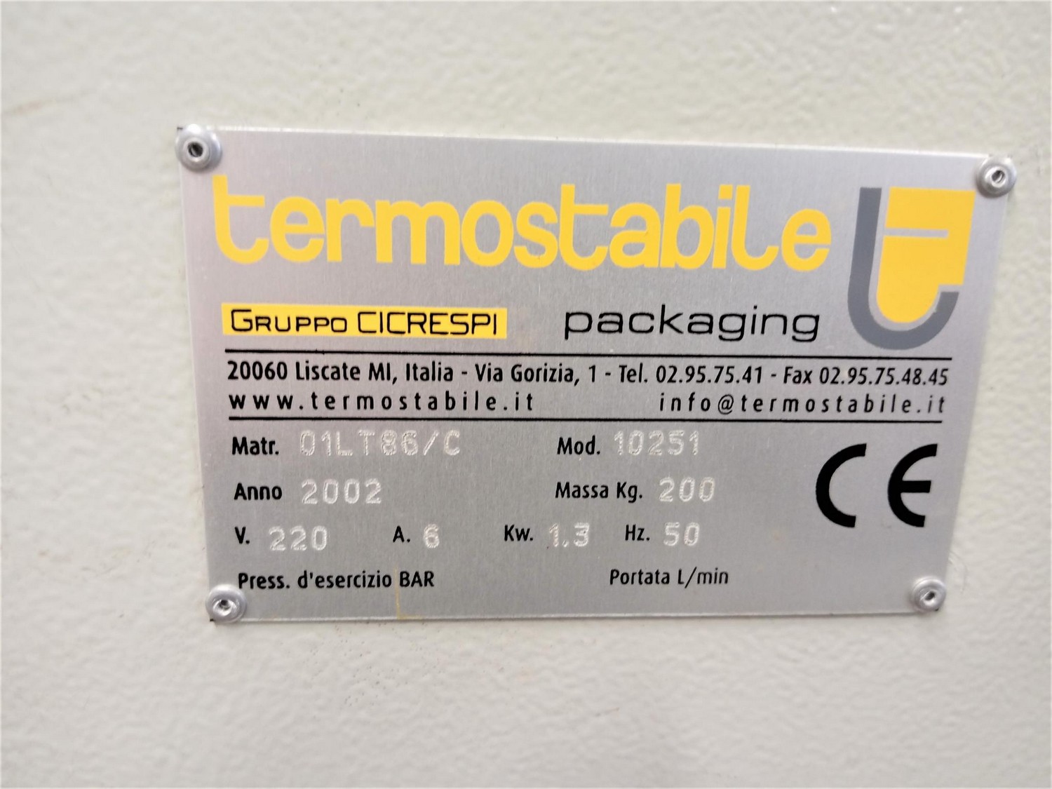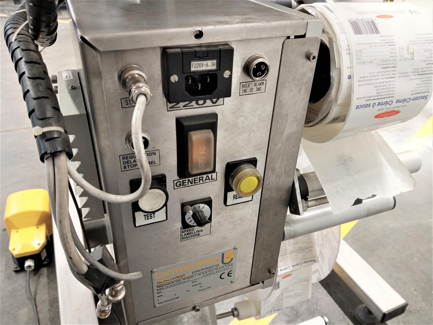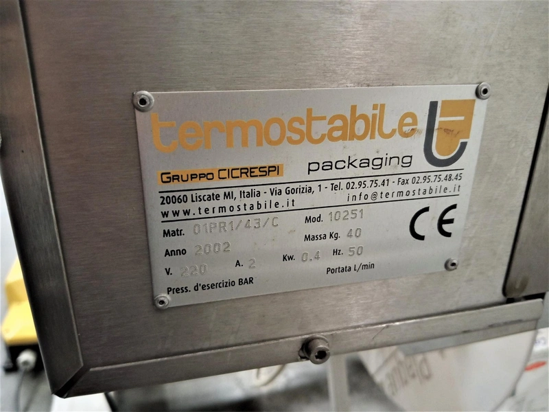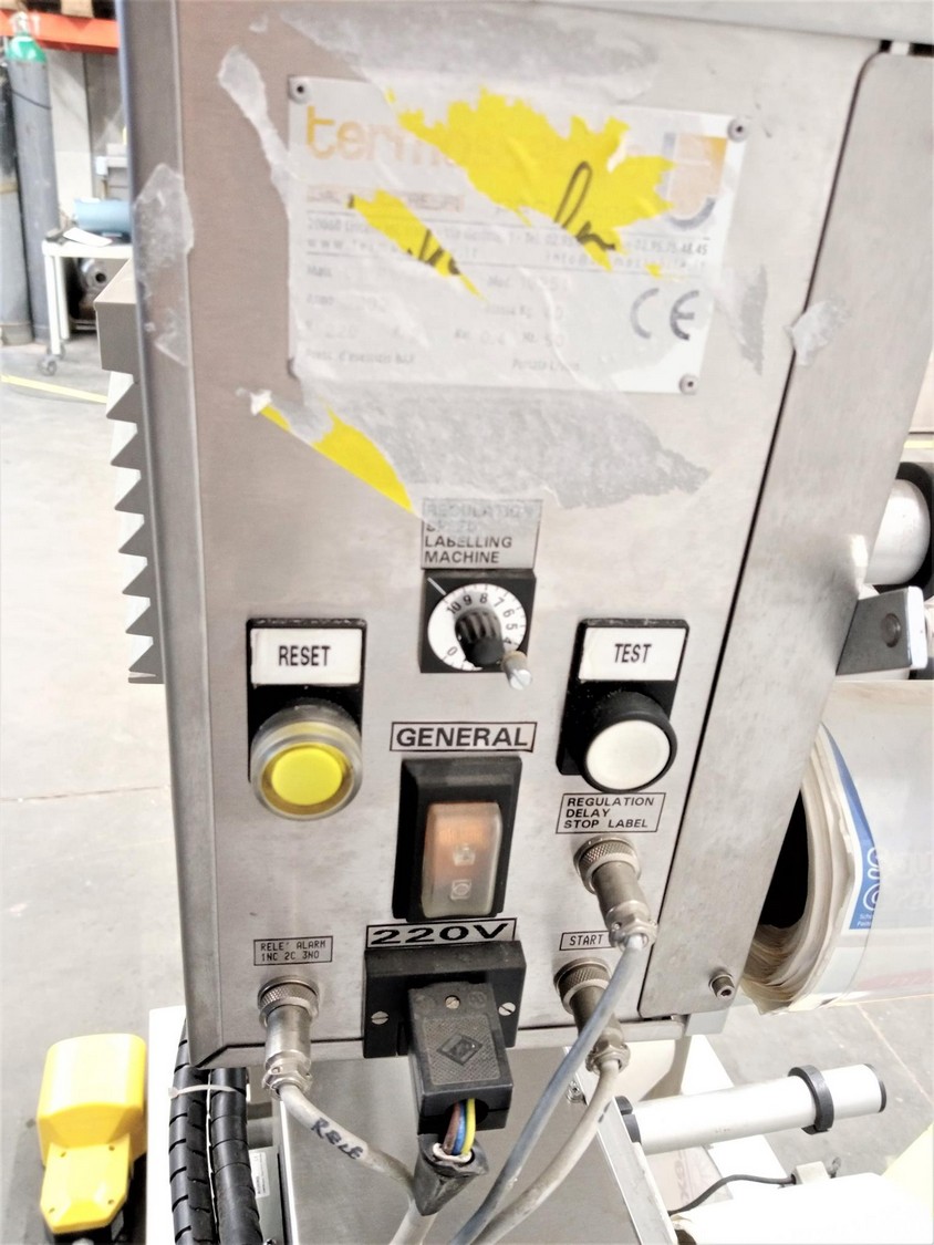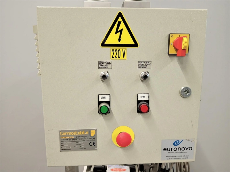 Termostabile labelling machine, model: 10251, machine number: 01LT86/C, year of production: 2002, 220 V, 50 Hz, 1.3 kW, 6 A, weight: 200 kg, dimensions: 1100 mm x 800 mm x 1900 mm.