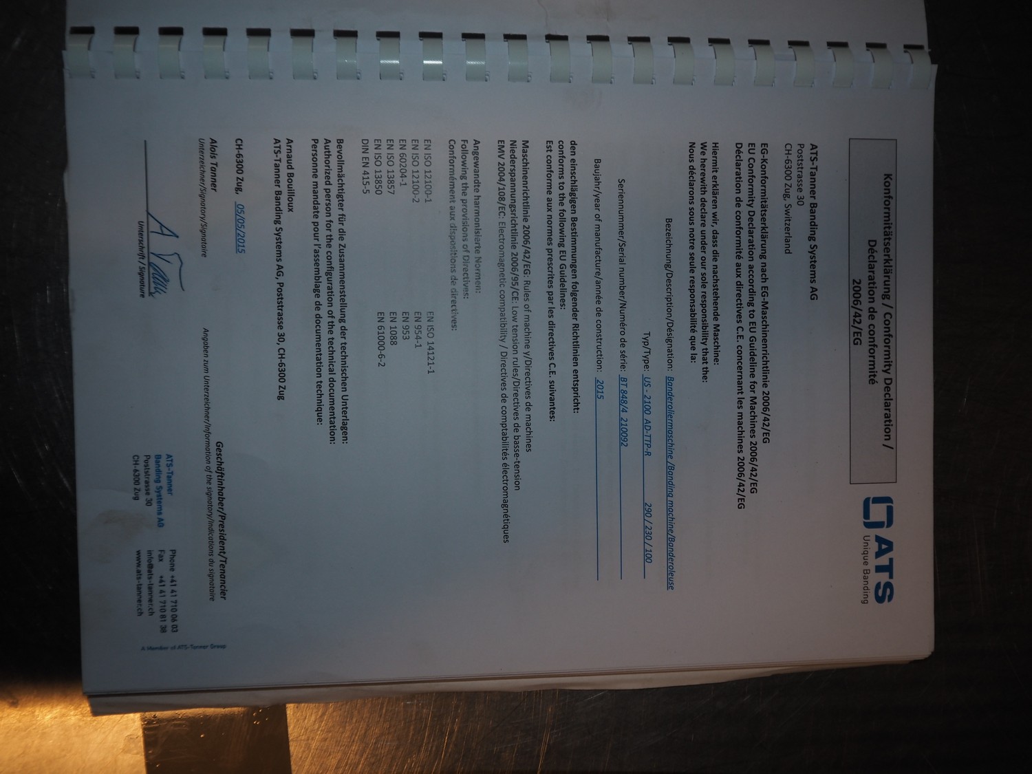 ATS-Tanner Banding Systems AG mobile strapping machine with Smart Date coding machine, model: US-2100 AD-TTP-R, serial number: BR 848/4 210092, year of construction: 2015, clearance: 300 mm x 235 mm, total dimensions: 1960 mm x 1520 mm x 1150 mm.