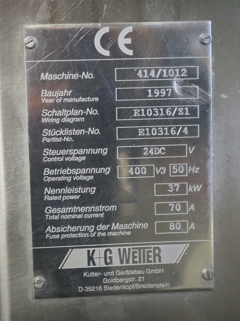 K+G Wetter mixer-grinder, machine number: 414/1012, year of construction: 1997, 400 V, 3 Ph, 50 Hz, 70 A, 37 kW, plate diameter: 160 mm, total dimensions: 1900 mm x 1150 mm x 2600 mm.