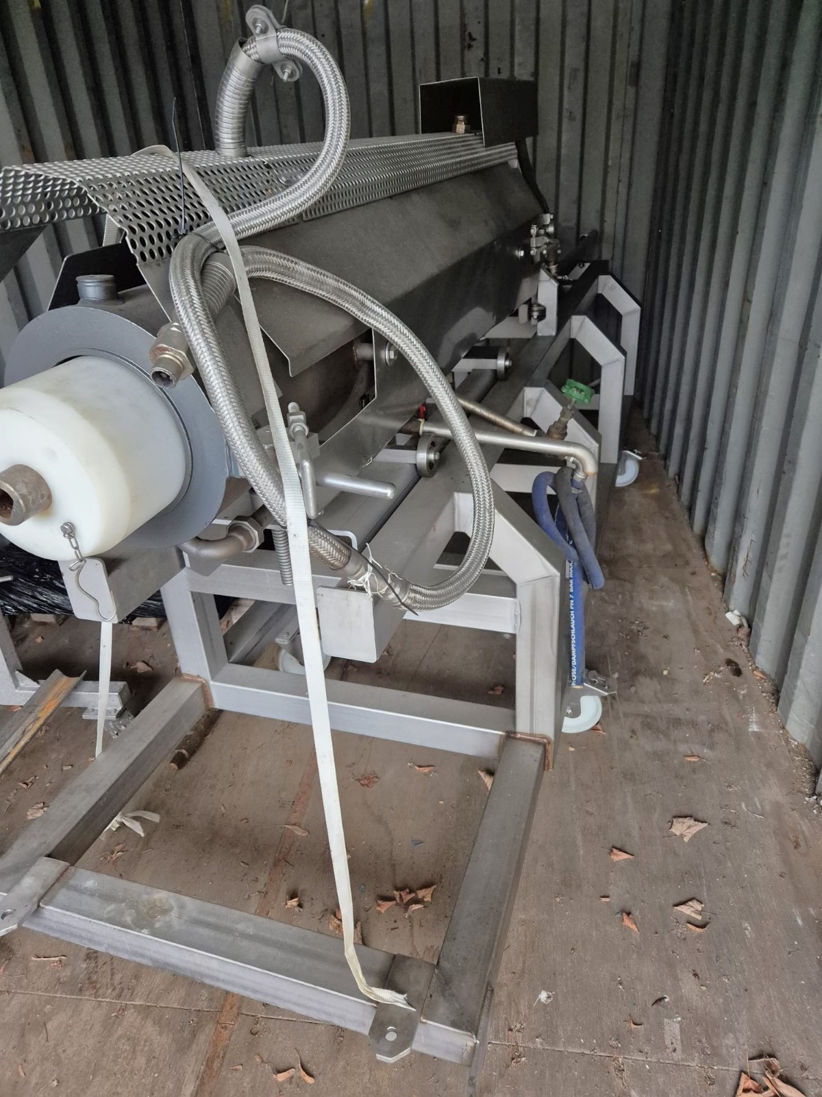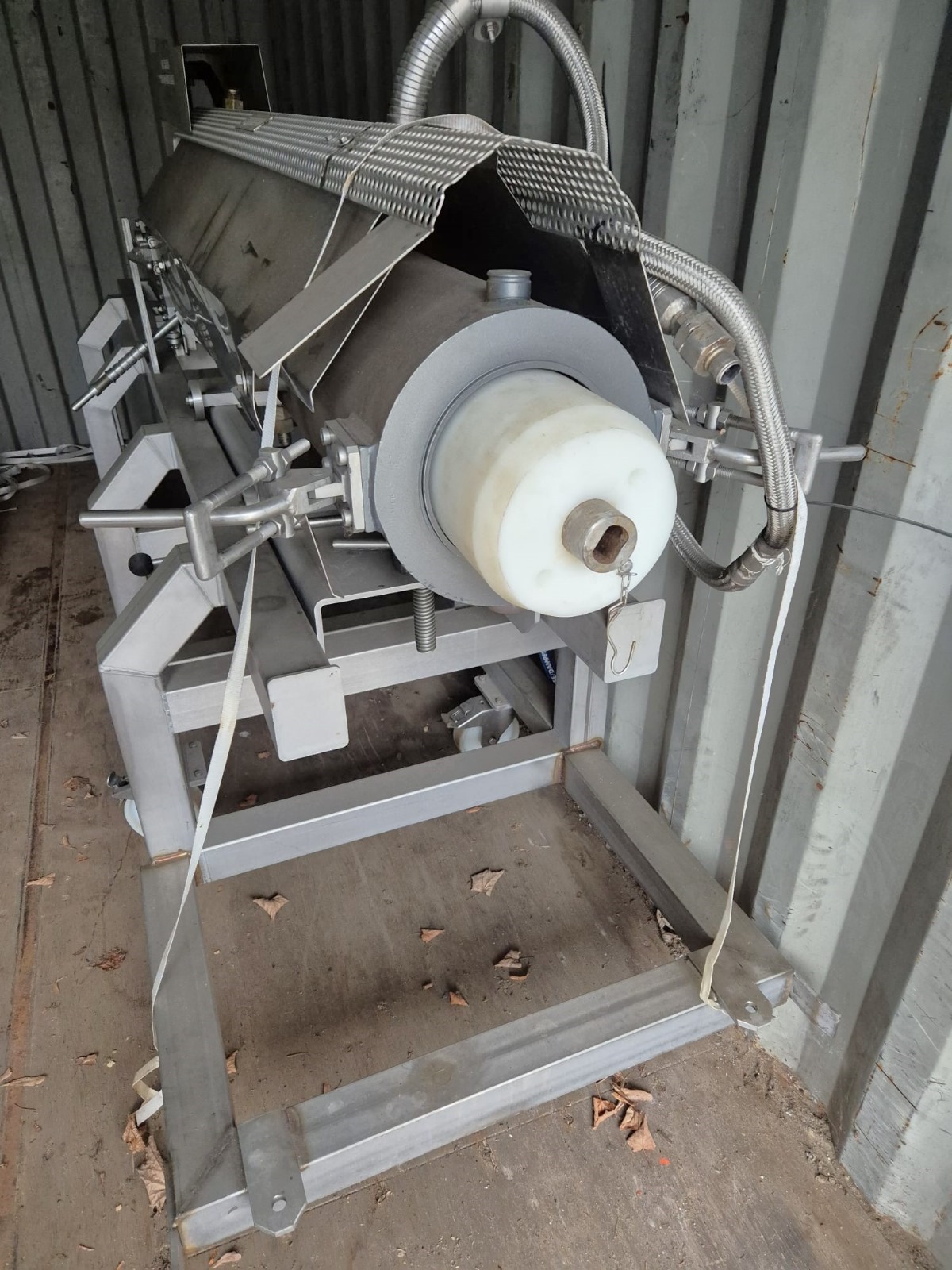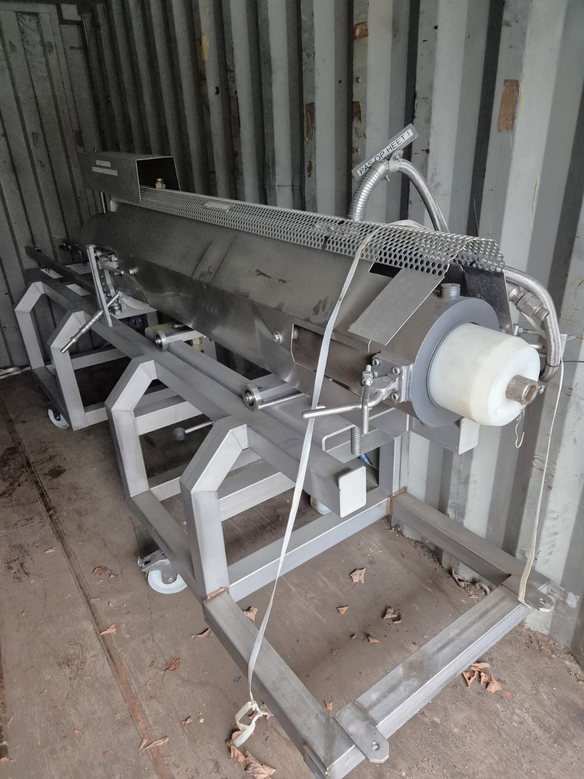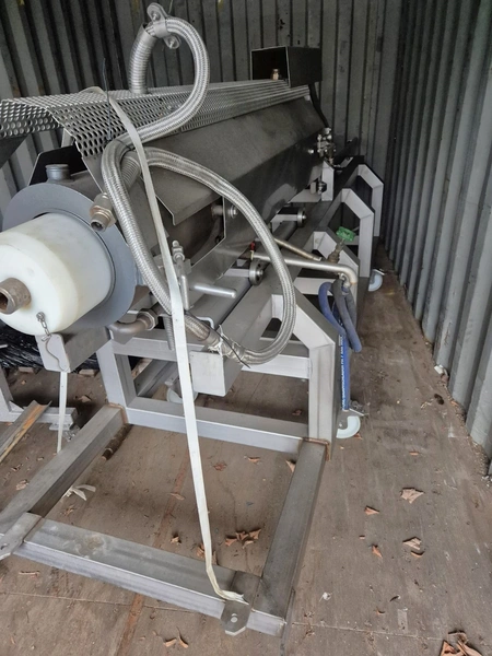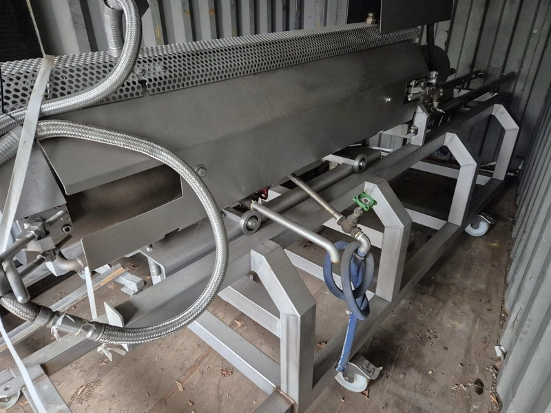 Mobile cooking screw used for Wolfking C400UNI grinder, diameter screw: 250 mm, total dimensions: 4000 mm x 900 mm x 1400 mm.