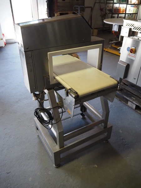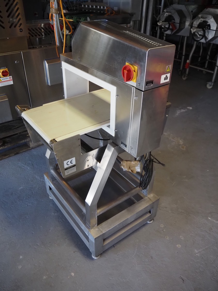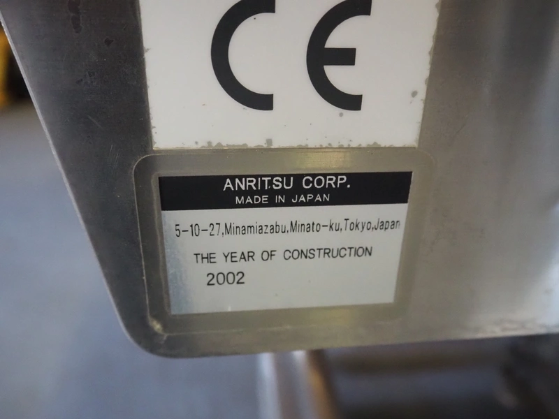 Anritsu metal detector, model: IP66, type: KD8026AW, serial number: K051367, year of construction: 2002, 100/240 VAC, 1 Ph, 50 Hz, max weight: 5 kg, plastic belt, belt width: 350 mm, clearance: 450 mm x 175 mm, total dimensions: 800 mm x 830 mm x 1350 mm.