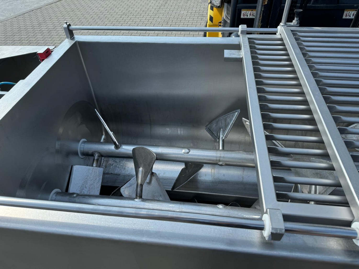 Velati double shaft paddle mixer, type: M5/2R, capacity: 1100 liter, 400 V, 3 Ph, 50 Hz, inside dimensions: 2000 mm x 860 mm x 700 mm, total dimensions: 3000 mm x 1150 mm x 1870/2270 mm.