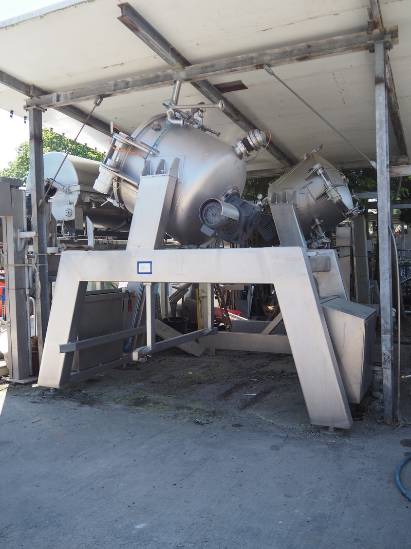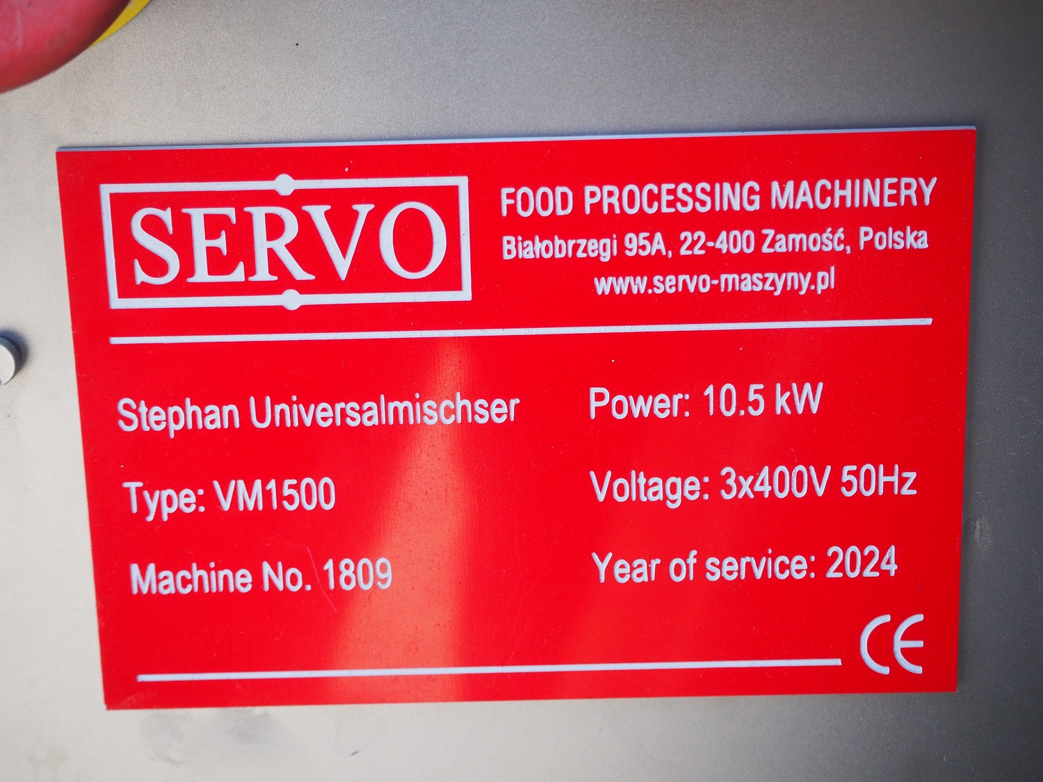 Stephan universal mixer, type: VM1500, machine number: 1809, year of service: 2024, volume: 1500 liter, 400 V, 3 Ph, 50 Hz, 10.5 kW, s/s double jacketed tank with mixer, cooling/heating option, Rietschle vacuum pump, capacity: 21m3/h, power 1.5 kW, Schema Hydraulik pump, power: 1.5 kW, new Mixer Indu IMAX 500 touch control panel, total dimensions: 4000 mm x 2150 mm x 3100 mm.