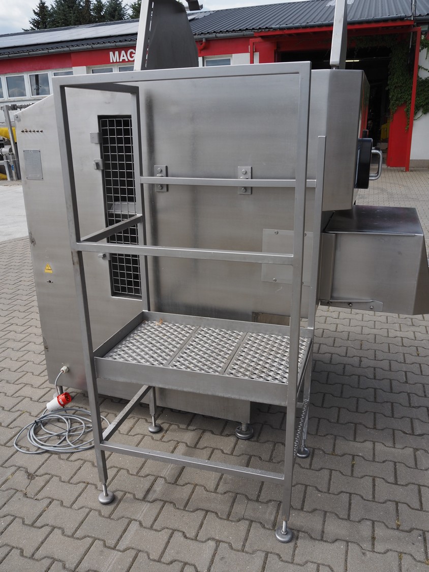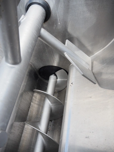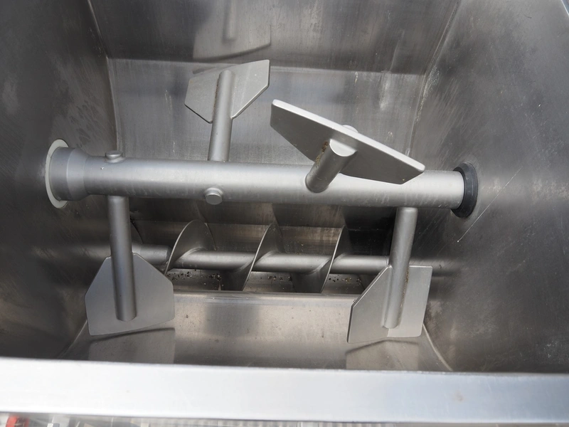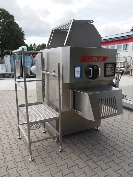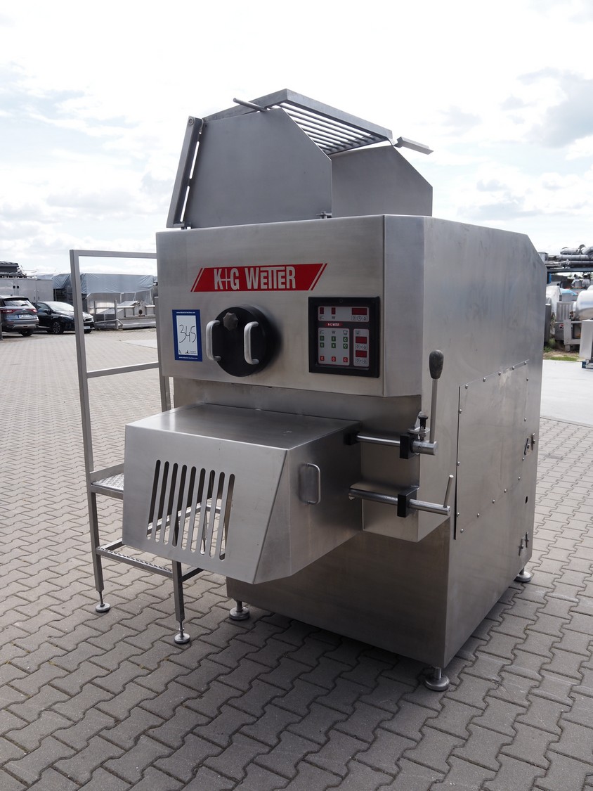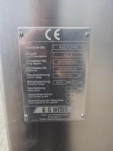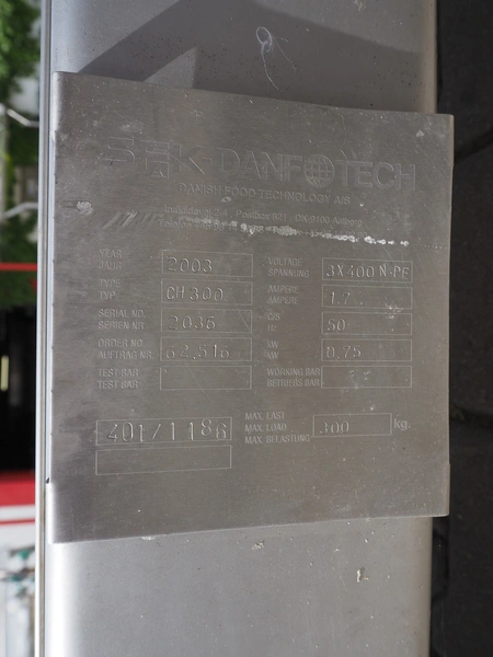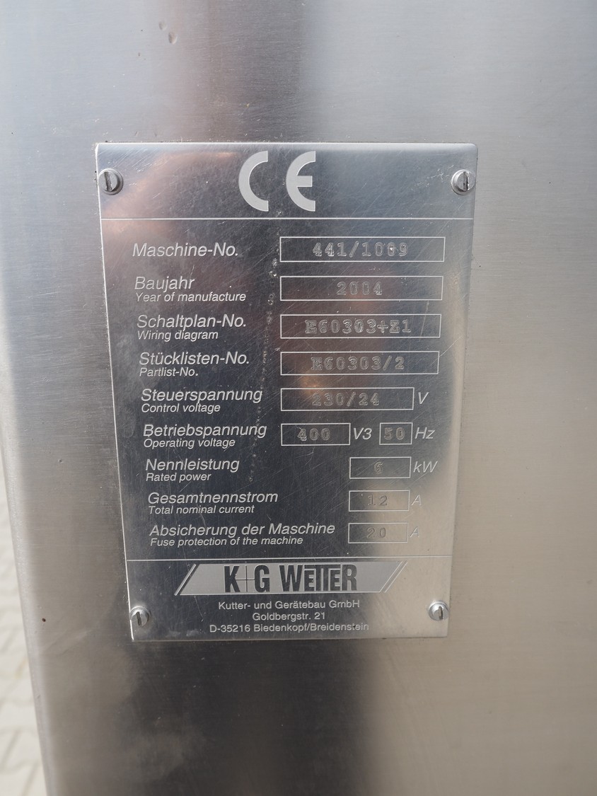 K+G Wetter paddle mixer, type: M 500, machine number: 441/1009, year of construction: 2004, 400 V, 50 Hz, 12 A, 6 kW, volume: 530 liter, capacity: 350 kg, weight: 1400 kg, dimensions: 2130 mm x 1430 mm x 2260 mm. Including SFK-Danfotech lifter for 200 liter meat bins, type: CH300, serial number: 2036, year of construction: 2003, 400 V, 3 Ph, 50 Hz, 1.7 A, 0.75 kW, lifting height: 2140 mm, total dimensions lift: 1150 mm x 1040 mm x 2900 mm and s/s platform, dimensions platform: 860 mm x 610 mm x 1770 mm.