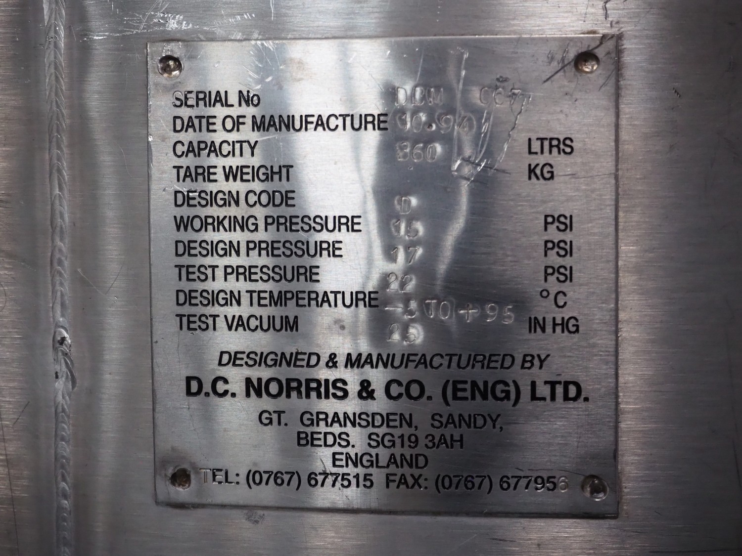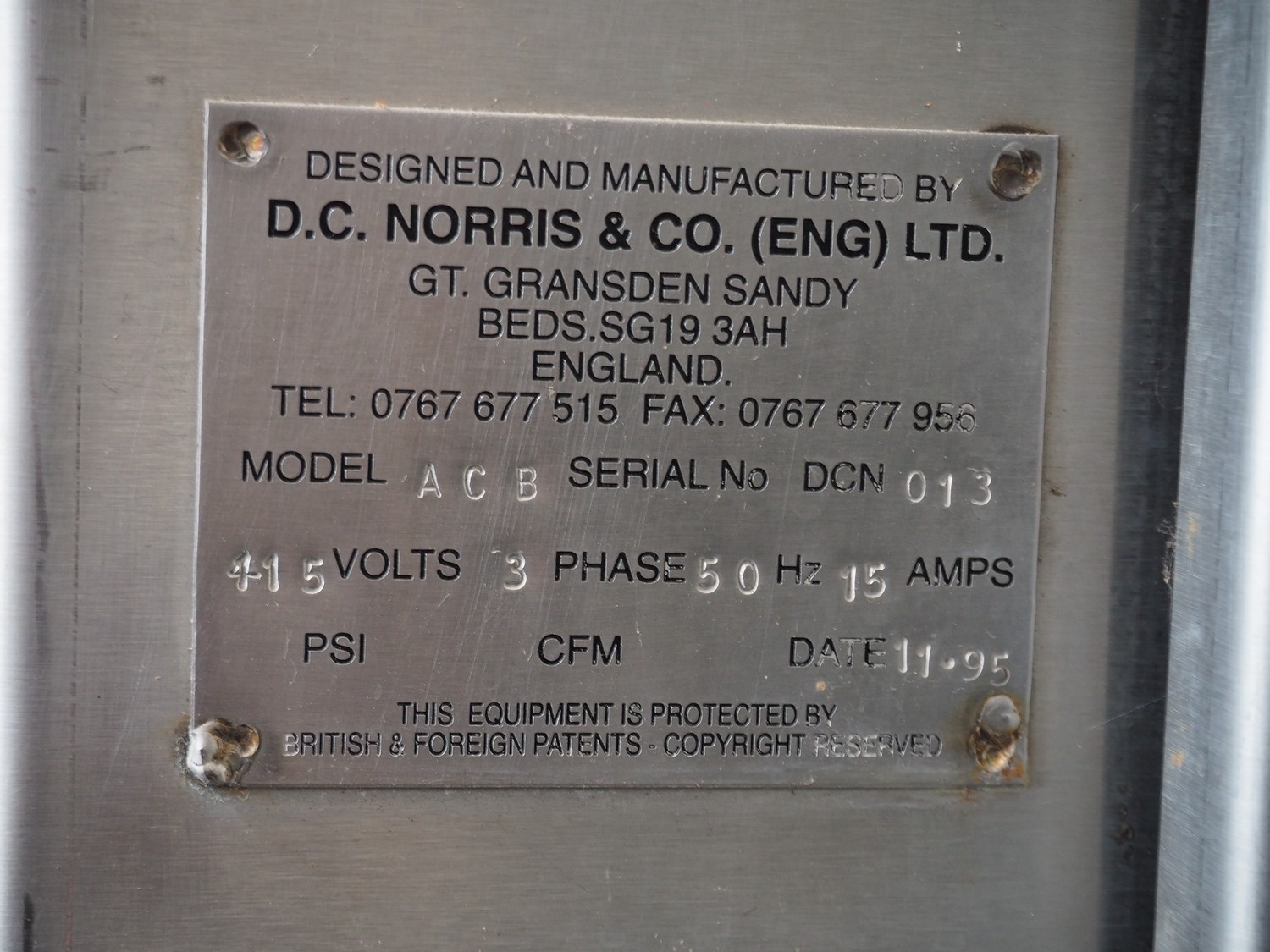 D.C. Norris & Co. (ENG) Ltd. mixing installation, model: ACB, serial number: 013, year of construction: 1995, 415 V, 3 Ph, 50 Hz, volume tank: 360 kg, dimensions: 1600 mm x 1600 mm x 2700 mm.