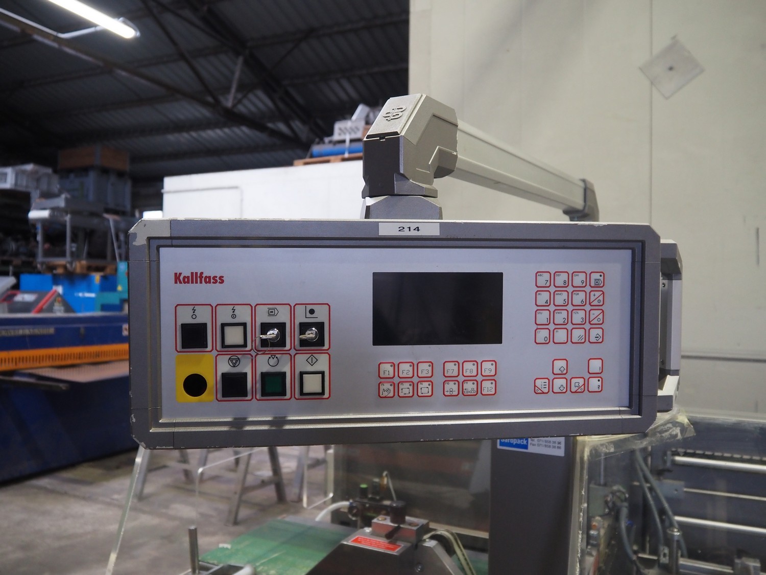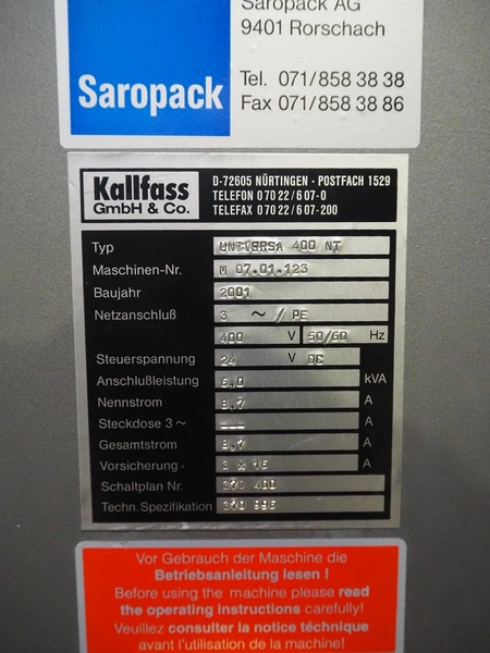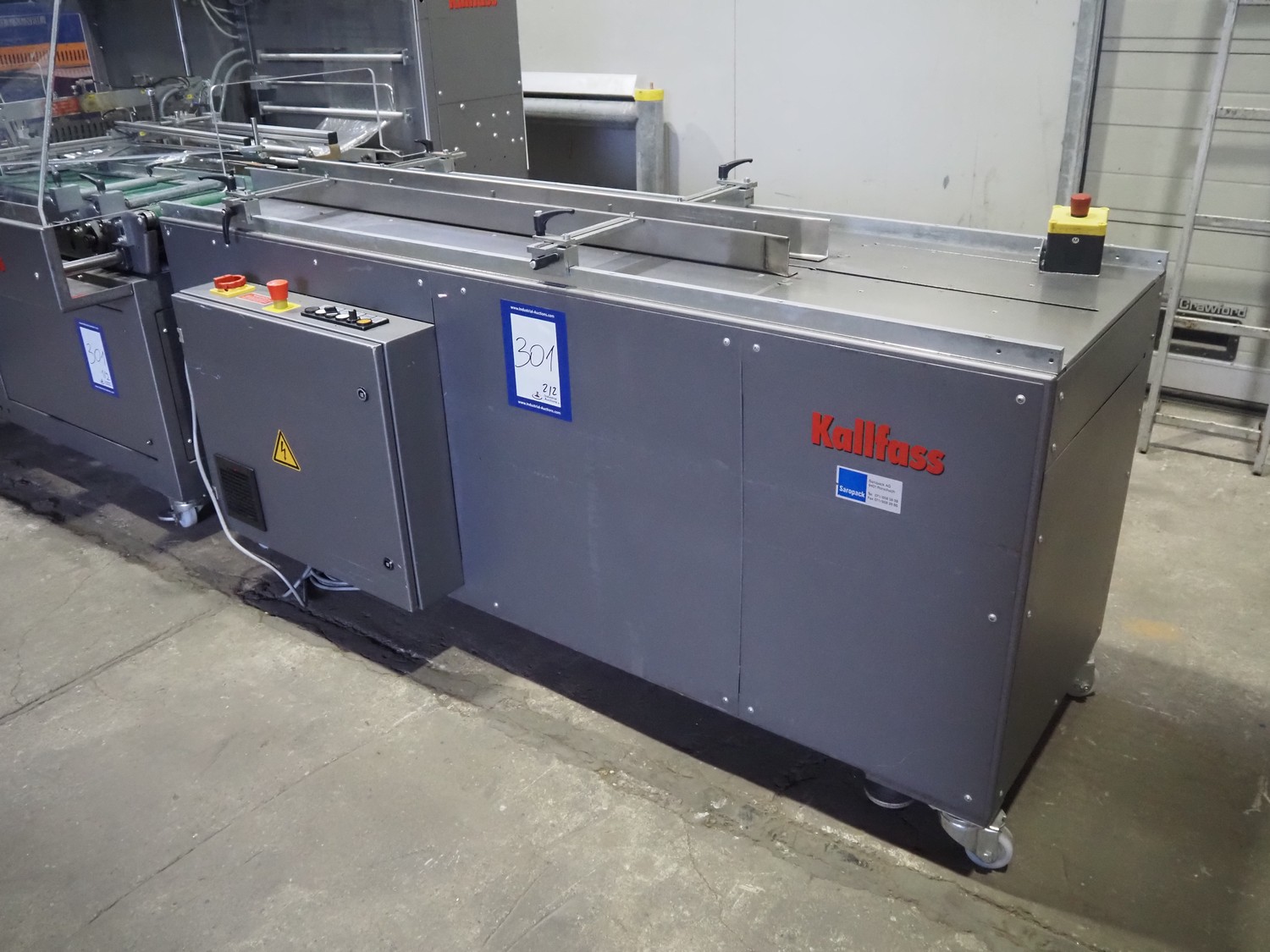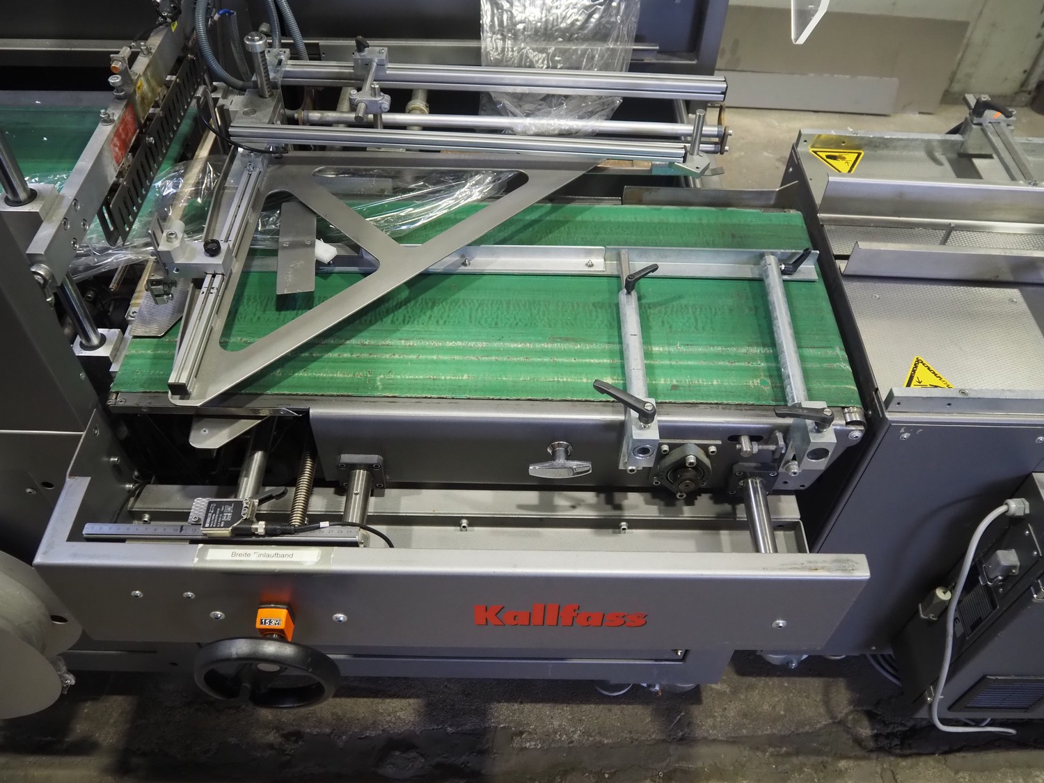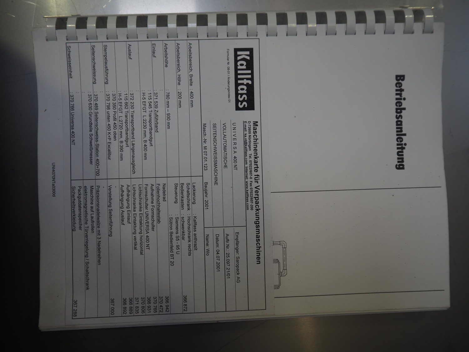Kallfass Verpackungsmaschinen automatic side sealer, type: UNIVERSA 400 NT, machine number: M 07.01.123, year of construction: 2001, 400 V, 3 Ph, 50/60 Hz, 8.7 A, plastic belt, belt width: 400 mm, film width: 320 mm, seal length: 450 mm, total dimensions: 4100 mm x 1700 mm x 1800 mm.