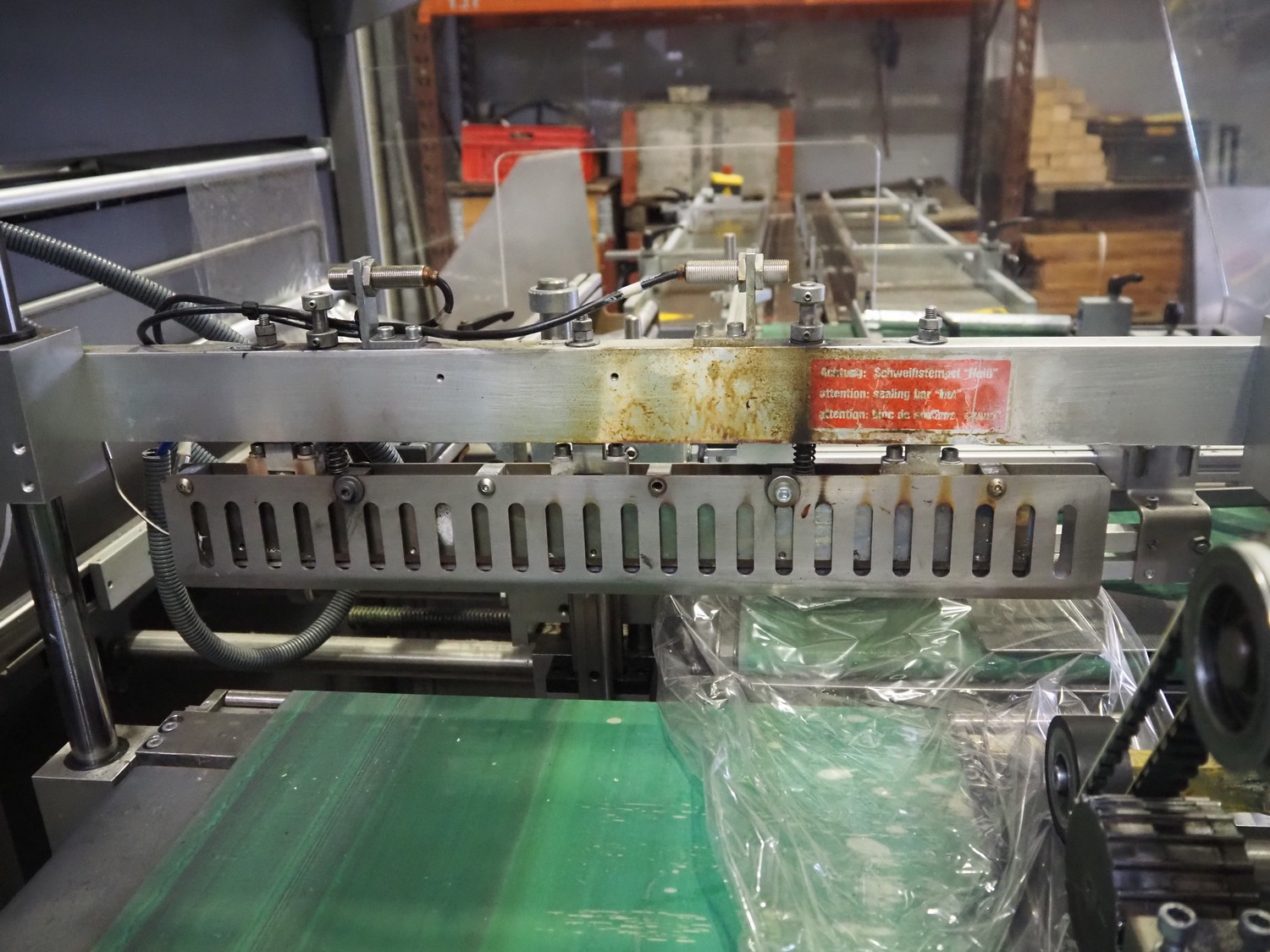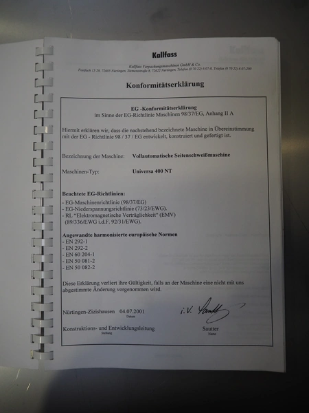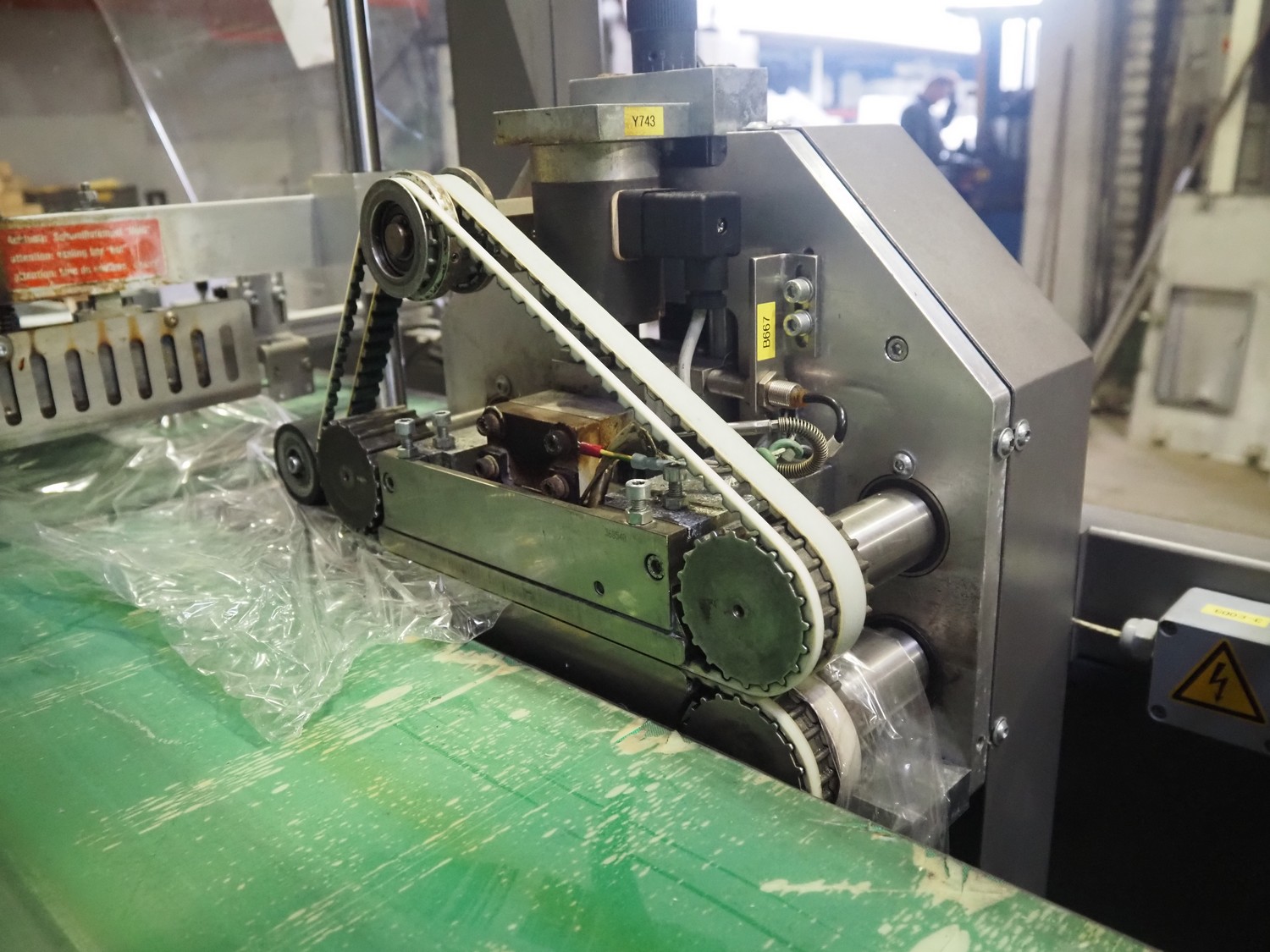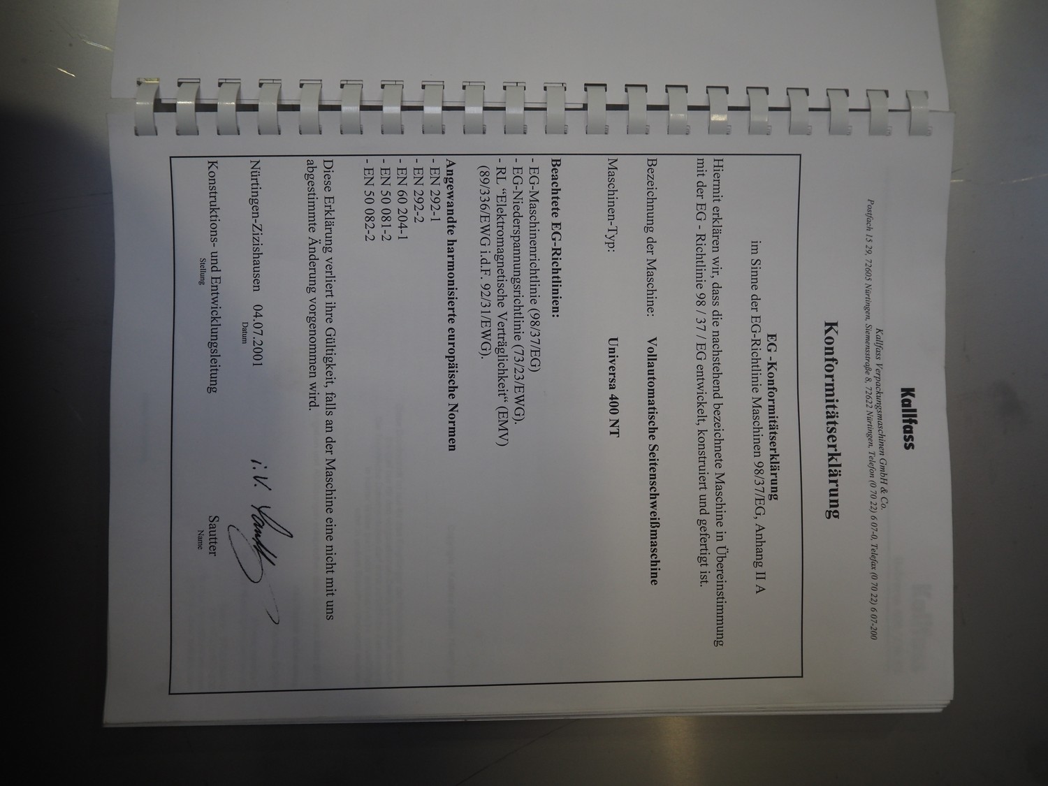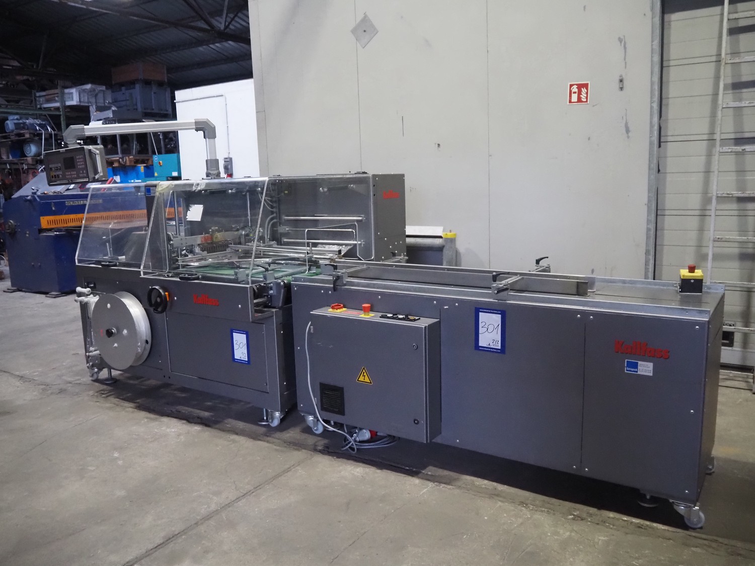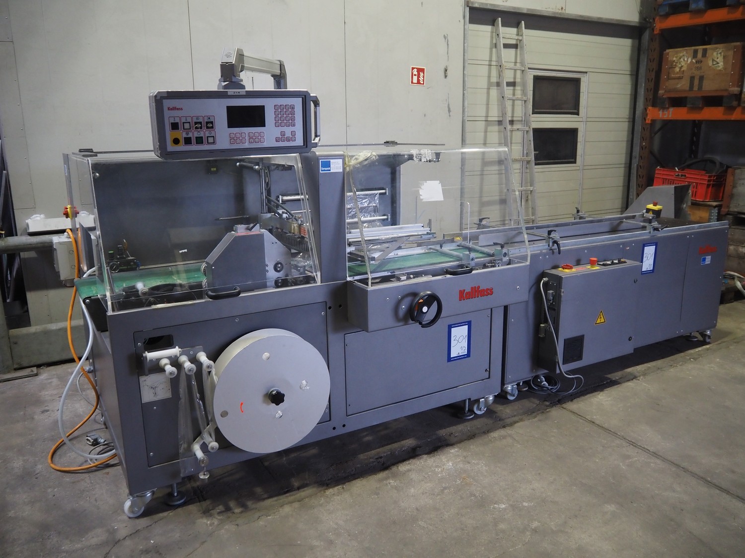 Kallfass Verpackungsmaschinen automatic side sealer, type: UNIVERSA 400 NT, machine number: M 07.01.123, year of construction: 2001, 400 V, 3 Ph, 50/60 Hz, 8.7 A, plastic belt, belt width: 400 mm, film width: 320 mm, seal length: 450 mm, total dimensions: 4100 mm x 1700 mm x 1800 mm.