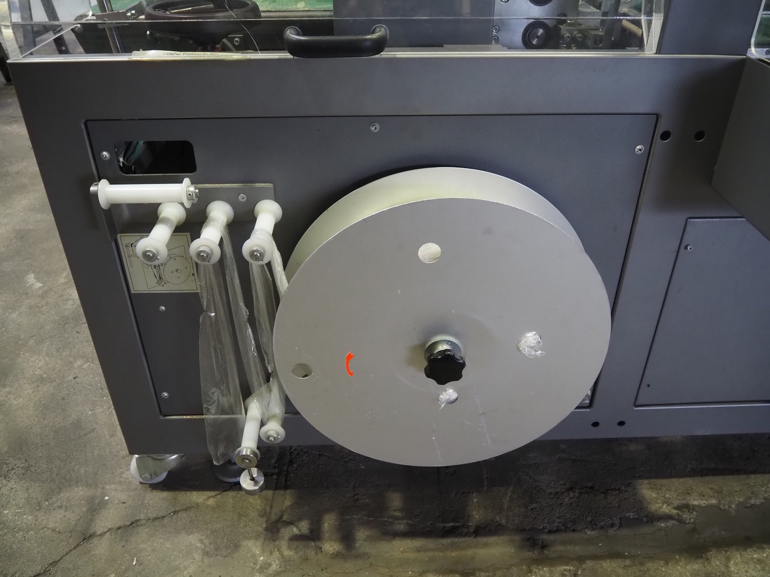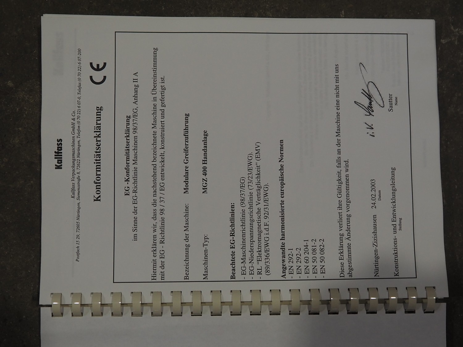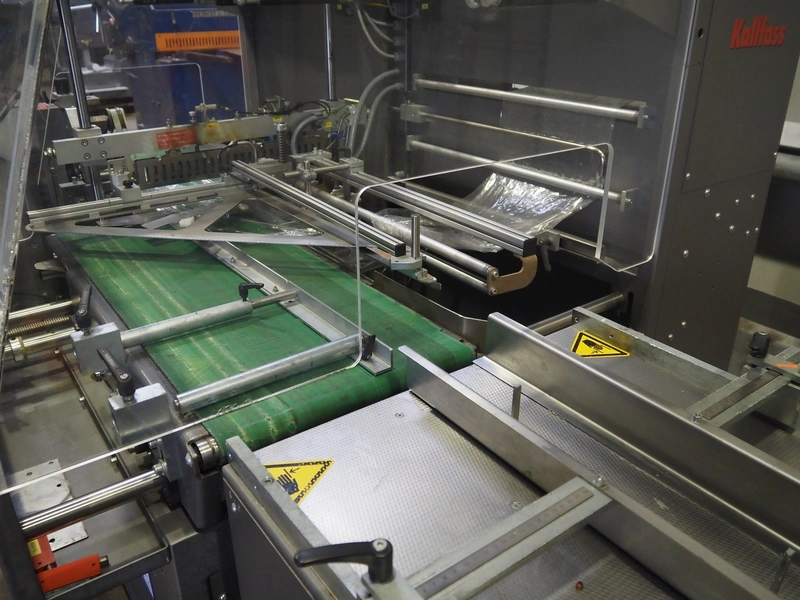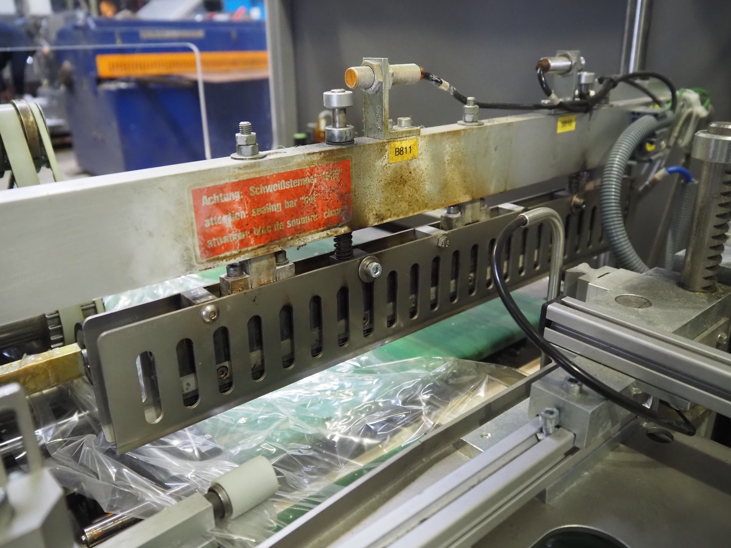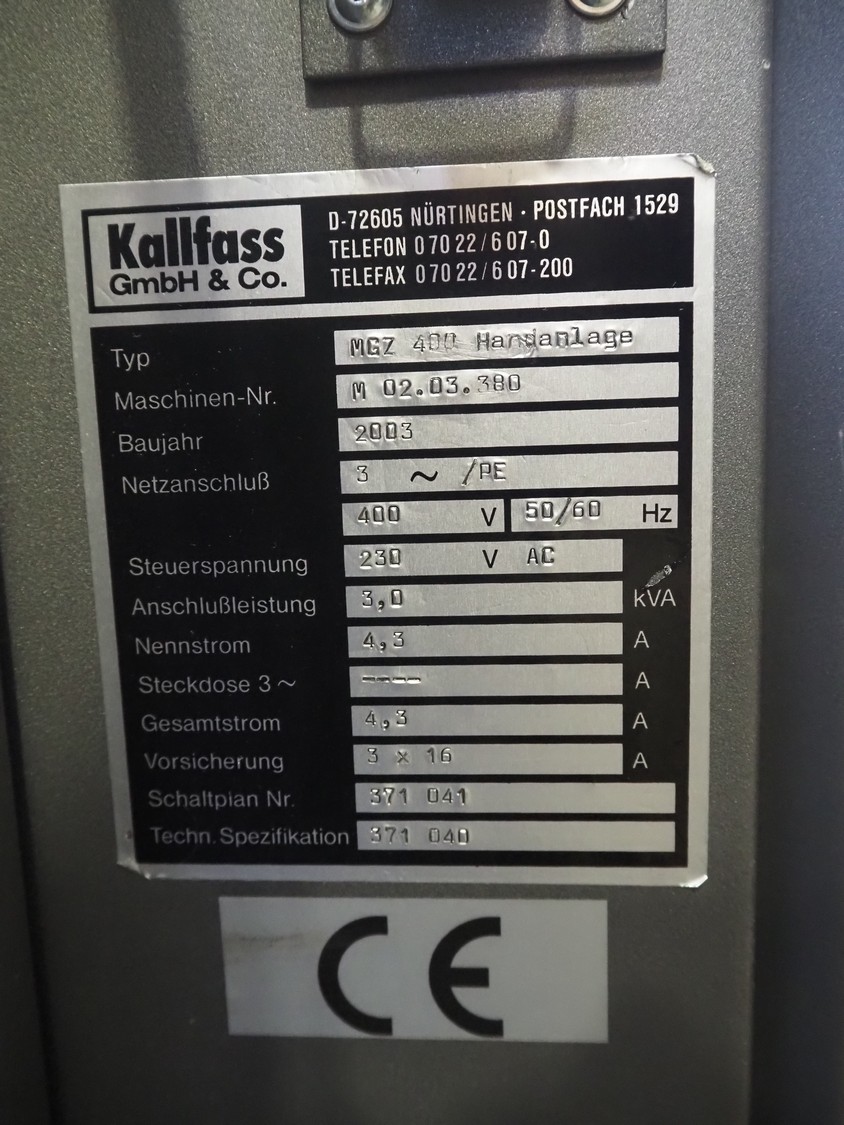 Kallfass Verpackungsmaschinen automatic side sealer, type: UNIVERSA 400 NT, machine number: M 07.01.123, year of construction: 2001, 400 V, 3 Ph, 50/60 Hz, 8.7 A, plastic belt, belt width: 400 mm, film width: 320 mm, seal length: 450 mm, total dimensions: 4100 mm x 1700 mm x 1800 mm.