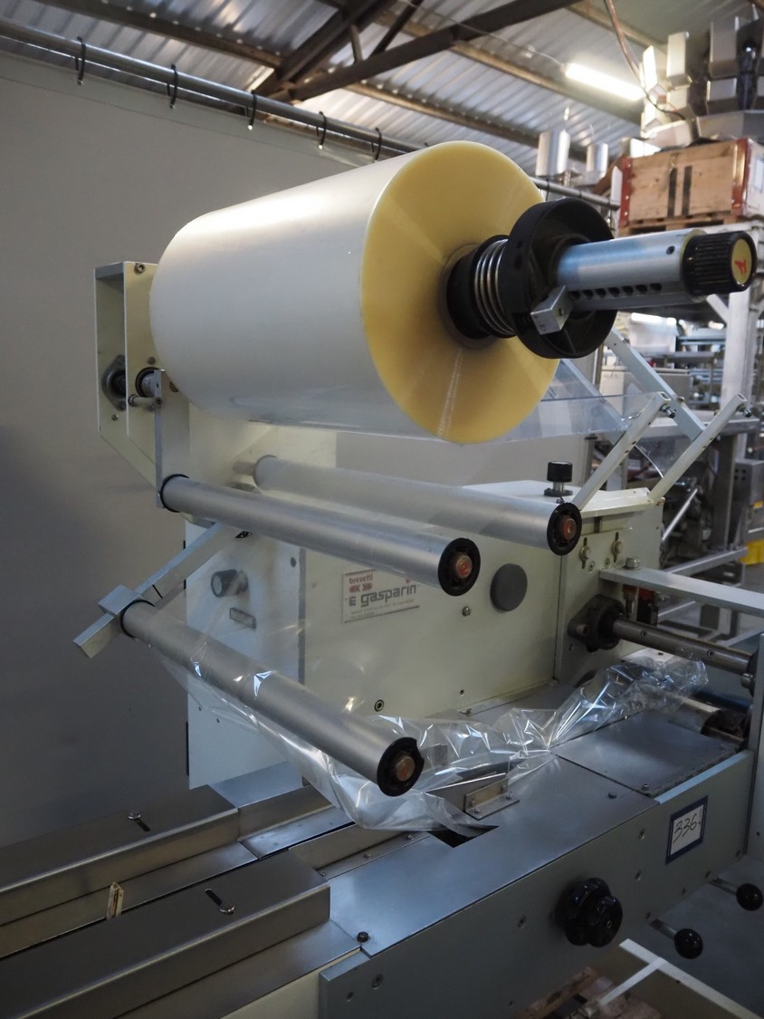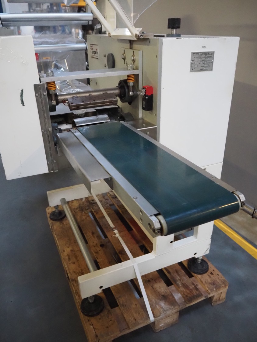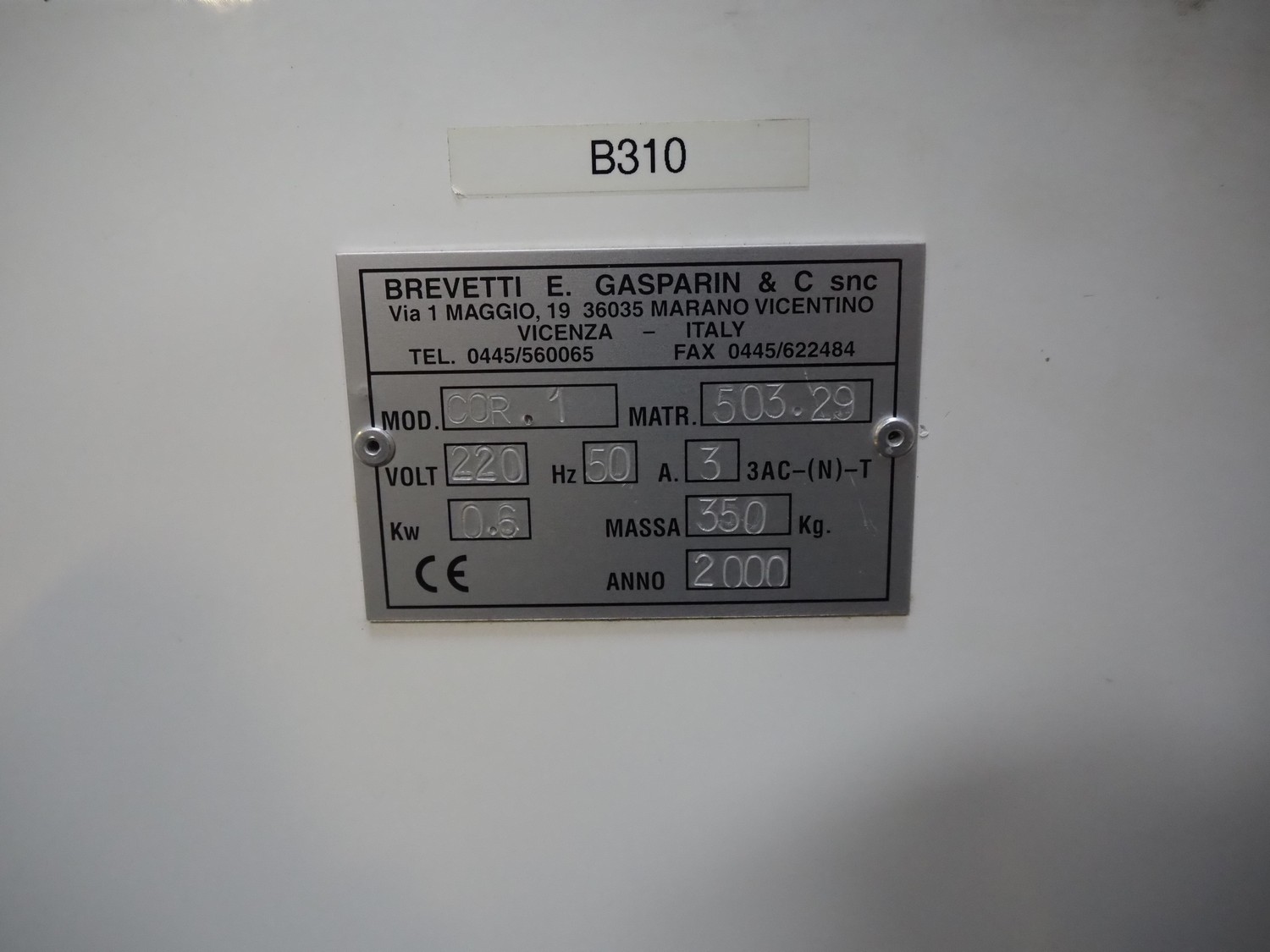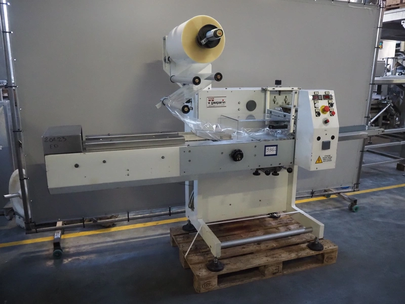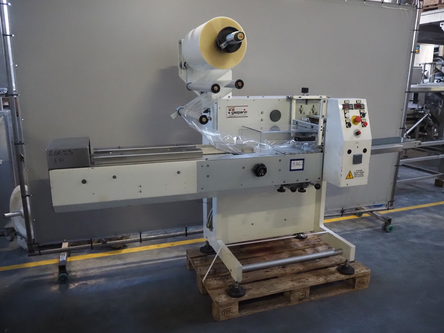 Brevetti E. Gasparin & C snc flowpacker, model: COR.1, serial number: 503.29, year of construction: 2000, 220 V, 3 Ph, 50 Hz, 3 A, 0.6 kW, weight: 350 kg, film width: 400 mm, seal length: 200 mm, plastic belt, belt width: 180 mm, total dimensions: 2500 mm x 1050 mm x 1660 mm.