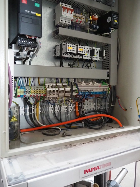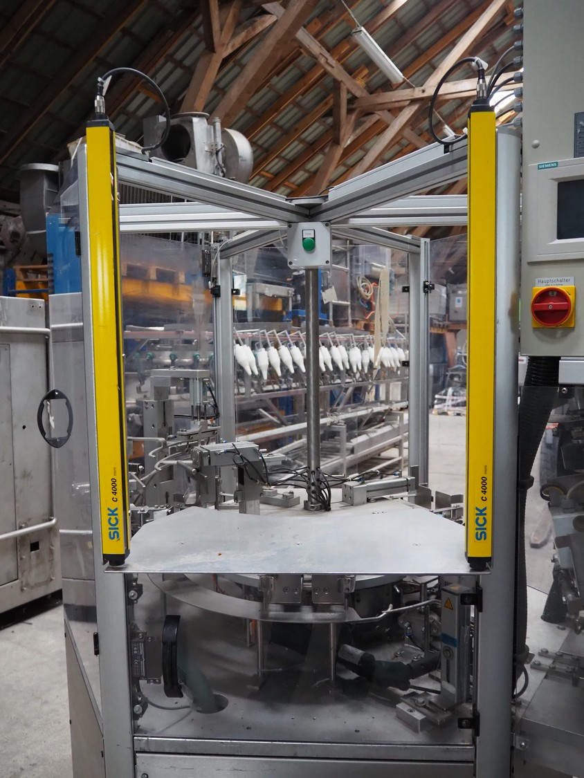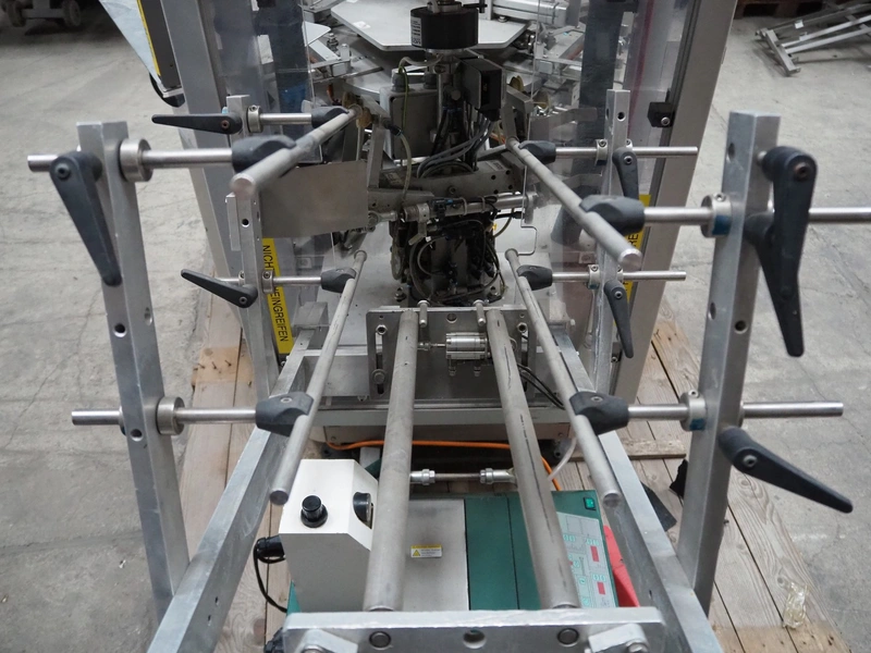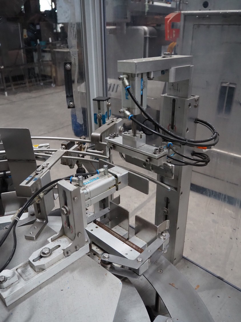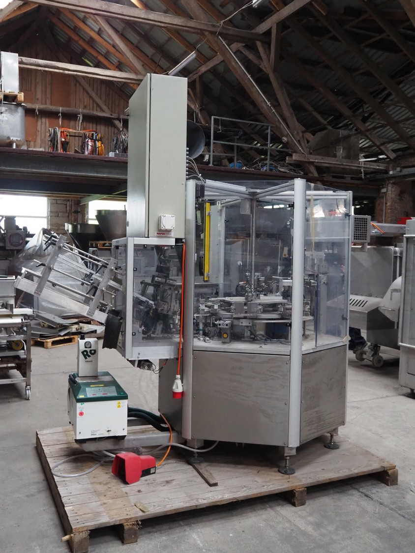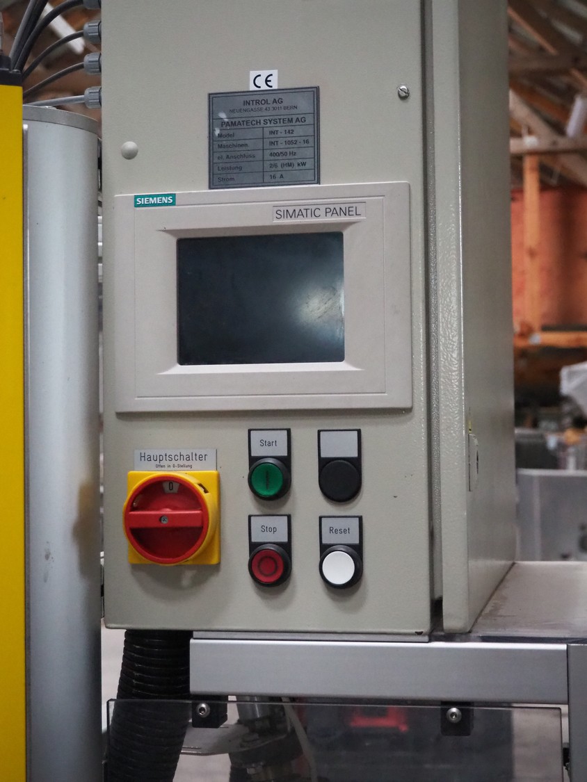 Pamatech System AG pouch filling machine, model: INT-142, machine number: INT-1052-16, 400 V, 50 Hz, 16 A, 2/6 kW, Robatech glue unit, dimensions: 2300 mm x 1450 mm x 2420 mm.