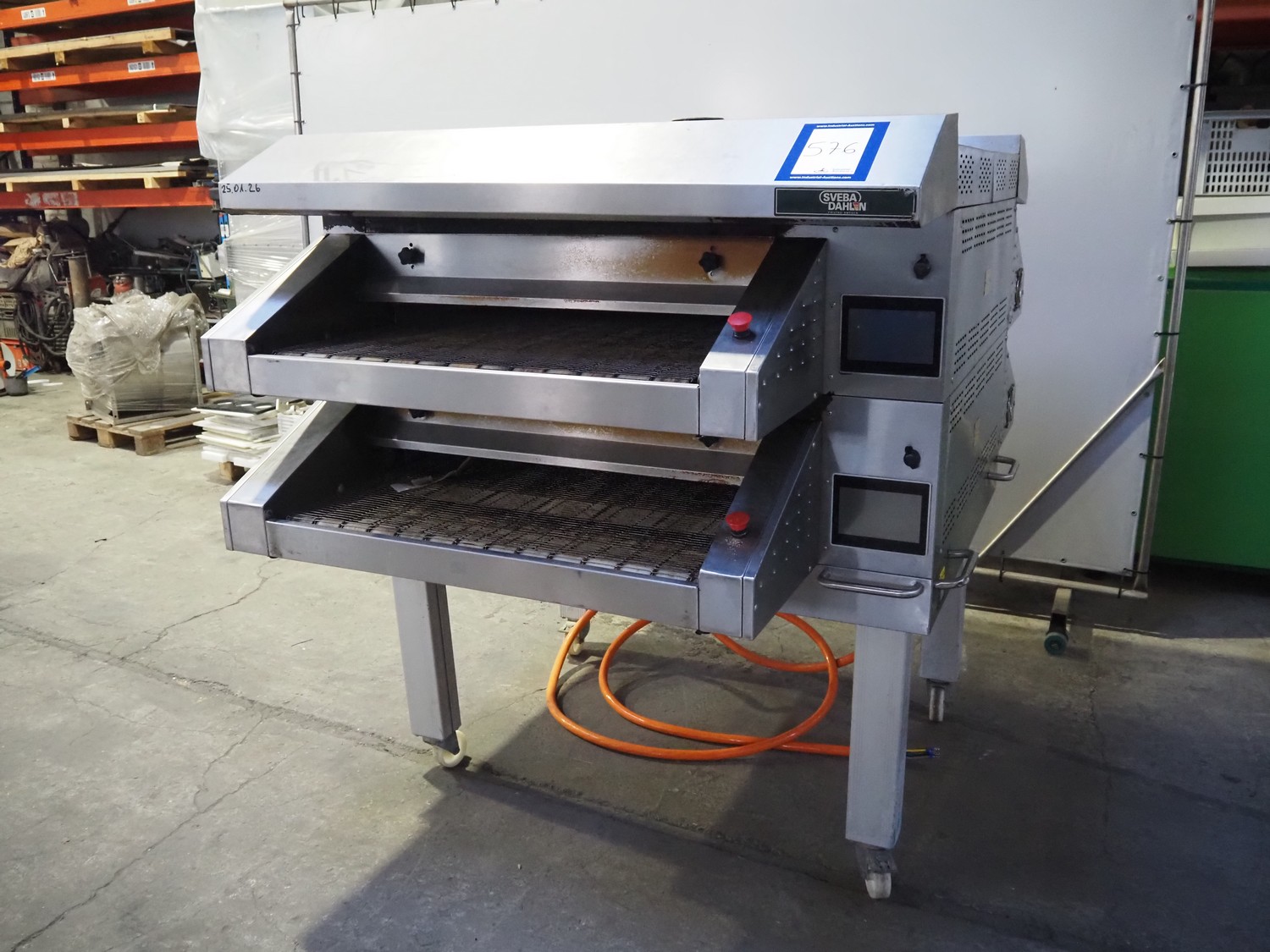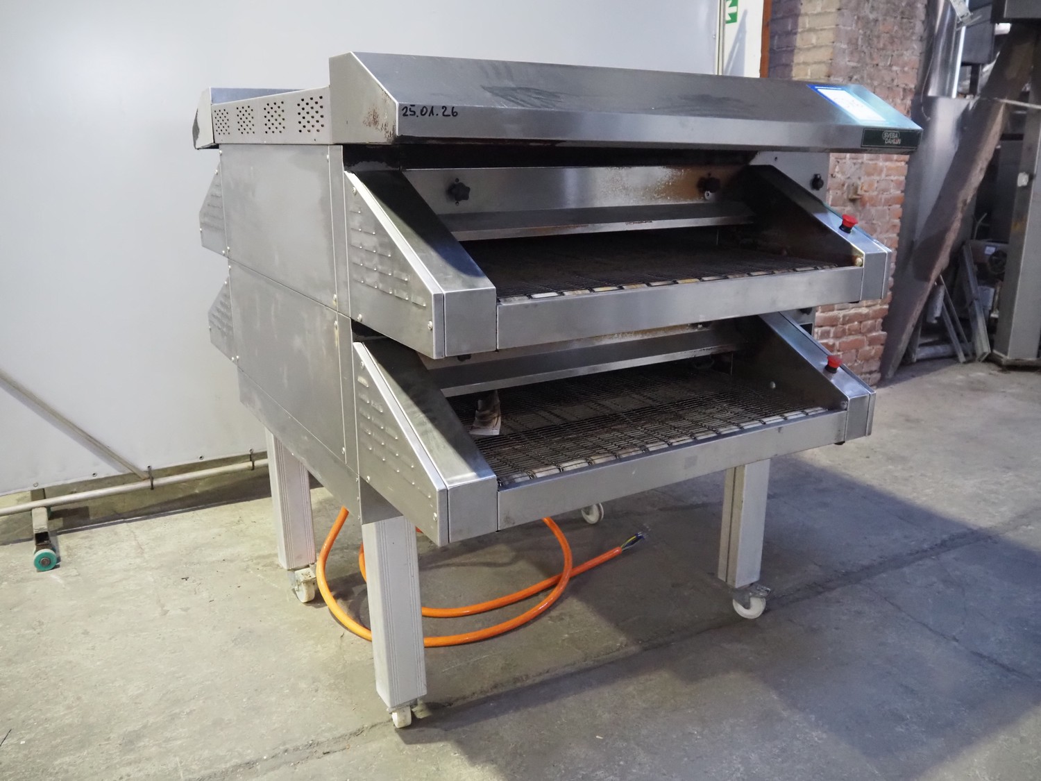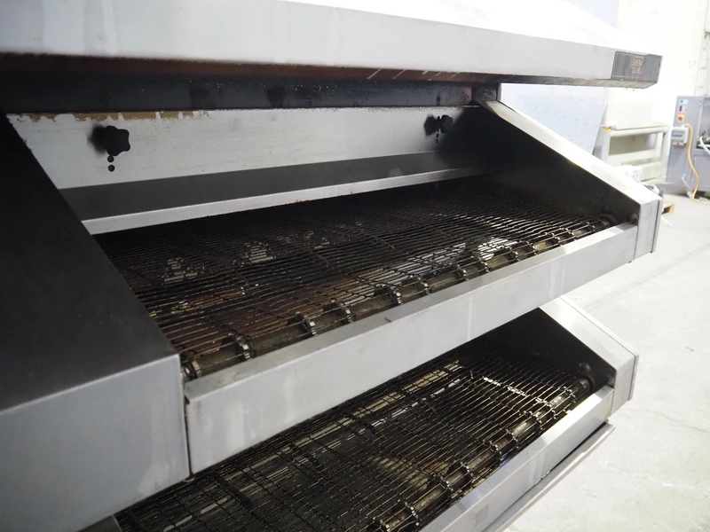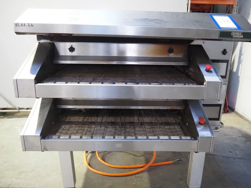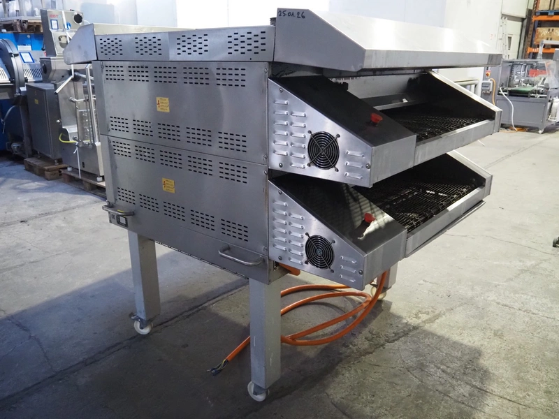 Sveba Dahlen AB mobile double stacked pizza oven, model number: TP-12, serial number: M230165/1243, 400 V, 3 Ph, 50/60 Hz, 18 kW, s/s mesh belt, belt width: 900 mm, clearance: 950 mm x 70 mm, total dimensions: 1400 mm x 1900 mm x 1650 mm.