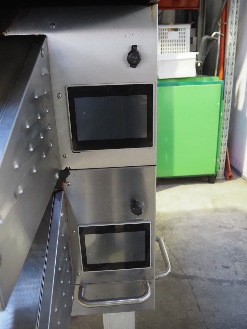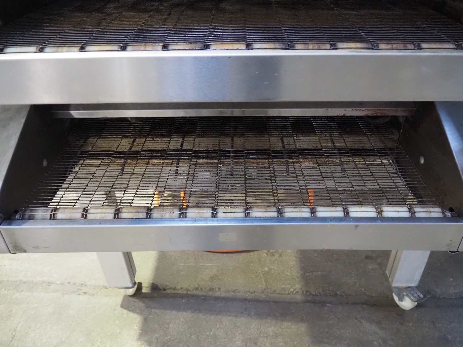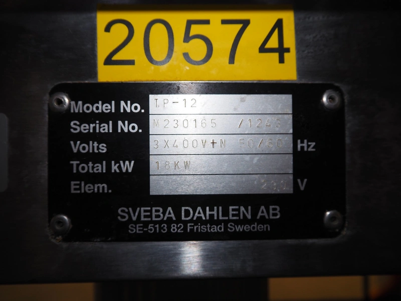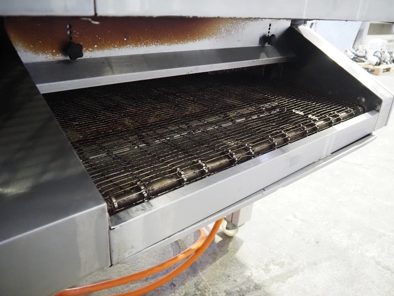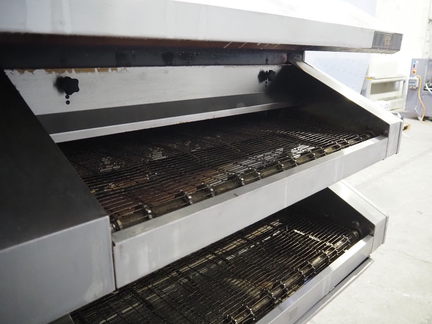 Sveba Dahlen AB mobile double stacked pizza oven, model number: TP-12, serial number: M230165/1243, 400 V, 3 Ph, 50/60 Hz, 18 kW, s/s mesh belt, belt width: 900 mm, clearance: 950 mm x 70 mm, total dimensions: 1400 mm x 1900 mm x 1650 mm.