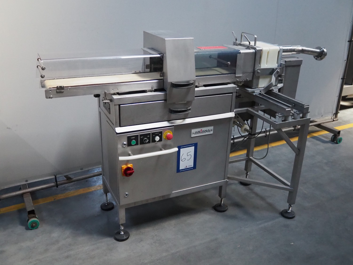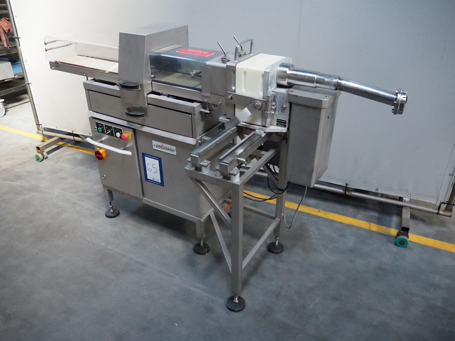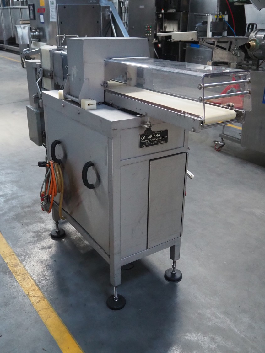 Handtmann/Ariana portioning machine for minced meat, consisting of:Handtmann grinder head for vacuum filling machine, model: GD 93-1, serial number: 77, year of construction: 06/99, 100 V, 50 Hz, 27 A, 1.5 kW, plate diameter: 148 mm.Ariana portion cutter with interleaver, serial number: 2950-3265, plastic belt, belt width: (2x) 160 mm, total dimensions: 2100 mm x 750 mm x 1260 mm.