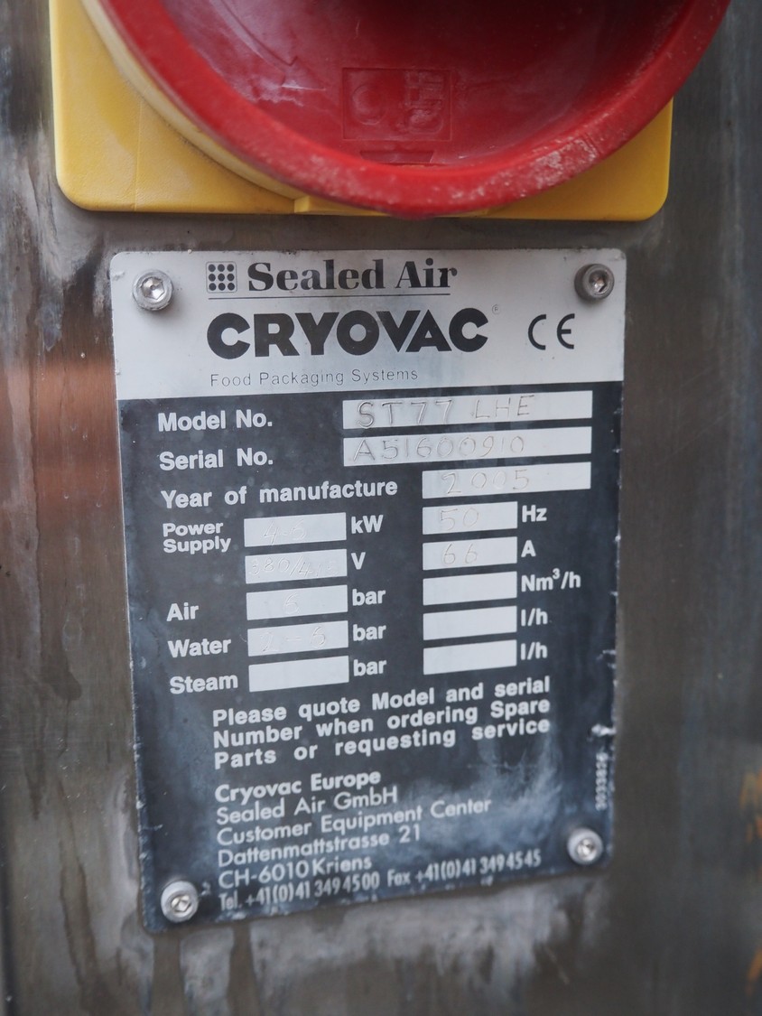 Cryovac dip tank, model: ST77 LHE, serial number: A51600910, year of construction: 2005, 380/410 V, 50 Hz, 66 A, 4.6 kW, clearance: 800 mm x 250 mm, total dimensions: 1250 mm x 1300 mm x 2000 mm. Technical condition unknown.