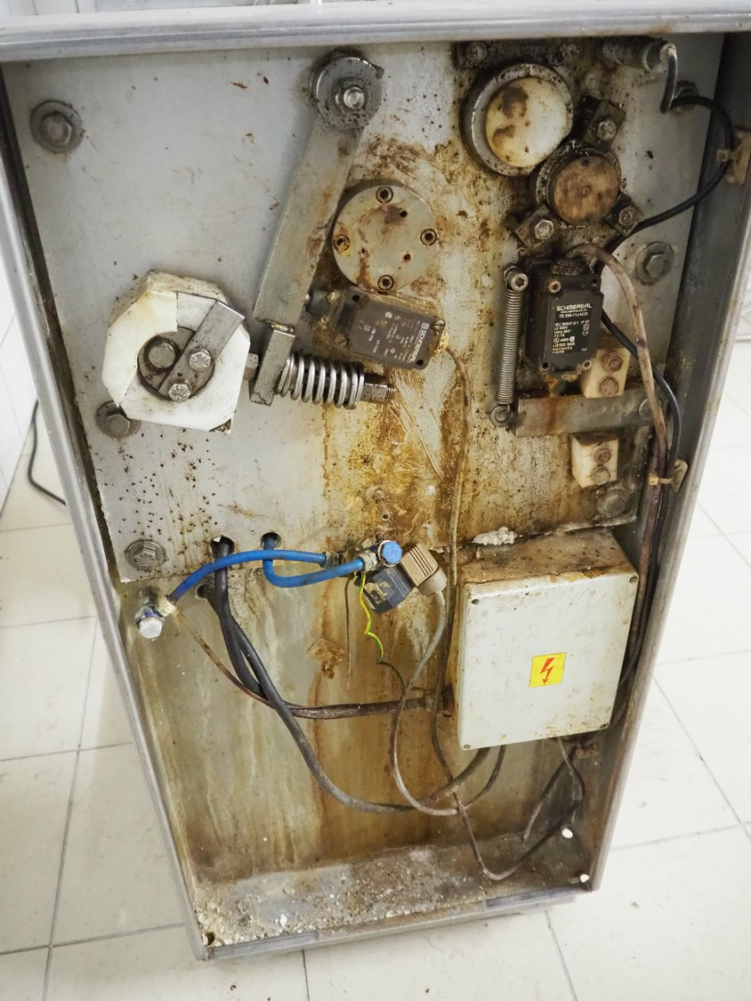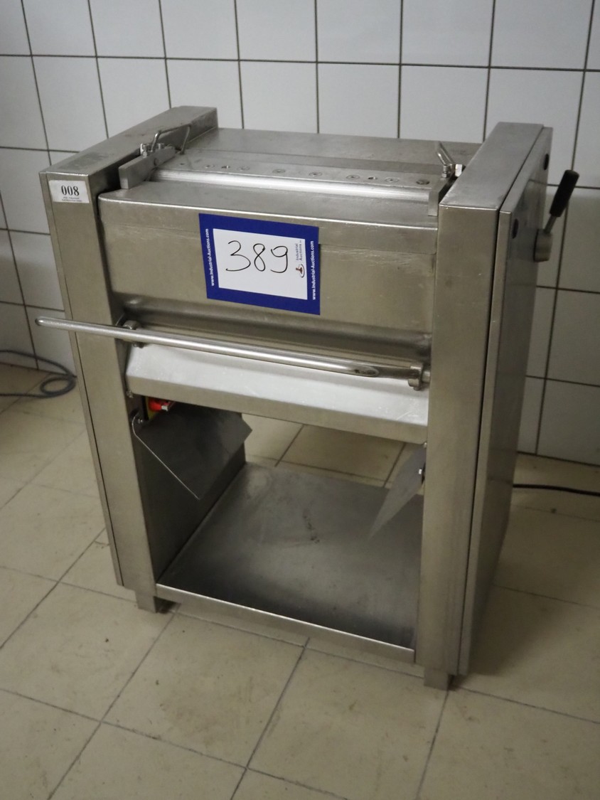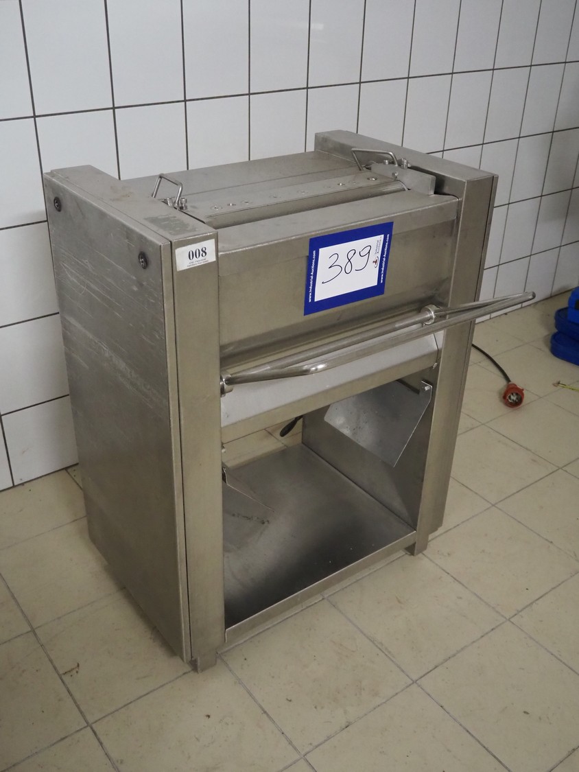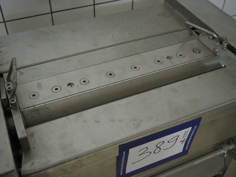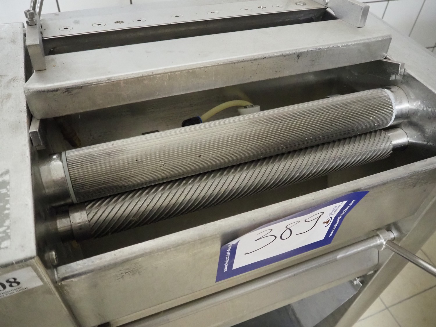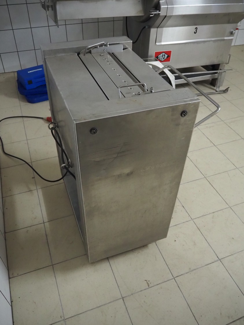 Weber mobile skinning machine, type: ASE 553, number: 716, 380 V, 50 Hz, 0.4 kW, working width: 500 mm, total dimensions: 820 mm x 700 mm x 1040 mm.