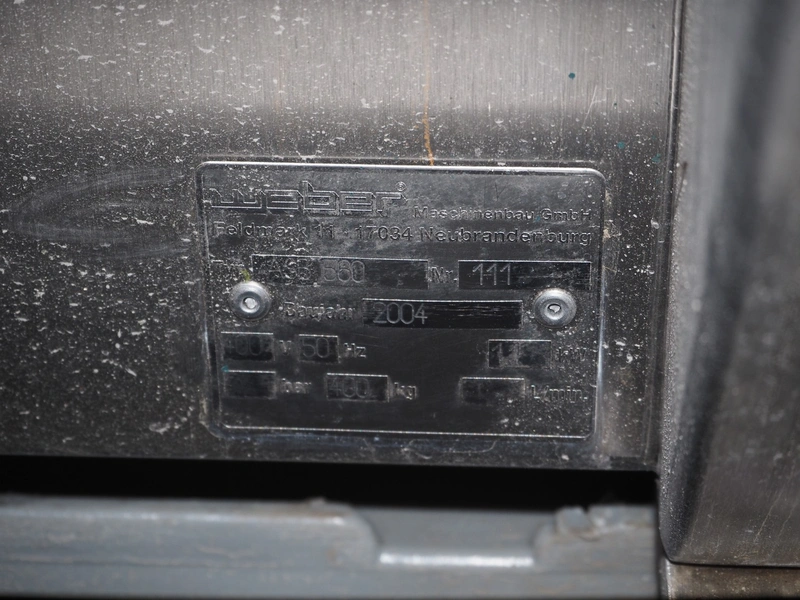 Weber mobile skinning and derinding machine, type: ASB 560, number: 111, year of construction: 2004, 400 V, 50 Hz, 11 kW, plastic belt, belt width: 495 mm, working width: 550 mm, total dimensions: 2000 mm x 1200 mm x 860 mm.