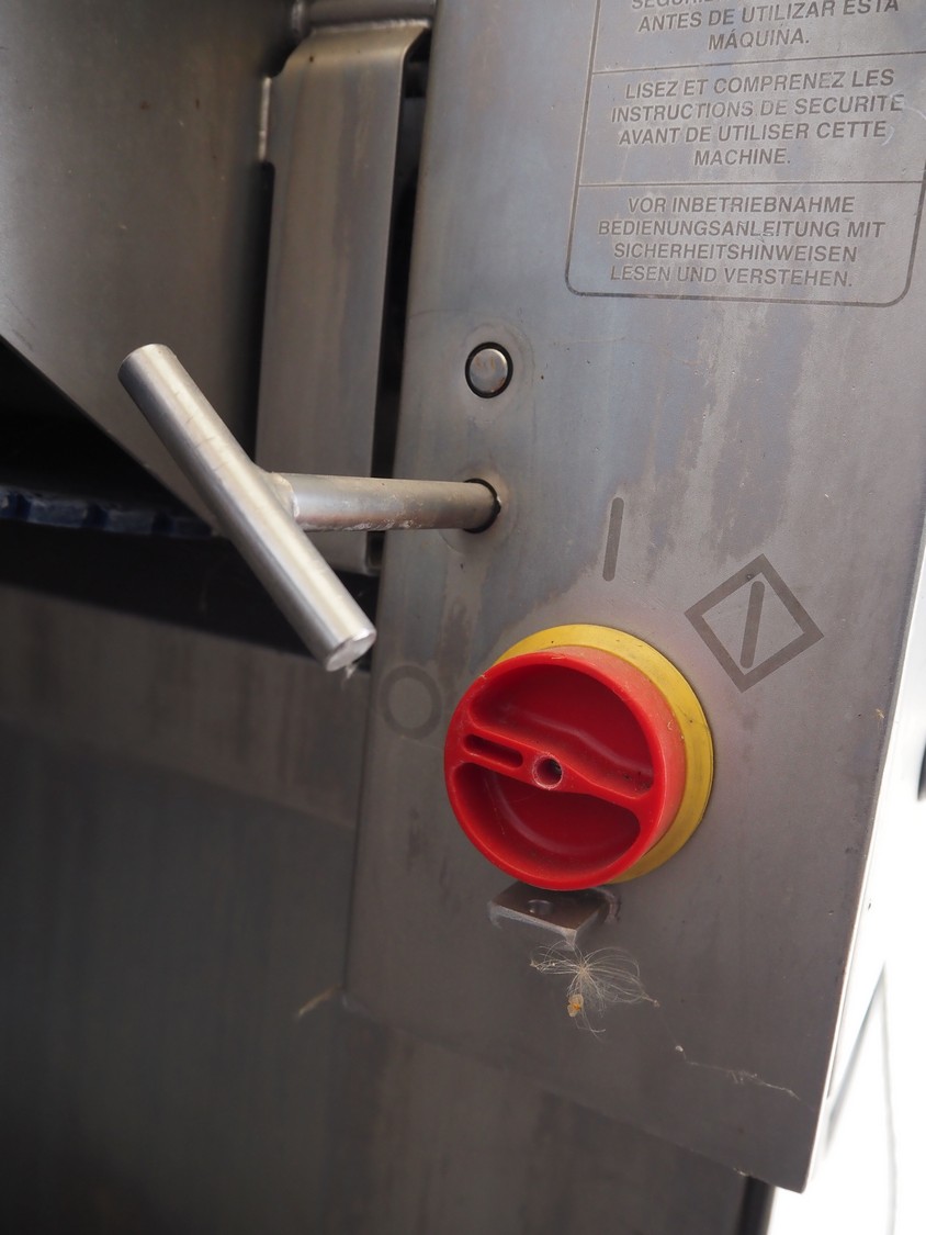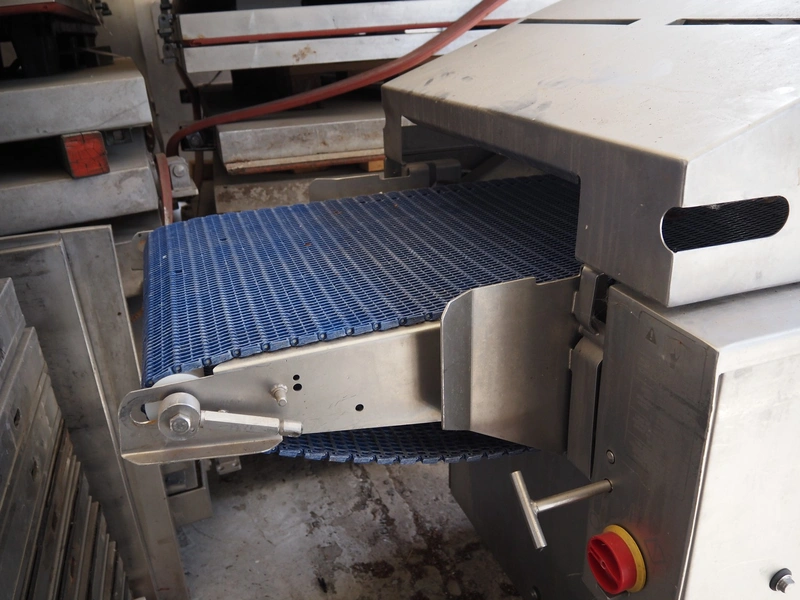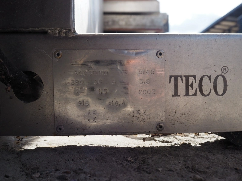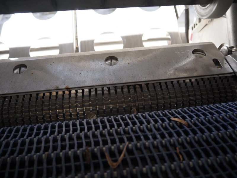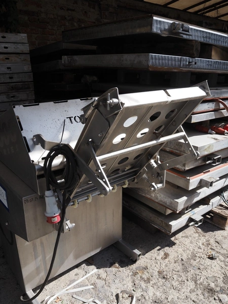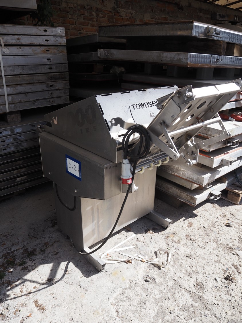 Townsend mobile skinning and derinding machine, model: 9000EURO, number: 5145, year of construction: 2002, 380 V, 3 Ph, 50 Hz, 3.8 A, plastic mesh belt, belt width: (2x) 505 mm, working width: 490 mm, total dimensions: 1650 mm x 900 mm x 1470 mm. Incomplete.