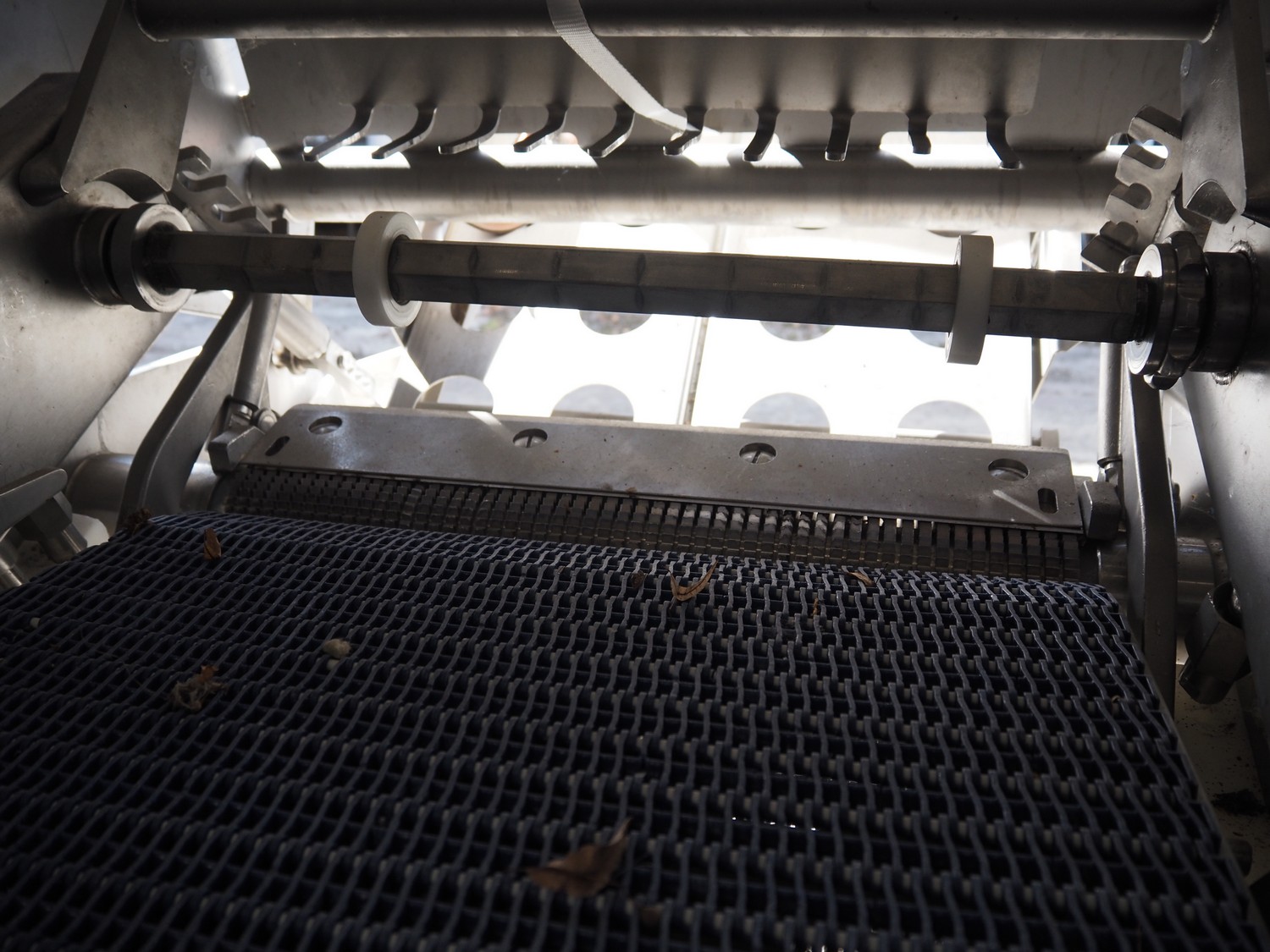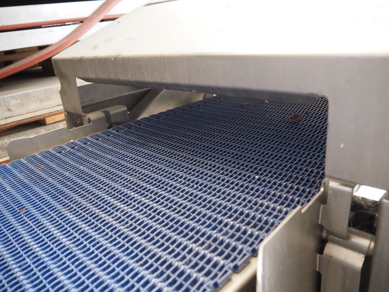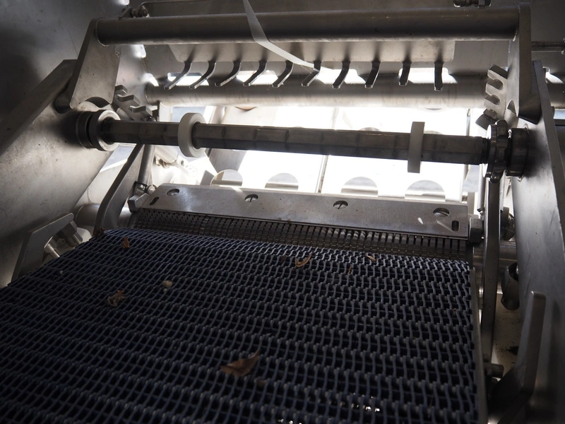 Townsend mobile skinning and derinding machine, model: 9000EURO, number: 5145, year of construction: 2002, 380 V, 3 Ph, 50 Hz, 3.8 A, plastic mesh belt, belt width: (2x) 505 mm, working width: 490 mm, total dimensions: 1650 mm x 900 mm x 1470 mm. Incomplete.