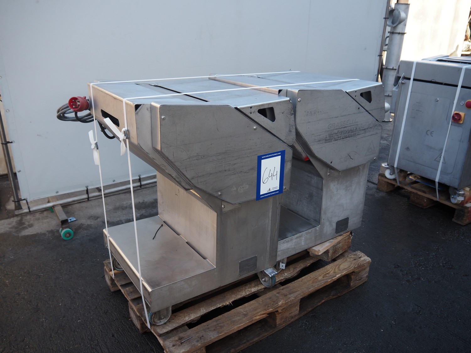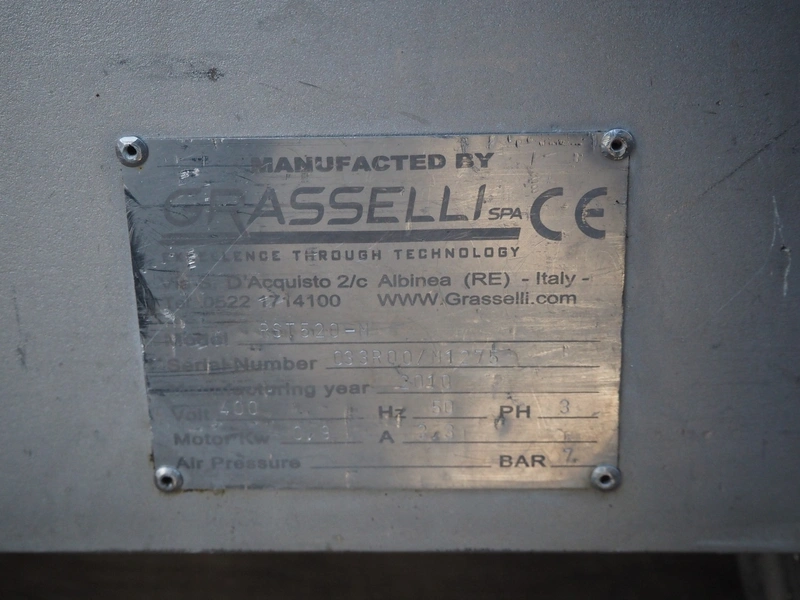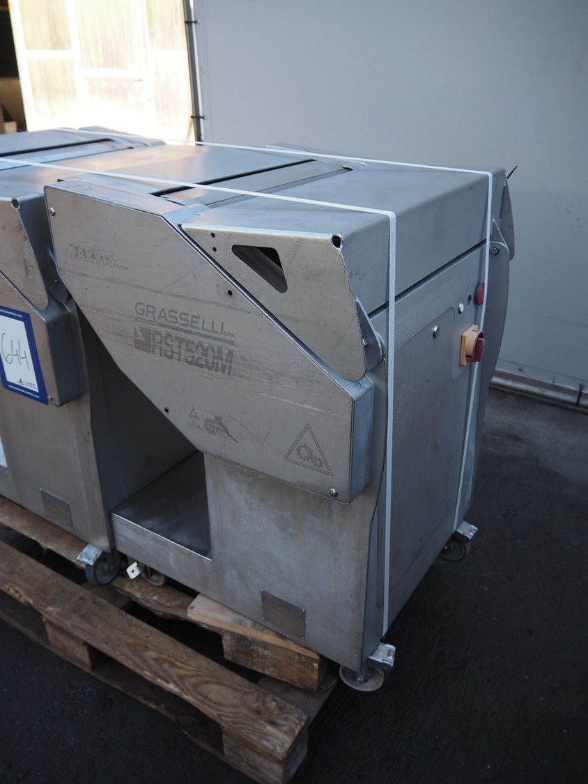 2 Grasselli mobile skinning machines, model: RST520-M, serial number: P11R03/M1382 and 033R00/M1275, year of construction: 2011 and 2010, 400 V, 3 pH, 50 Hz, 2.3 A, 0.9 kW, working width: 480 mm, total dimensions: (2x) 700 mm x 700 mm x 950 mm.
