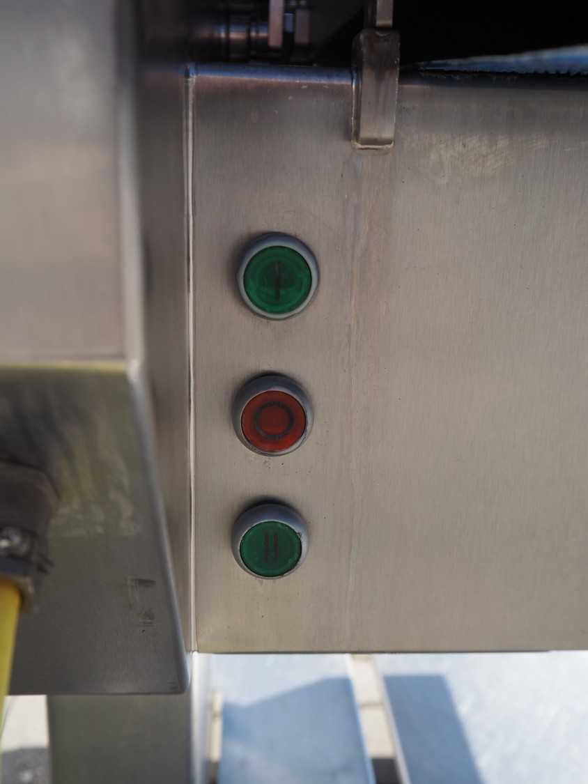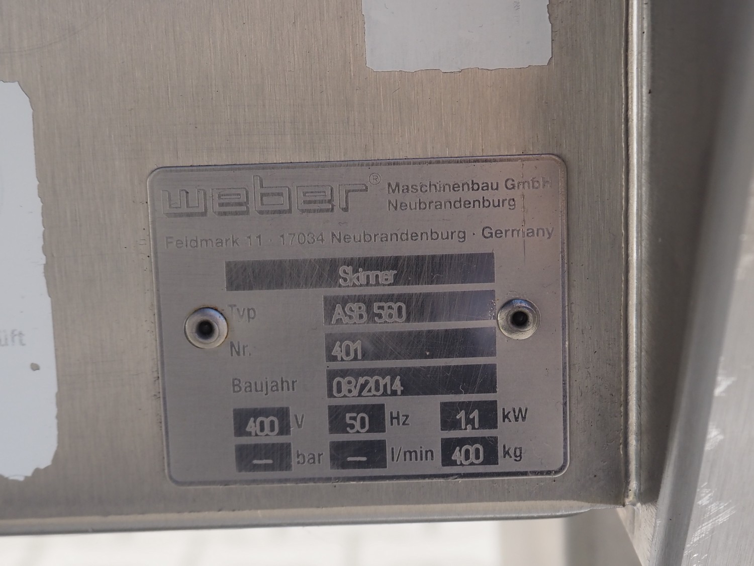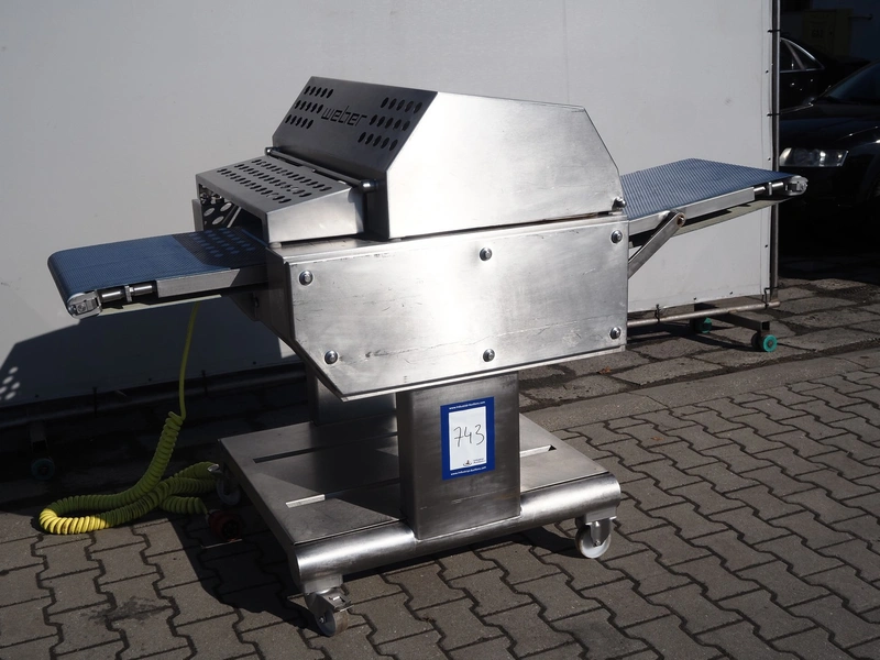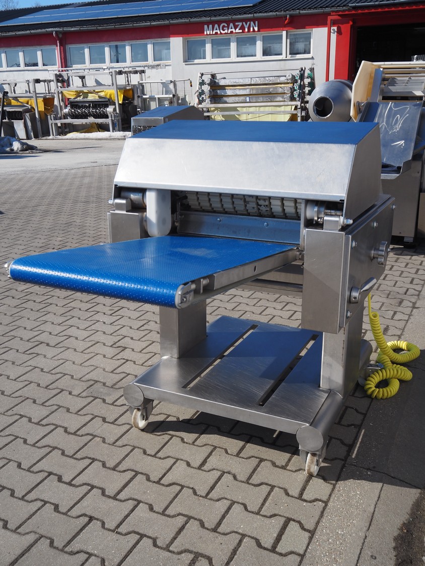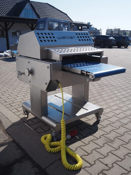 Weber mobile skinning and derinding machine, type: ASB 560, number: 401, year of construction: 08/2014, 400 V, 50 Hz, 1.1 kW, weight: 400 kg, plastic belt, belt width: 500 mm, working width: 560 mm, total dimensions: 2200 mm x 1100 mm x 1300 mm.