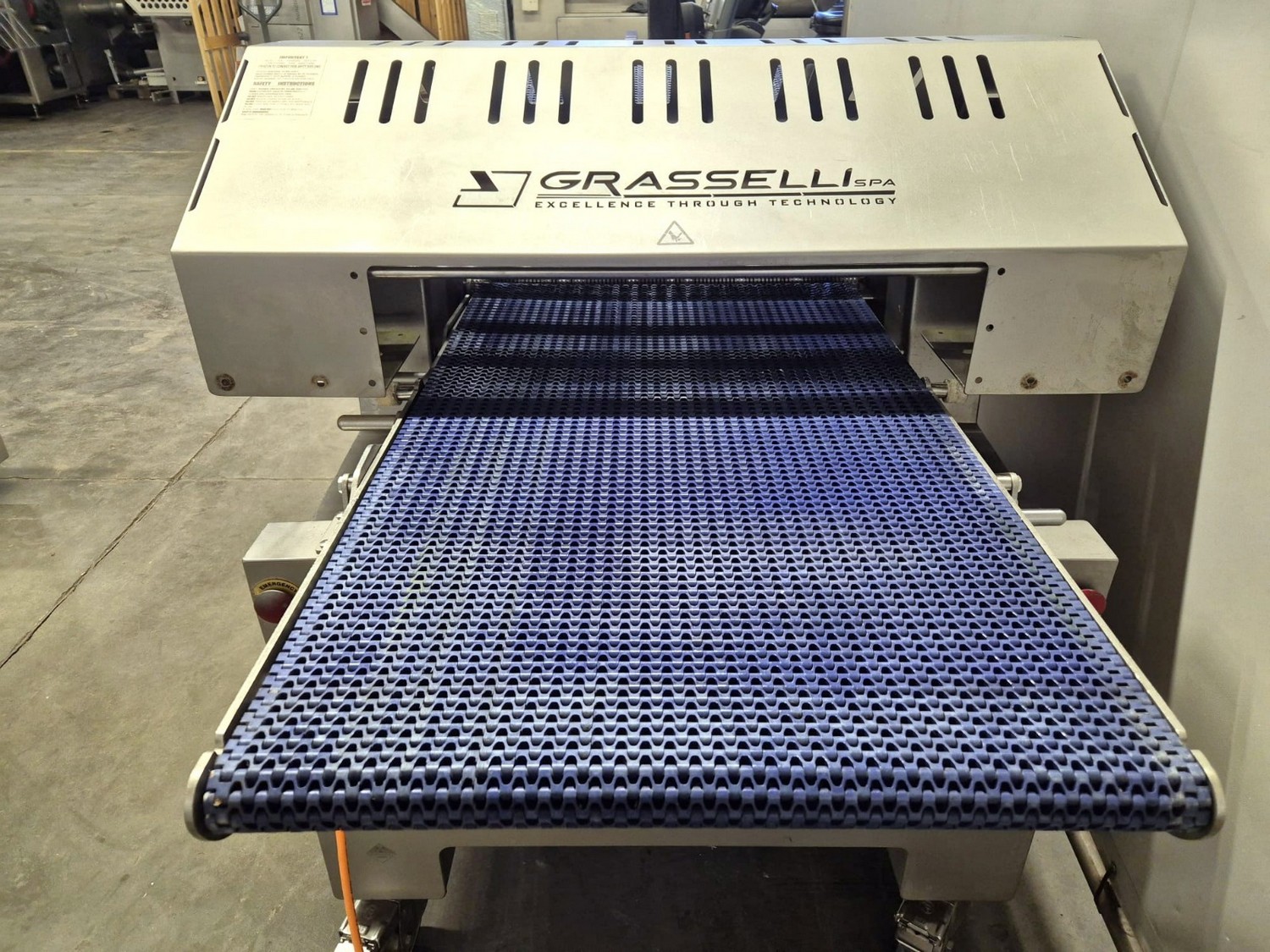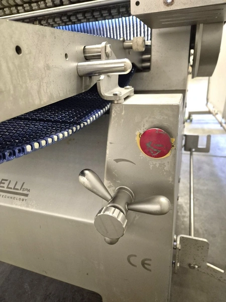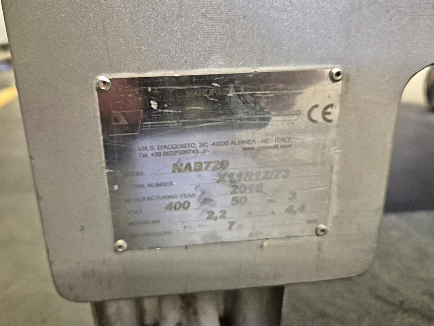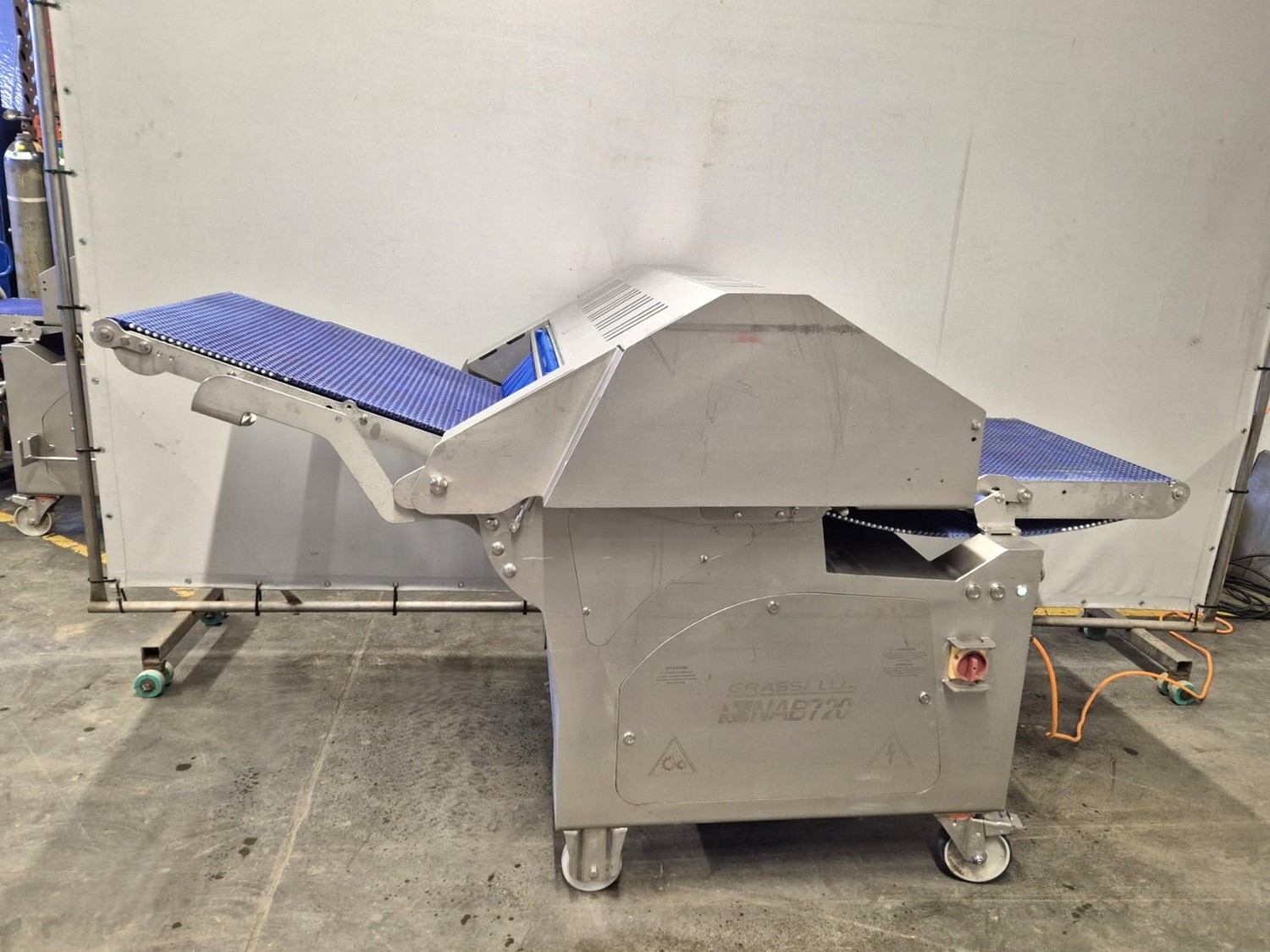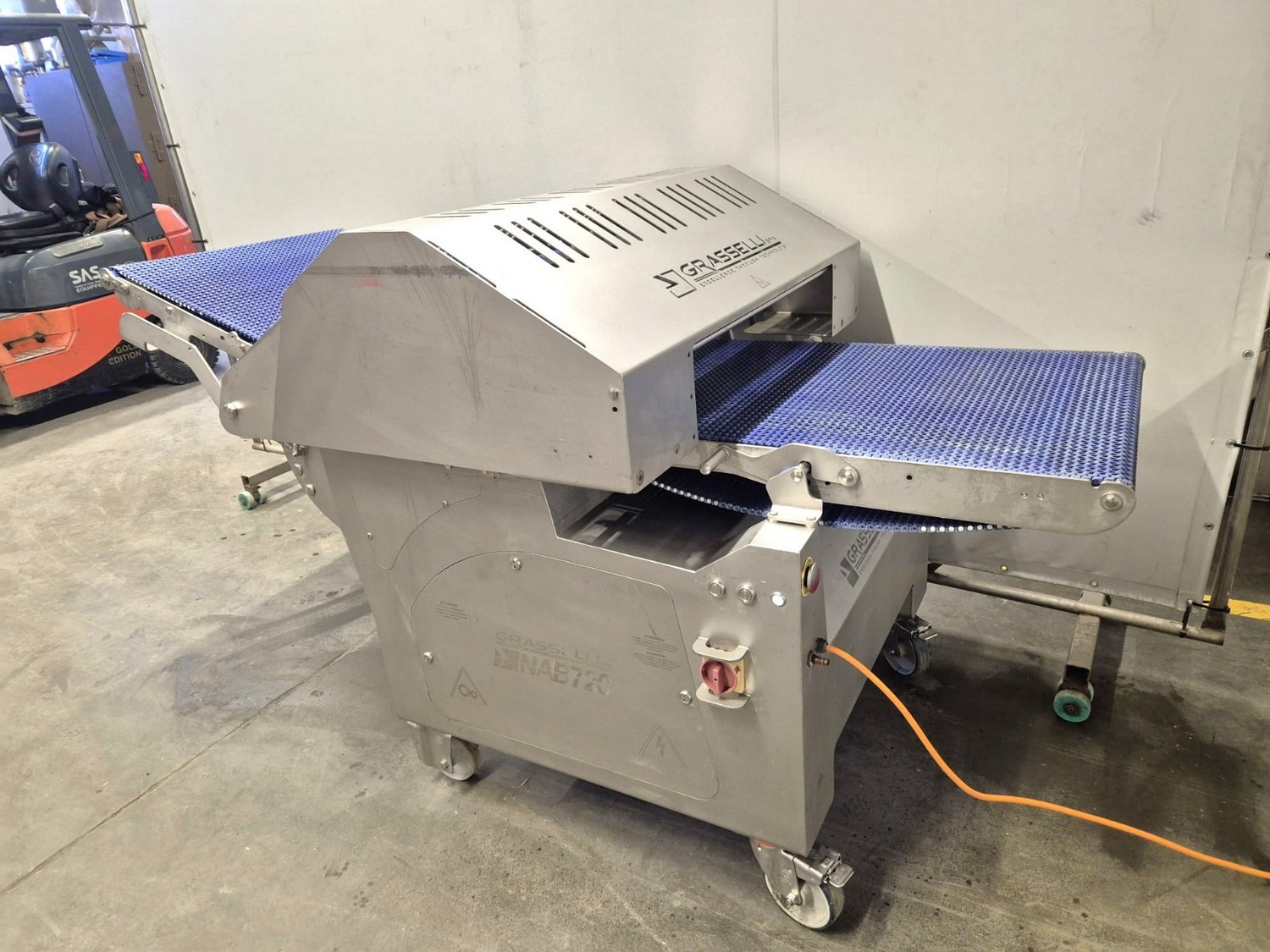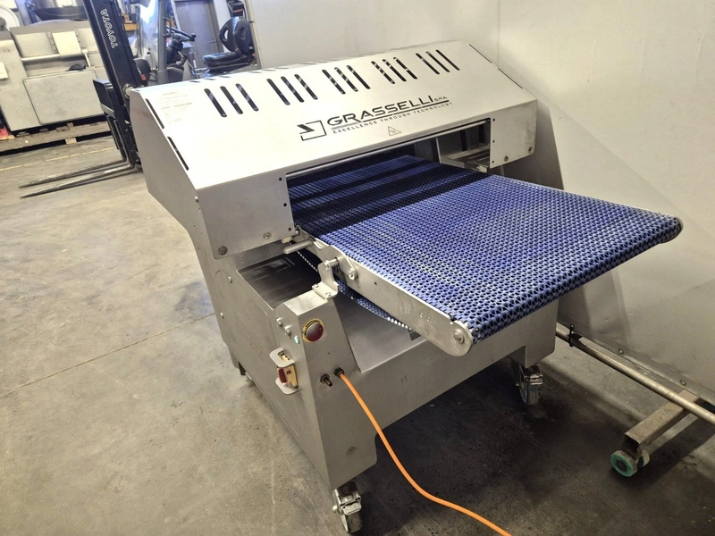 Grasselli SPA mobile automatic skinning machine, type: NAB720, serial number: X11R12/73, year of construction: 2018, 400 V, 3 Ph, 50 Hz, 2.2 kW, 4.4 A, 7 bar, working width: 650 mm, total dimensions: 2200 mm x 1160 mm x 1250 mm.