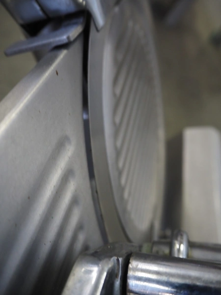 Ma-Ga table model slicer with knife sharpener, model: P, number: 26 734, year of construction: 1993, 220 V, 1 Ph, 50 Hz, 180 W, weight: 36 kg, dimensions: 600 mm x 500 mm x 500 mm.