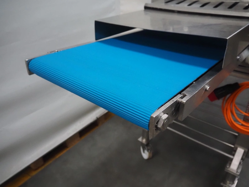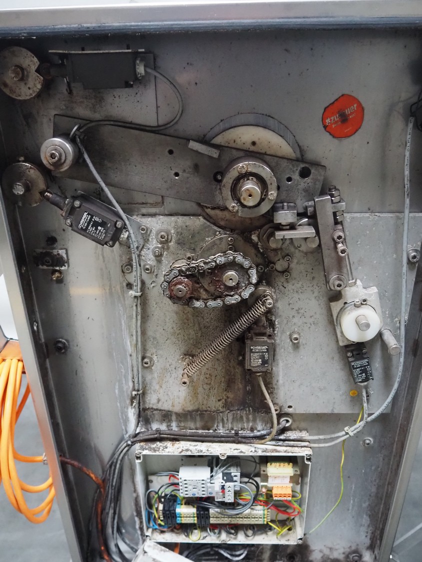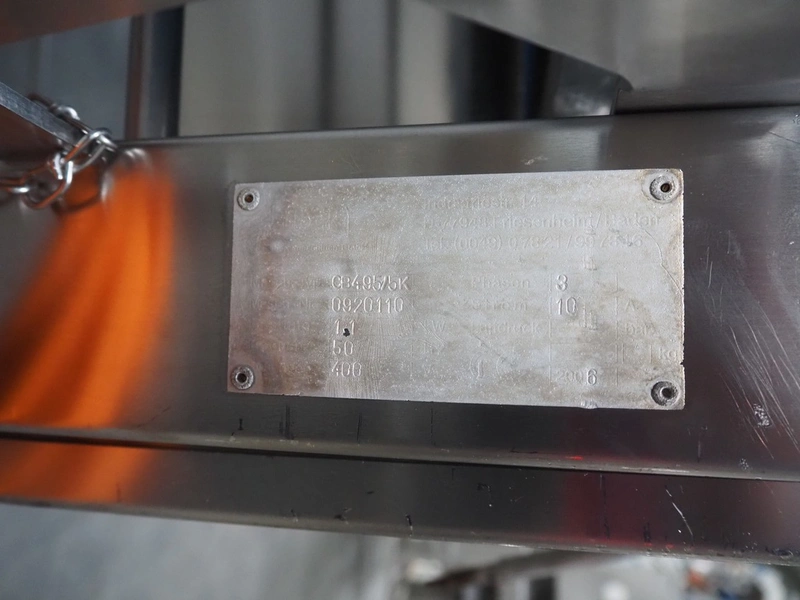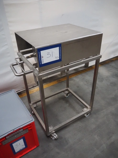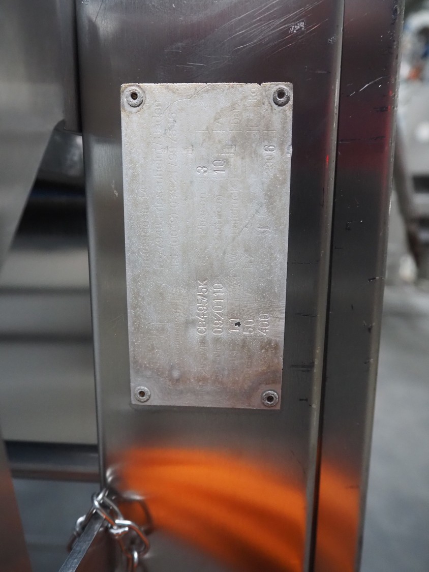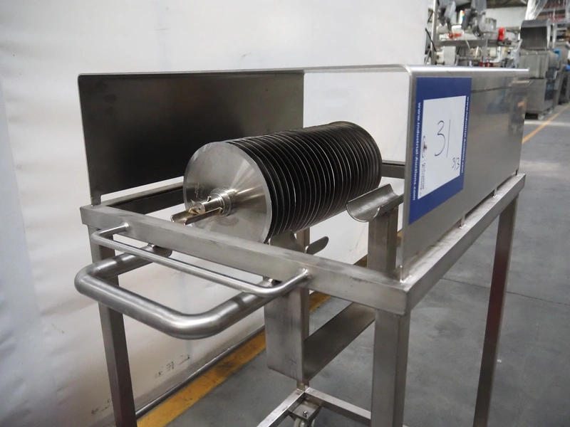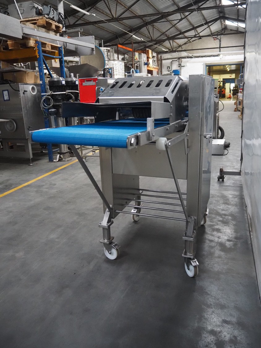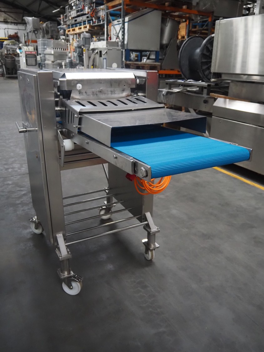 Nock mobile strip cutter, type: CB495/5K, serial number: 09020110, year of construction: 2006, 400 V, 3 Ph, 50 Hz, 10 A, plastic belt, belt width: 430 mm, 16 knives, distance between knives: 30 mm, total dimensions: 2400 mm x 850 mm x 1480 mm. Including 2 extra knives, (1x) 30 mm, (1x) 15 mm, and s/s trolley, dimensions: 570 mm x 830 mm x 1100 mm.