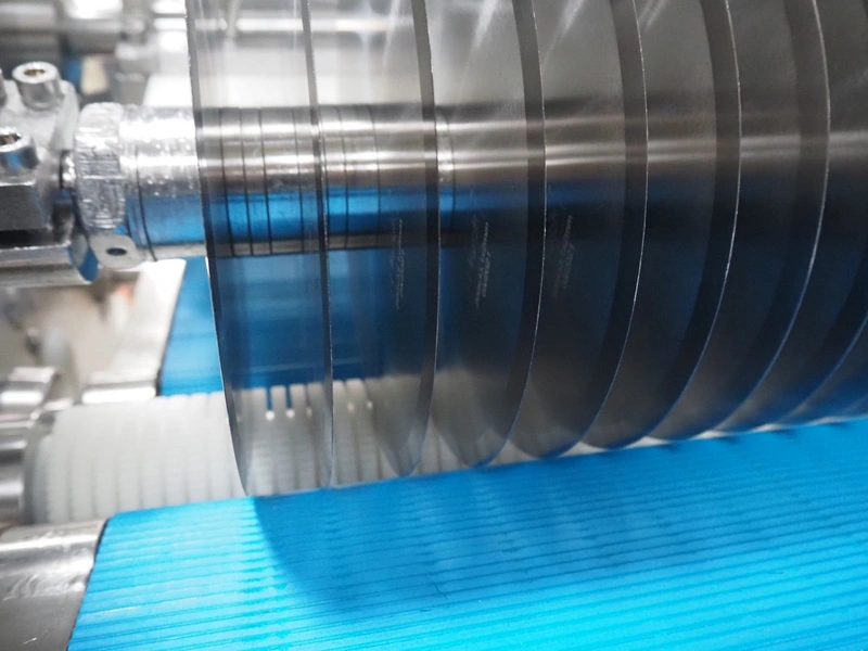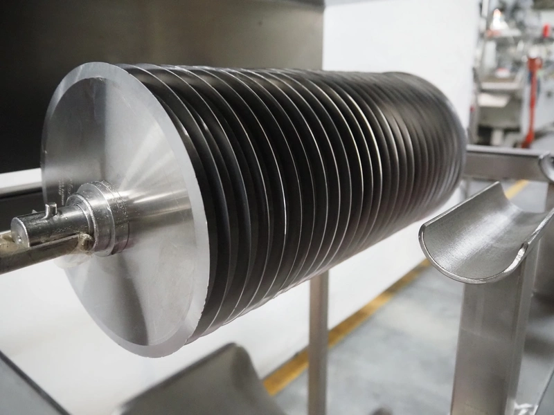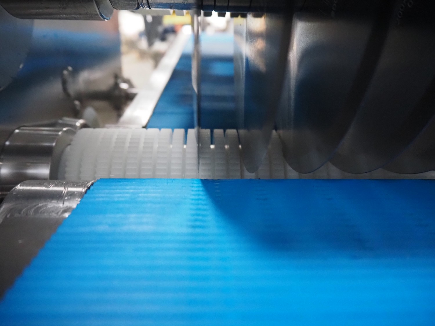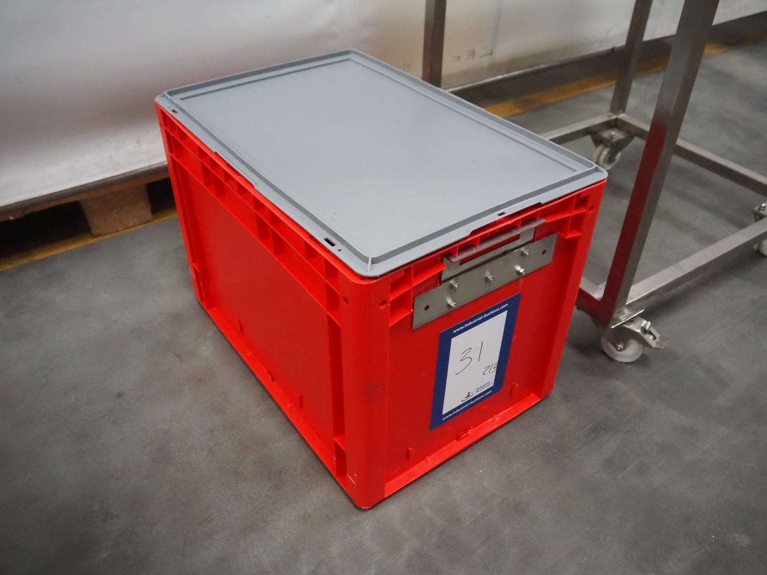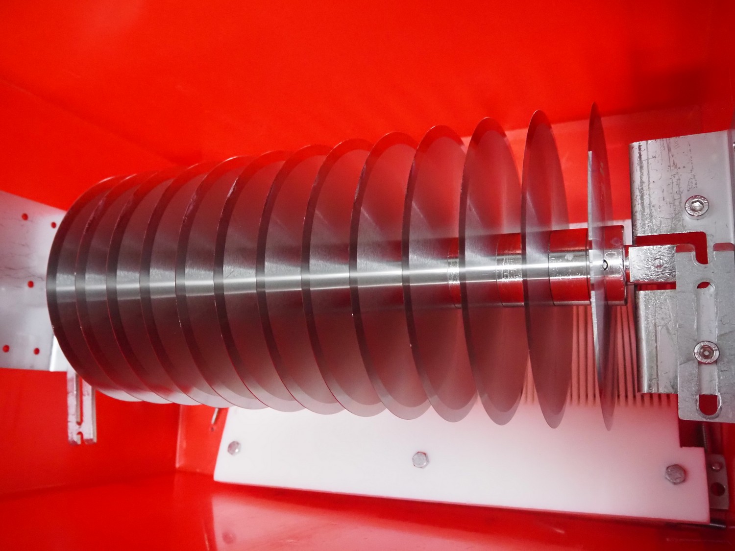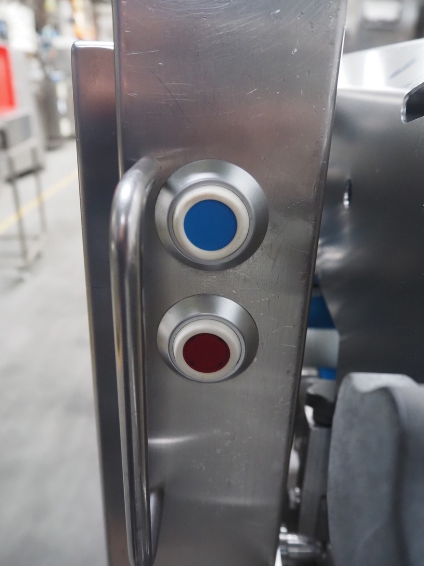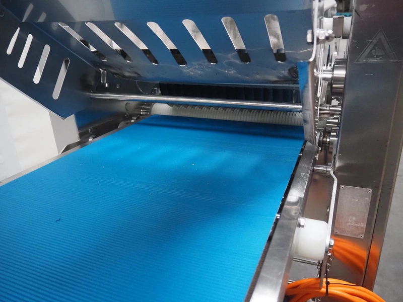 Nock mobile strip cutter, type: CB495/5K, serial number: 09020110, year of construction: 2006, 400 V, 3 Ph, 50 Hz, 10 A, plastic belt, belt width: 430 mm, 16 knives, distance between knives: 30 mm, total dimensions: 2400 mm x 850 mm x 1480 mm. Including 2 extra knives, (1x) 30 mm, (1x) 15 mm, and s/s trolley, dimensions: 570 mm x 830 mm x 1100 mm.