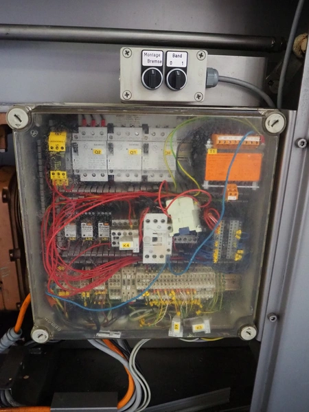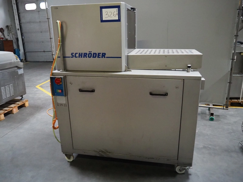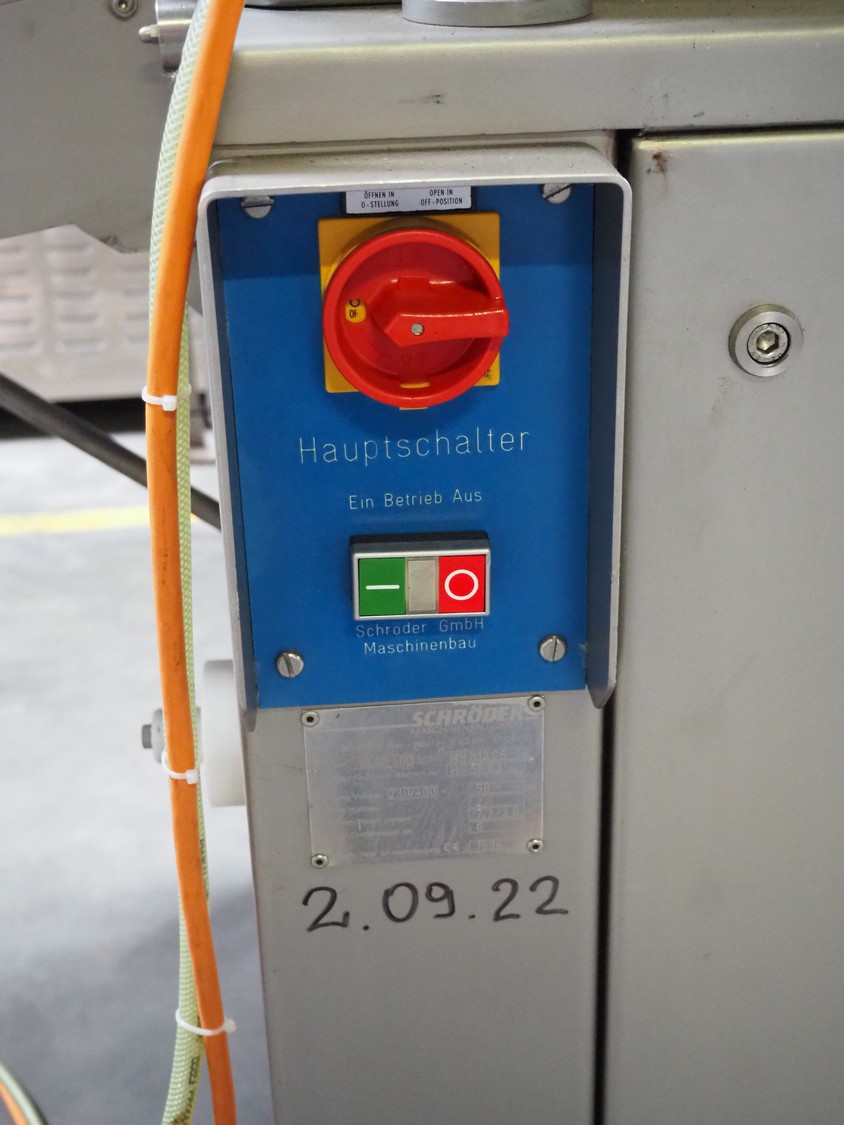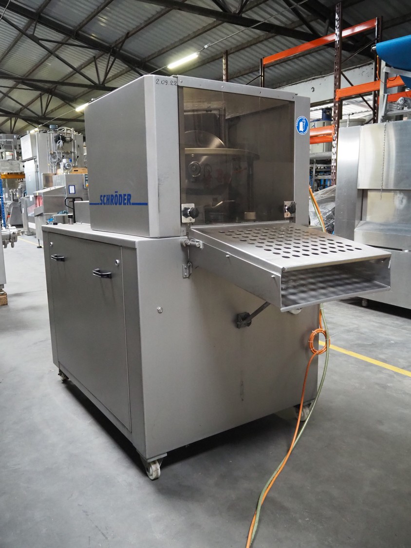 Schröder Maschinenbau GmbH mobile slicer, type: HS 90/400, number: HS 81396, year of construction: 1996, 230/400 V, 50 Hz, 7.3/3.8 A, 2 kW, 6 bar, s/s walking beam, width: 260 mm, total dimensions: 1800 mm x 1200 mm x 1780 mm.