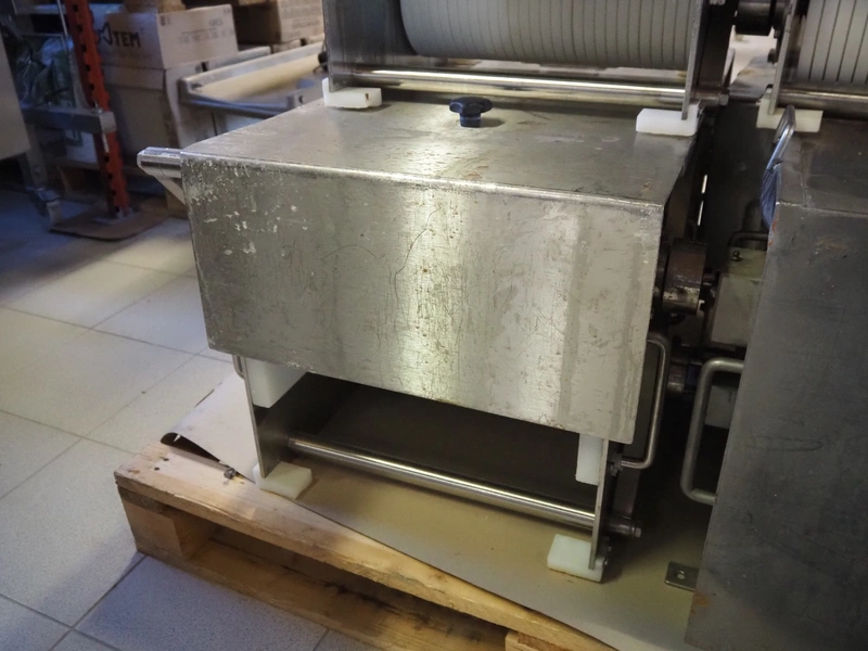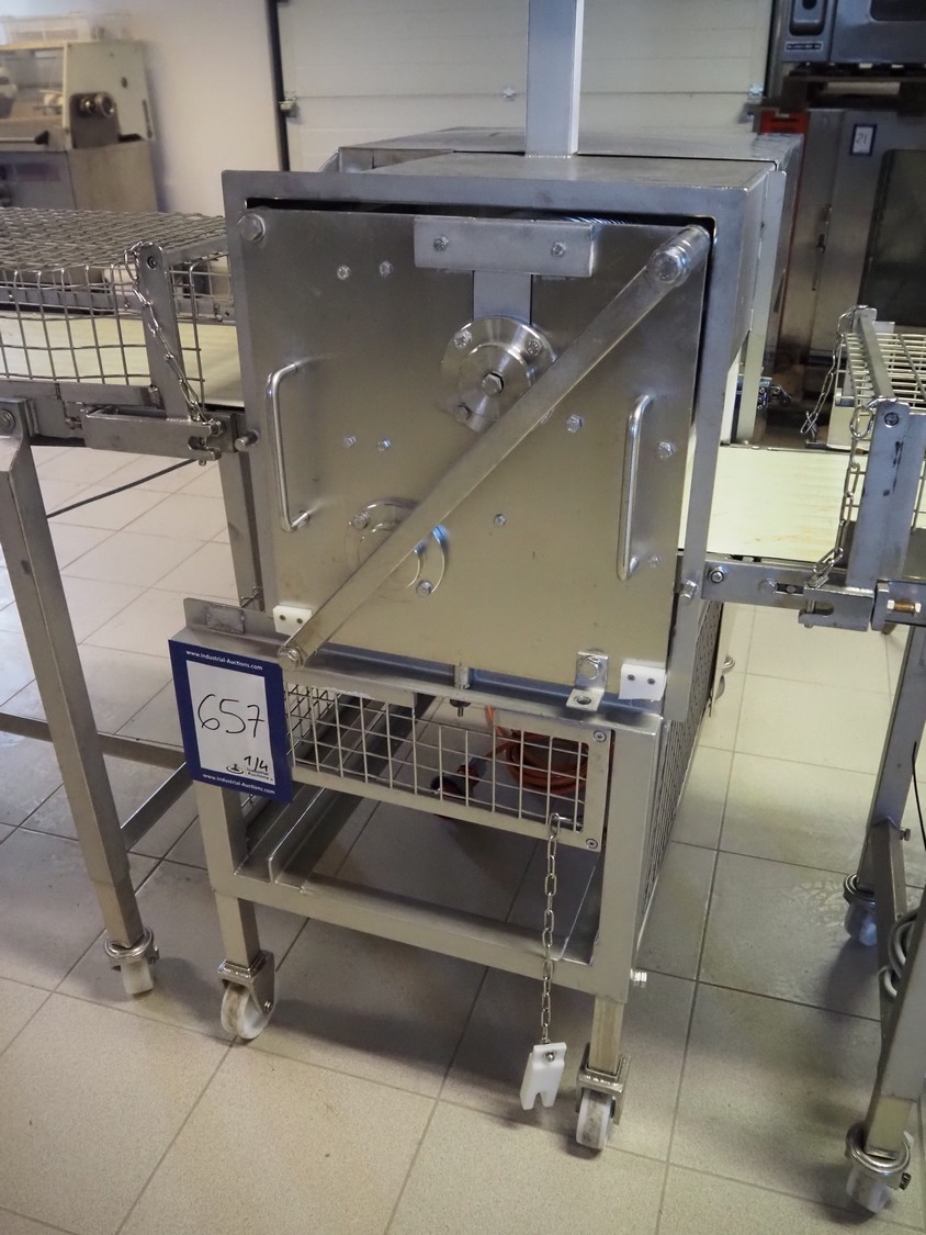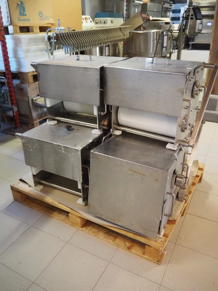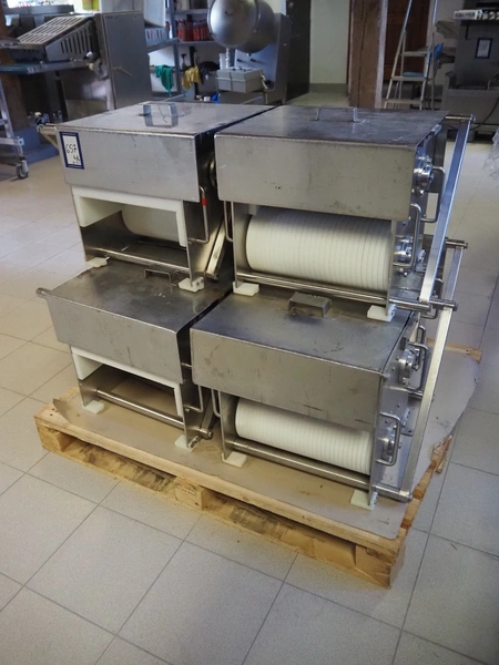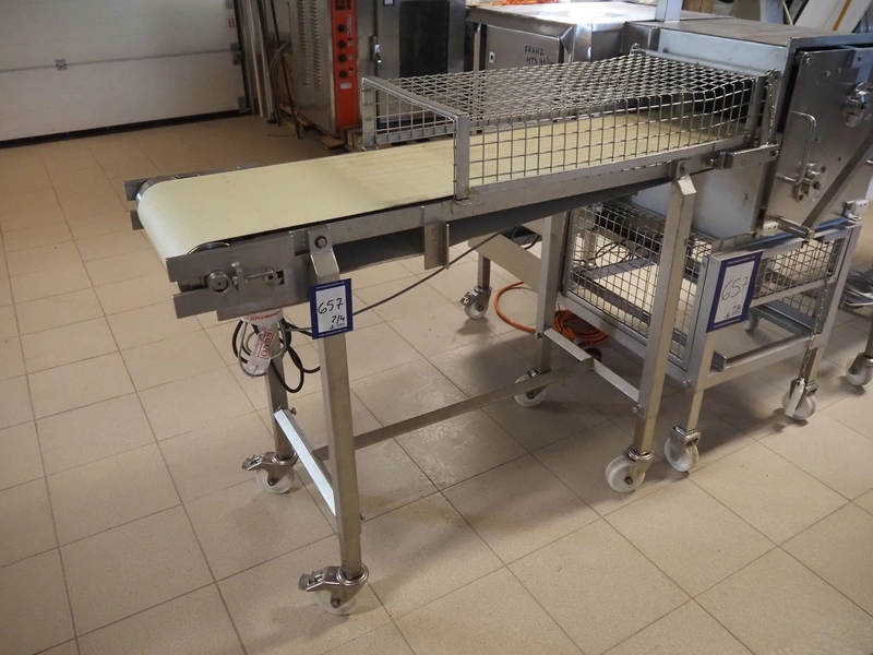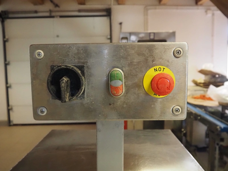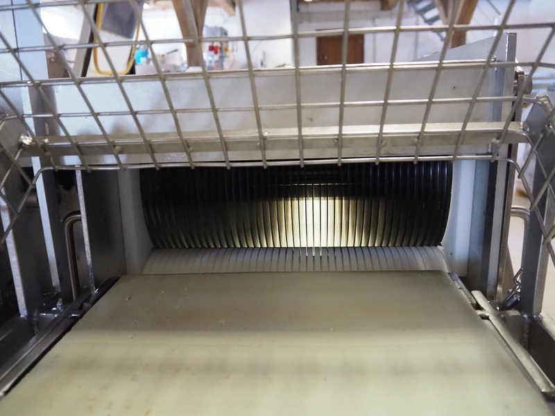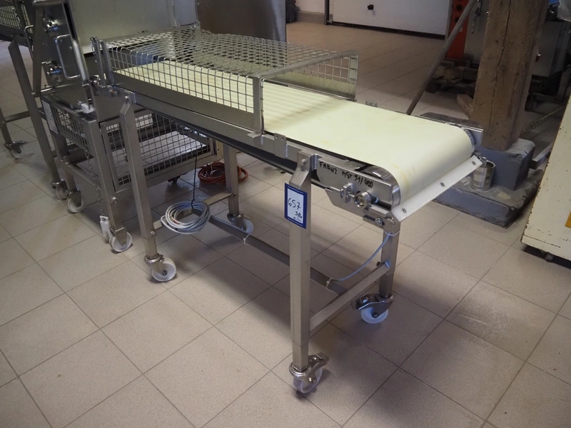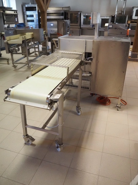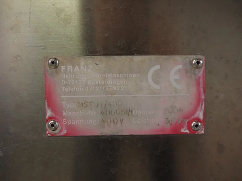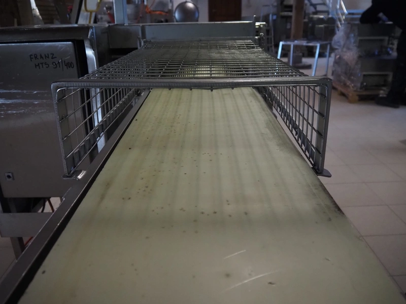 Franz Nahrungsmittelmachinen mobile strip cutter, type: MST91/400, machine number: 406061/1, year of construction: 2004, 400 V, 3 kW, plastic belt, belt width: 340 mm, clearance: 375 mm x 100 mm, distance between knives: 10 mm, total dimensions: 3200 mm x 1200 mm x 1600 mm. Including pallet with extra knife sets, distance between knives: (2x) 15 mm, (2x) 10 mm, (1x) 5 mm.