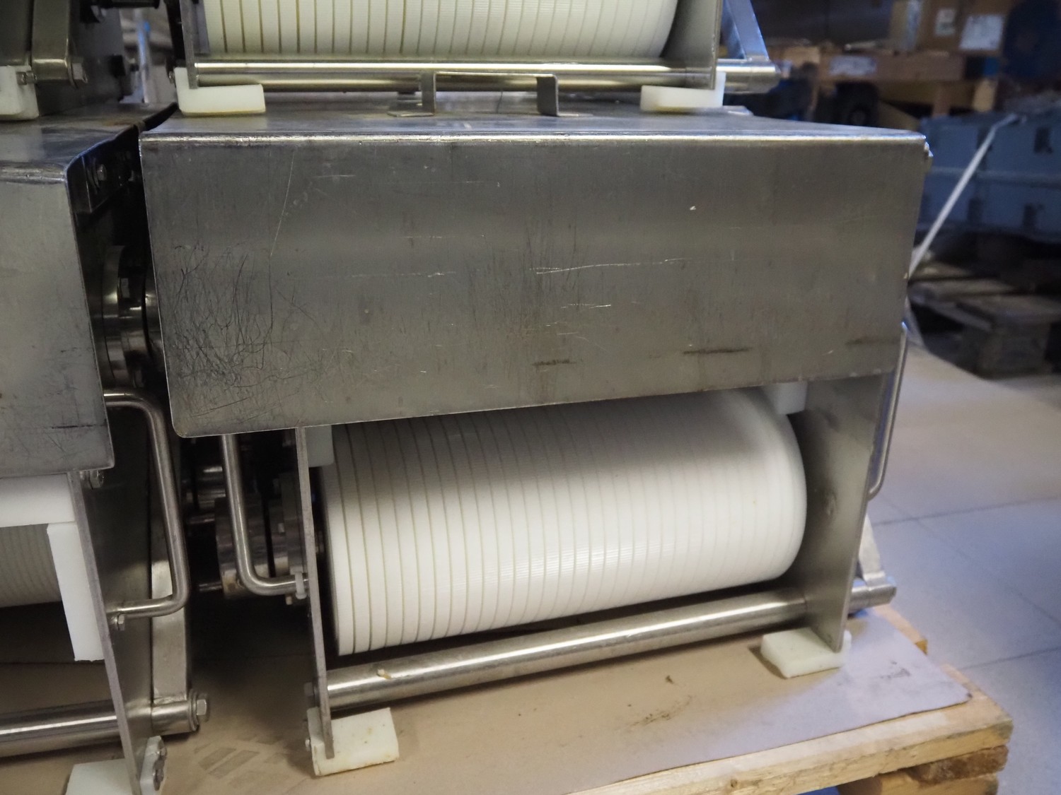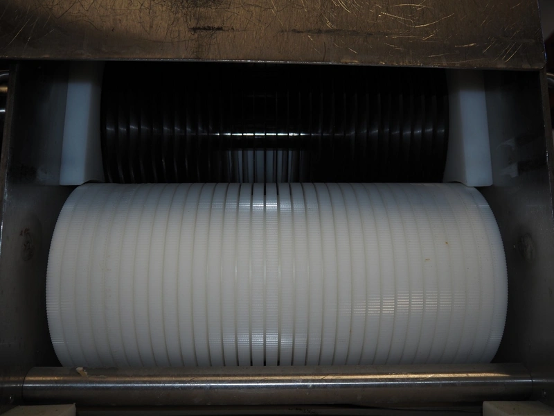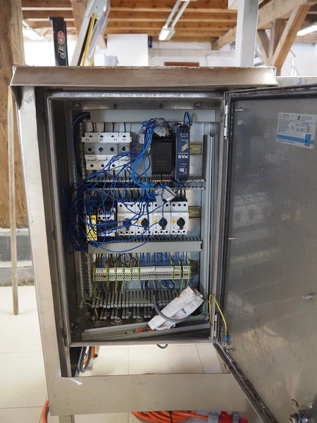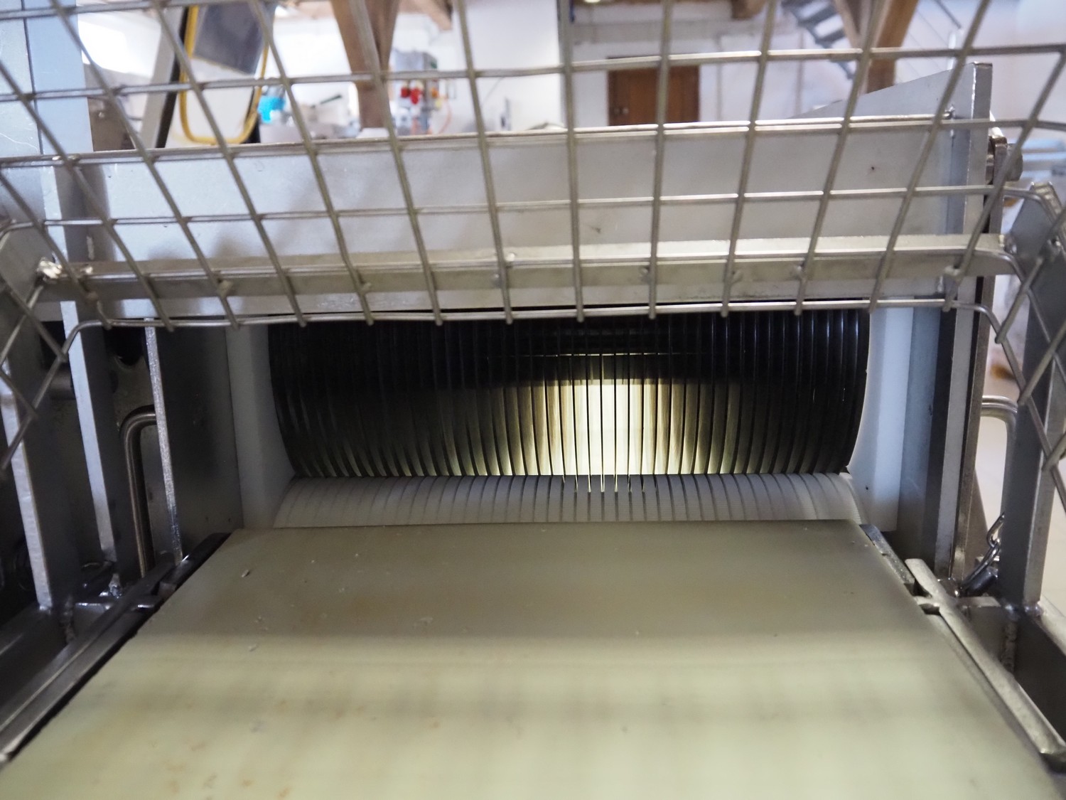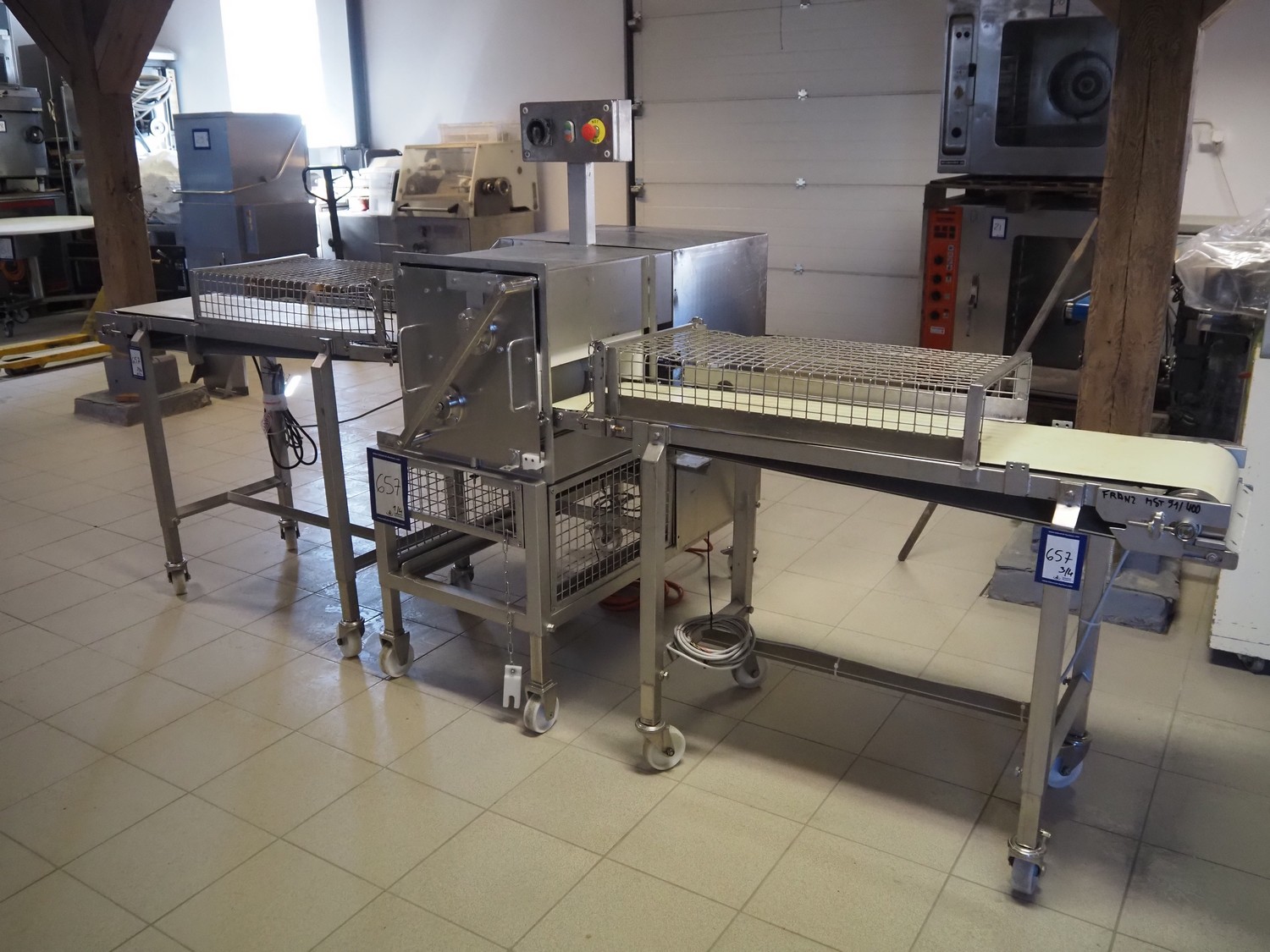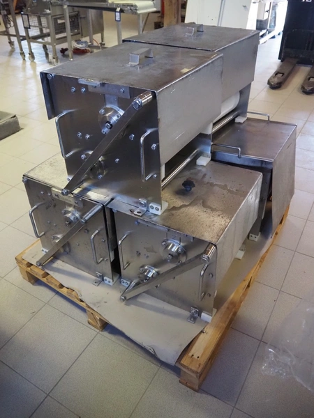 Franz Nahrungsmittelmachinen mobile strip cutter, type: MST91/400, machine number: 406061/1, year of construction: 2004, 400 V, 3 kW, plastic belt, belt width: 340 mm, clearance: 375 mm x 100 mm, distance between knives: 10 mm, total dimensions: 3200 mm x 1200 mm x 1600 mm. Including pallet with extra knife sets, distance between knives: (2x) 15 mm, (2x) 10 mm, (1x) 5 mm.