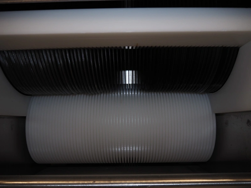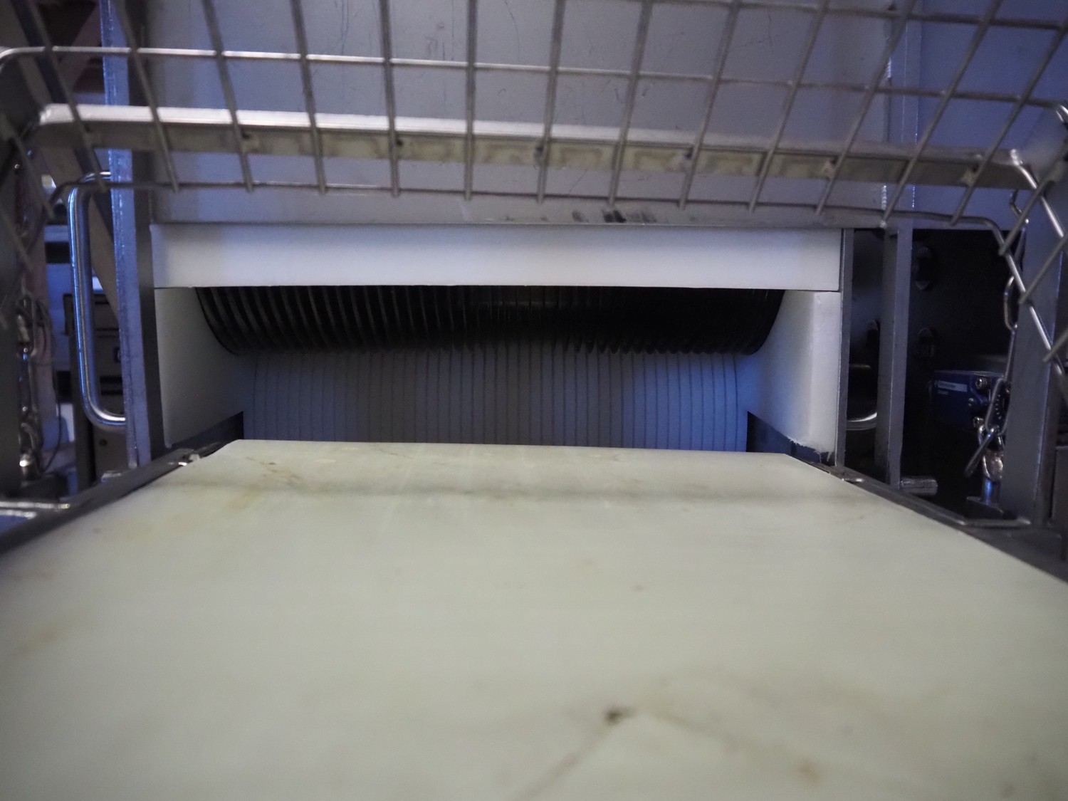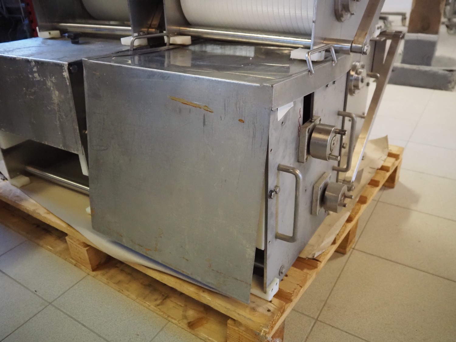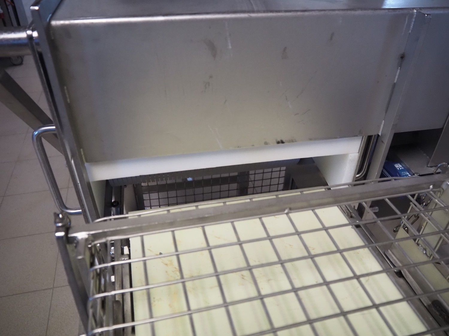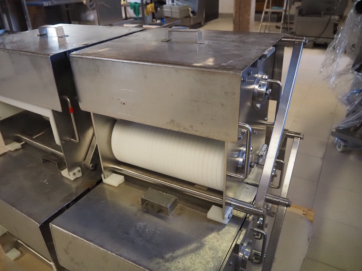 Franz Nahrungsmittelmachinen mobile strip cutter, type: MST91/400, machine number: 406061/1, year of construction: 2004, 400 V, 3 kW, plastic belt, belt width: 340 mm, clearance: 375 mm x 100 mm, distance between knives: 10 mm, total dimensions: 3200 mm x 1200 mm x 1600 mm. Including pallet with extra knife sets, distance between knives: (2x) 15 mm, (2x) 10 mm, (1x) 5 mm.