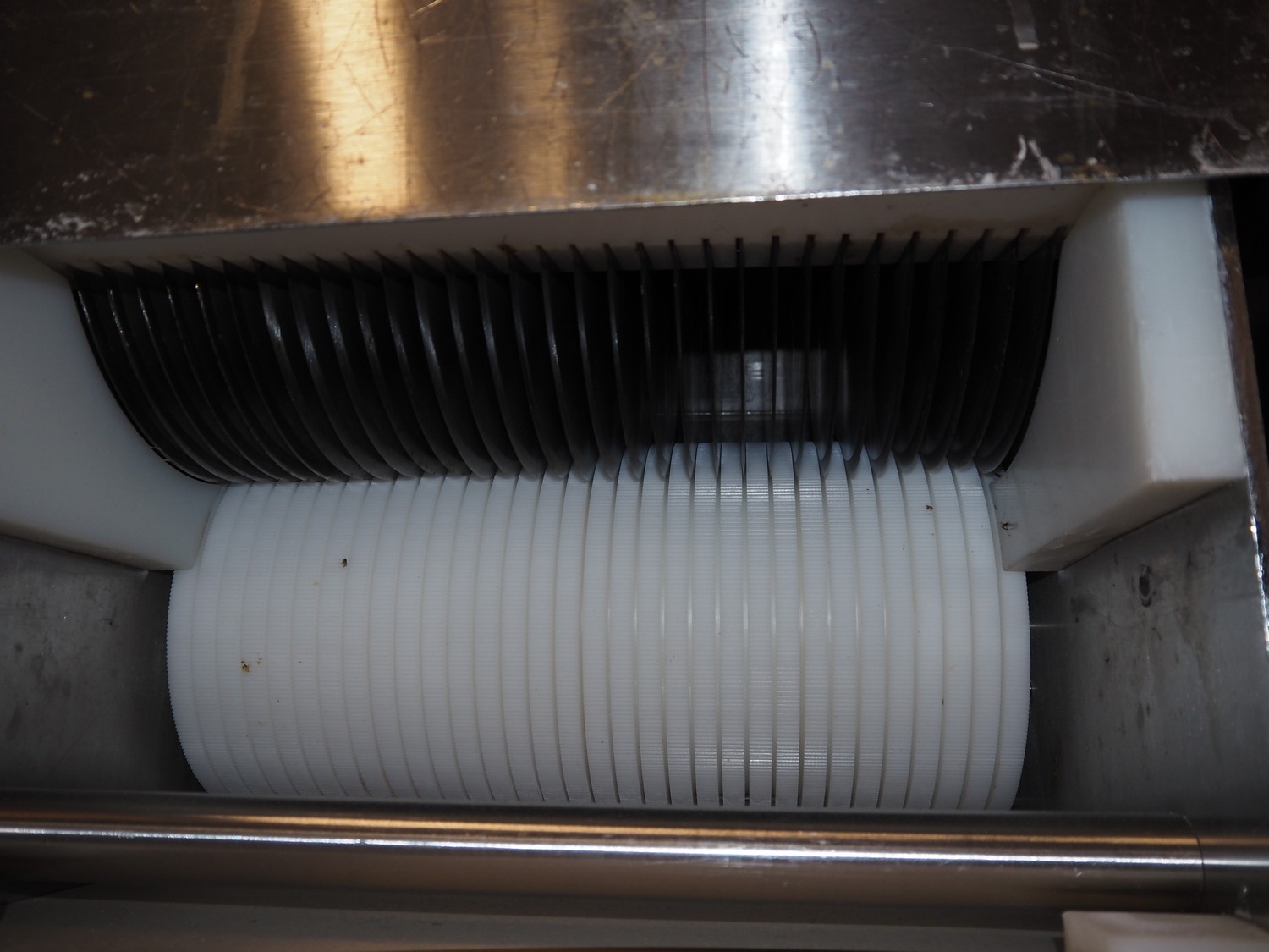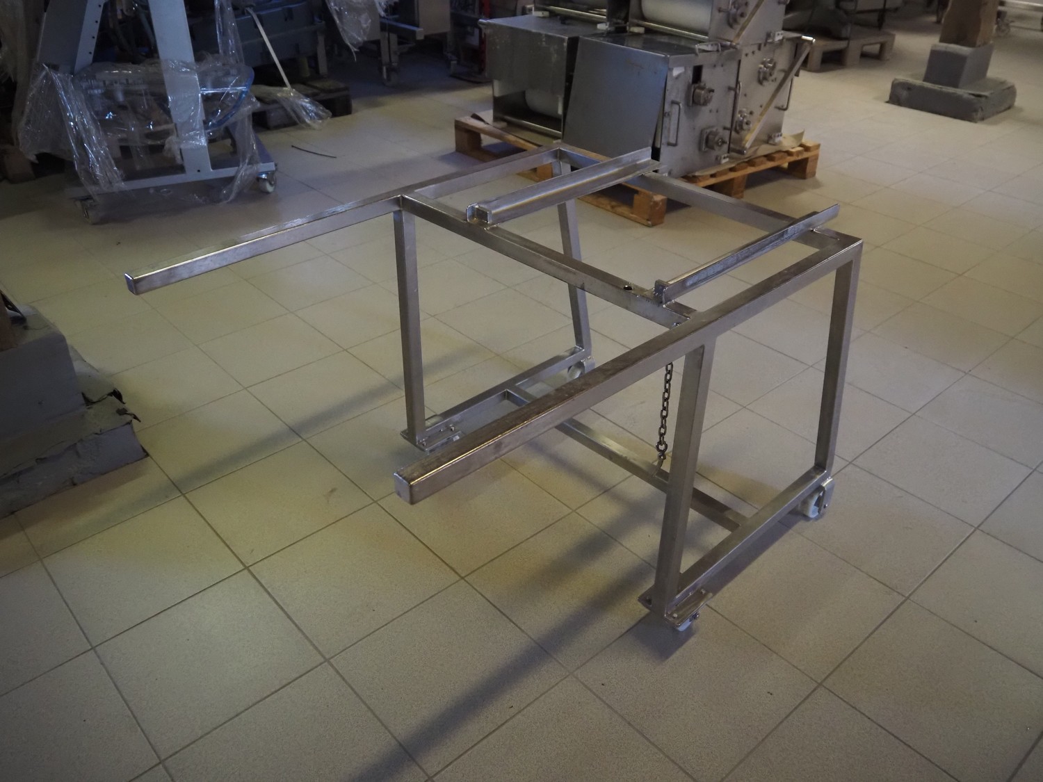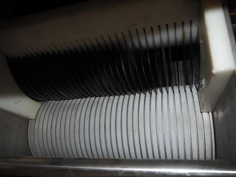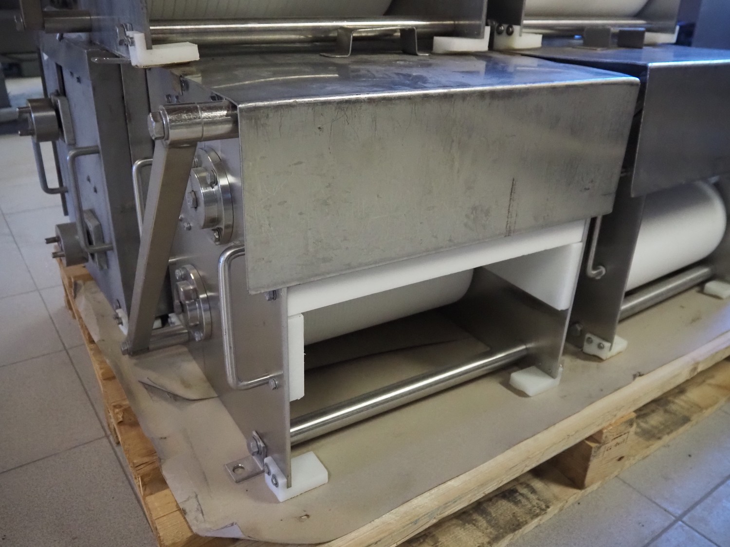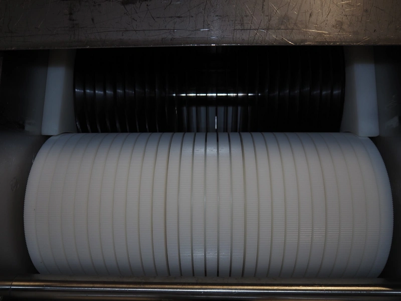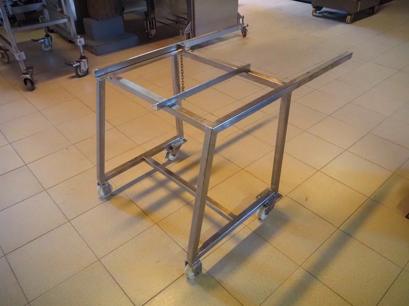 Franz Nahrungsmittelmachinen mobile strip cutter, type: MST91/400, machine number: 406061/1, year of construction: 2004, 400 V, 3 kW, plastic belt, belt width: 340 mm, clearance: 375 mm x 100 mm, distance between knives: 10 mm, total dimensions: 3200 mm x 1200 mm x 1600 mm. Including pallet with extra knife sets, distance between knives: (2x) 15 mm, (2x) 10 mm, (1x) 5 mm.