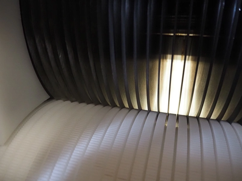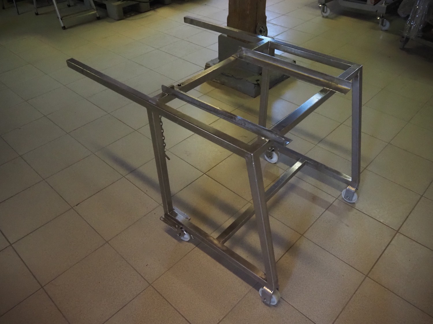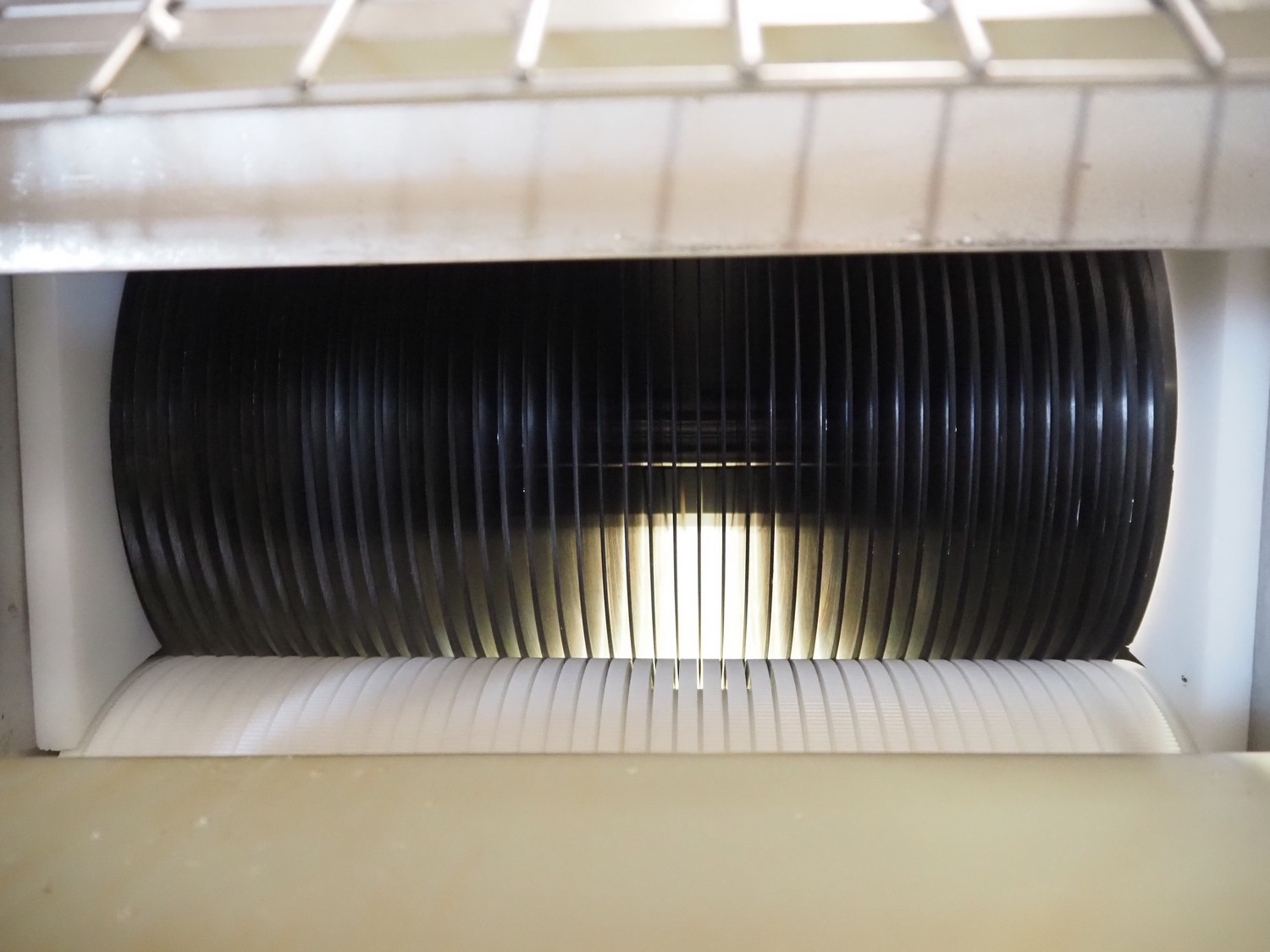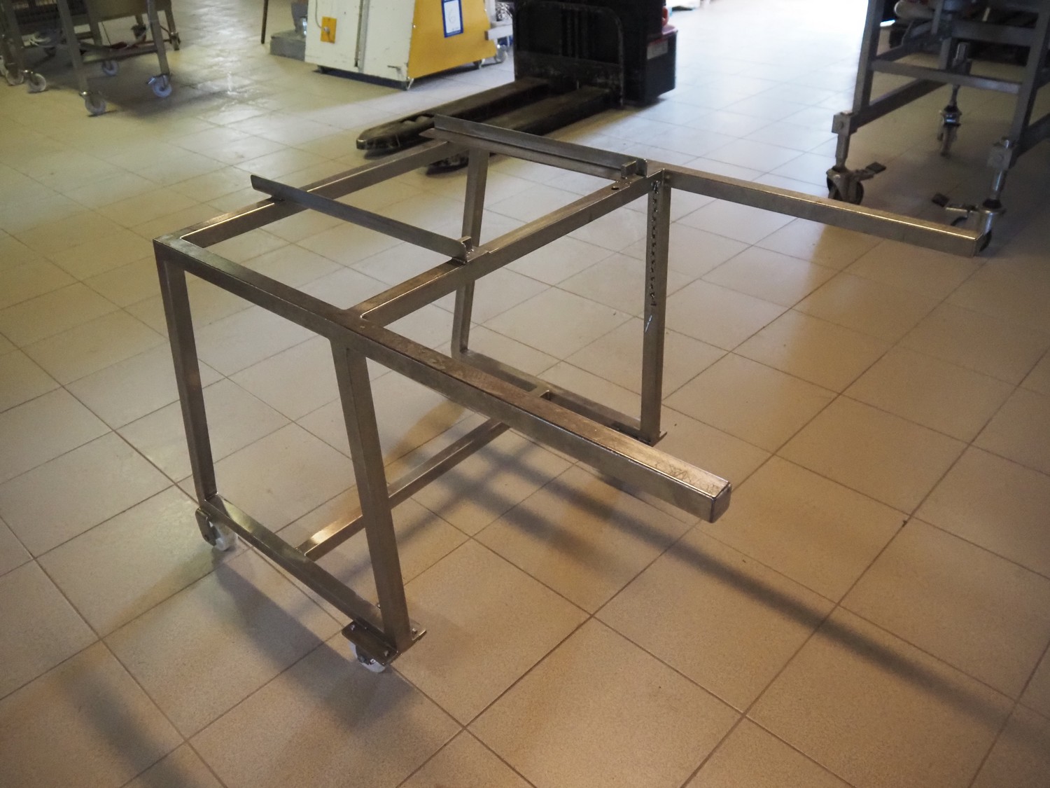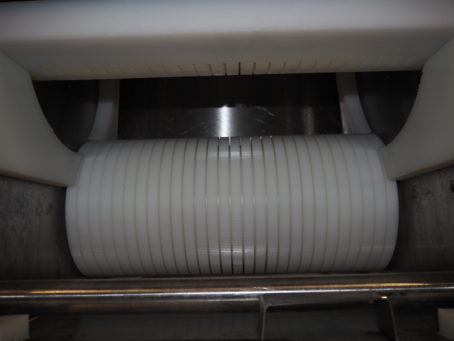 Franz Nahrungsmittelmachinen mobile strip cutter, type: MST91/400, machine number: 406061/1, year of construction: 2004, 400 V, 3 kW, plastic belt, belt width: 340 mm, clearance: 375 mm x 100 mm, distance between knives: 10 mm, total dimensions: 3200 mm x 1200 mm x 1600 mm. Including pallet with extra knife sets, distance between knives: (2x) 15 mm, (2x) 10 mm, (1x) 5 mm.