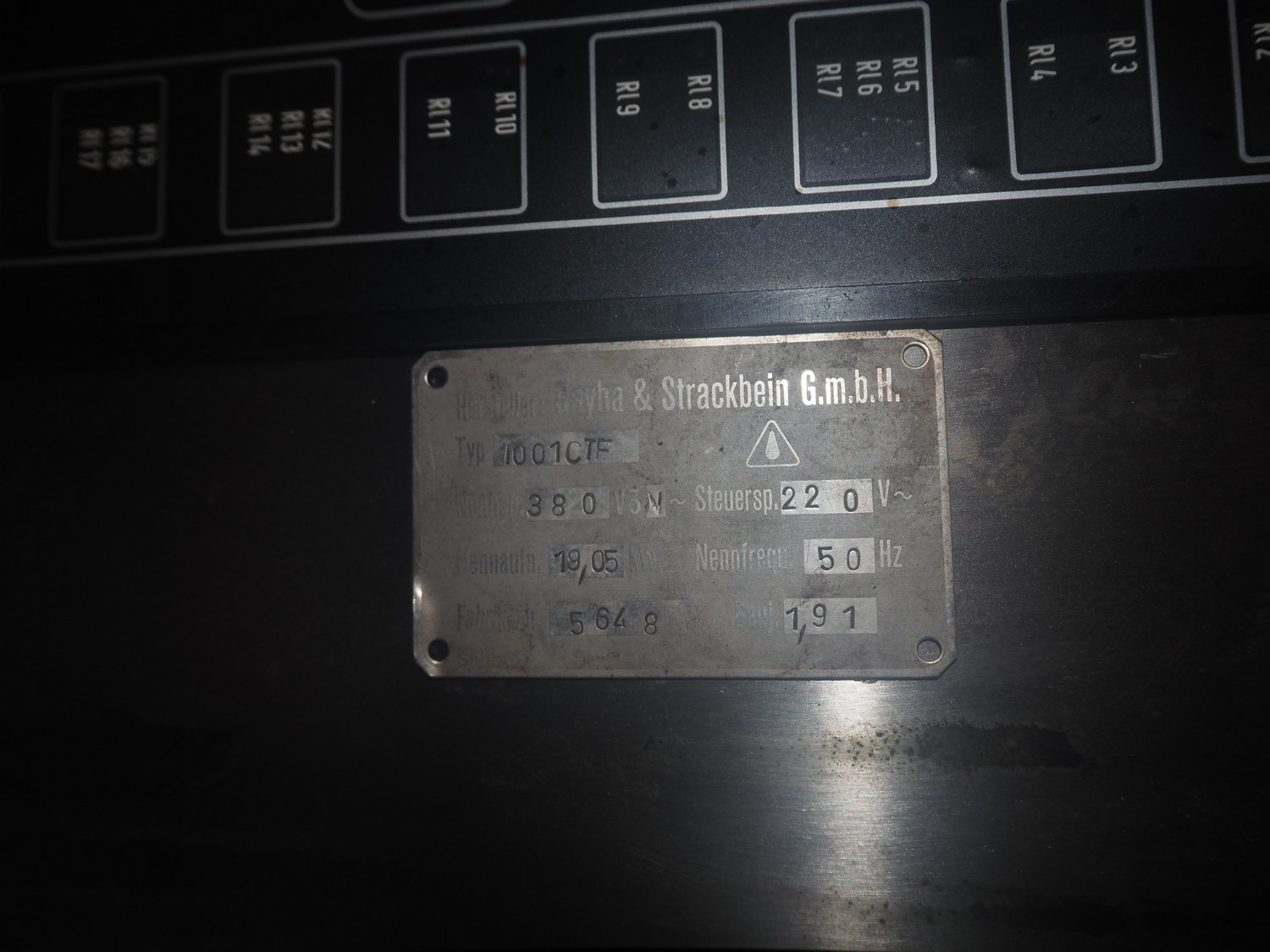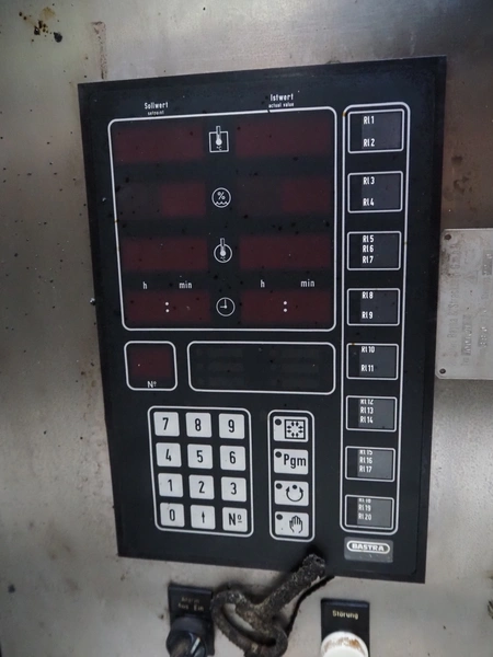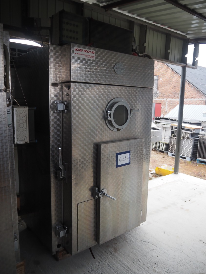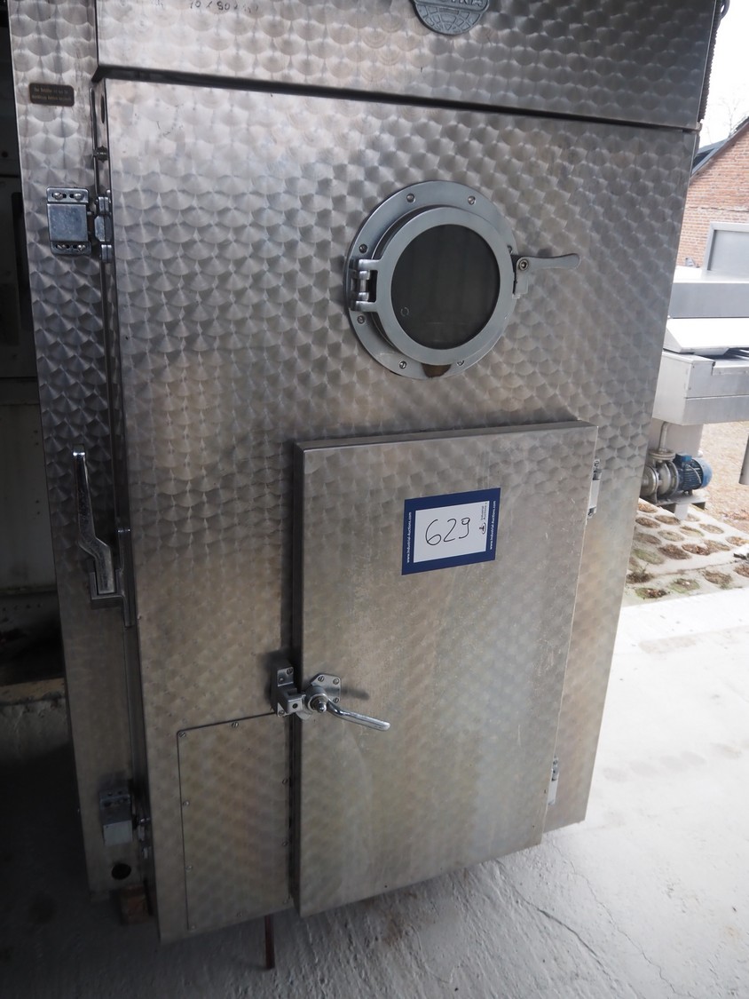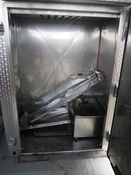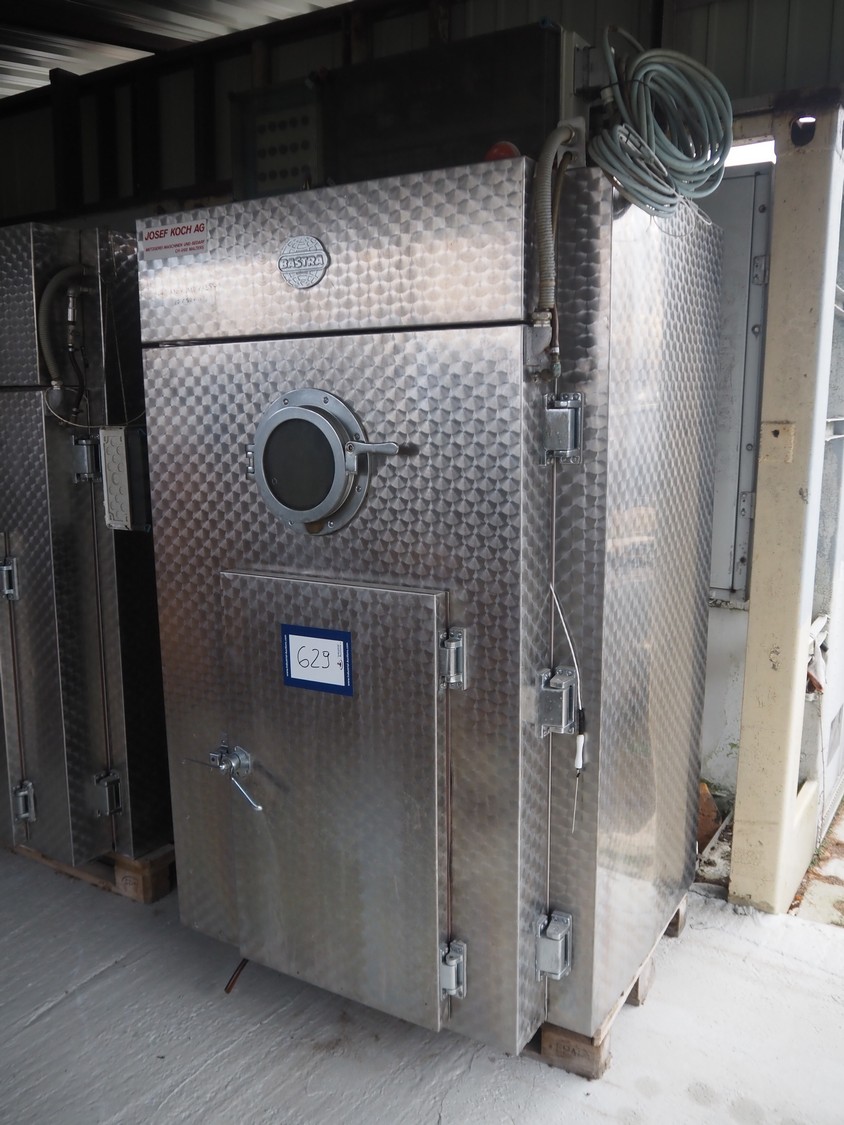 Bastra smoking chamber with wood chip smoke generator, type: 1001CTF, number: 5648, year of construction: 1-1991, 380 V, 3 Ph, 50 Hz, 19.05 kW, inside dimensions: 950 mm x 700 mm x 1430 mm, total dimensions: 1270 mm x 1130 mm x 1920 mm.