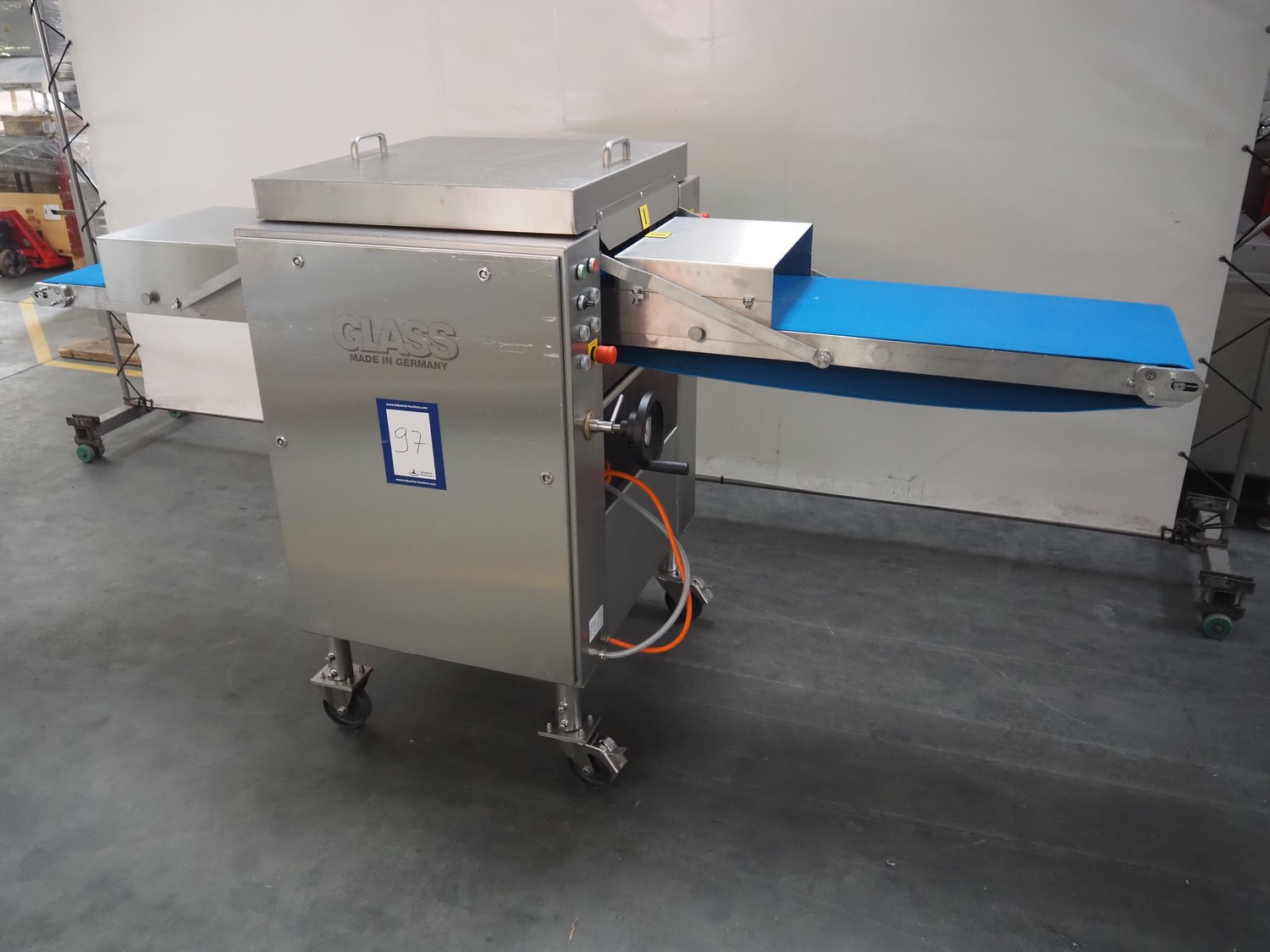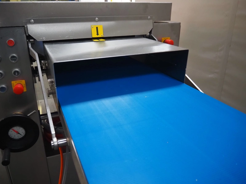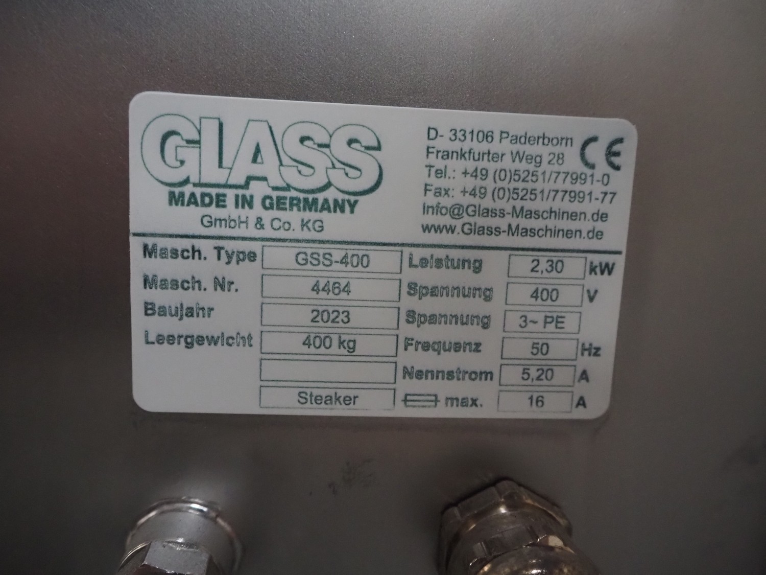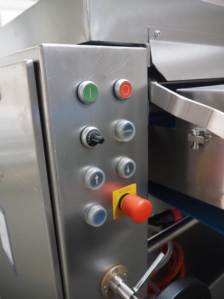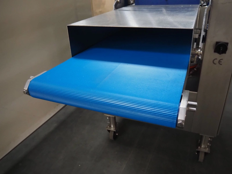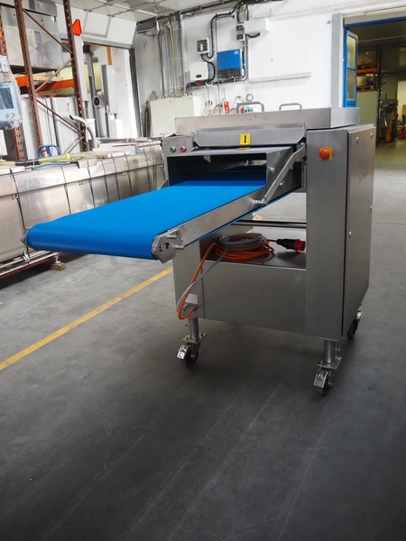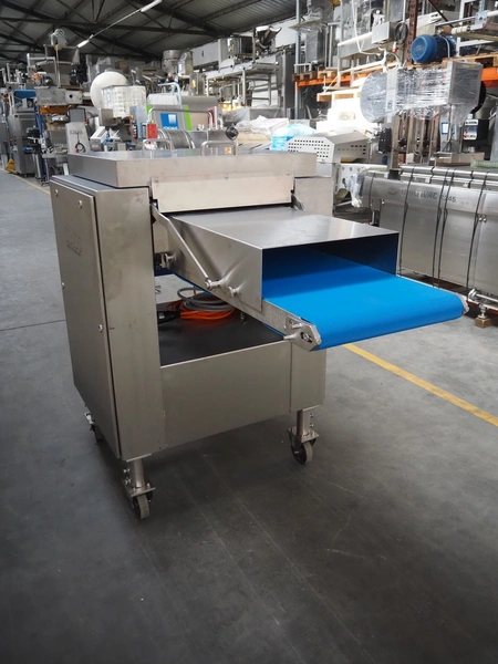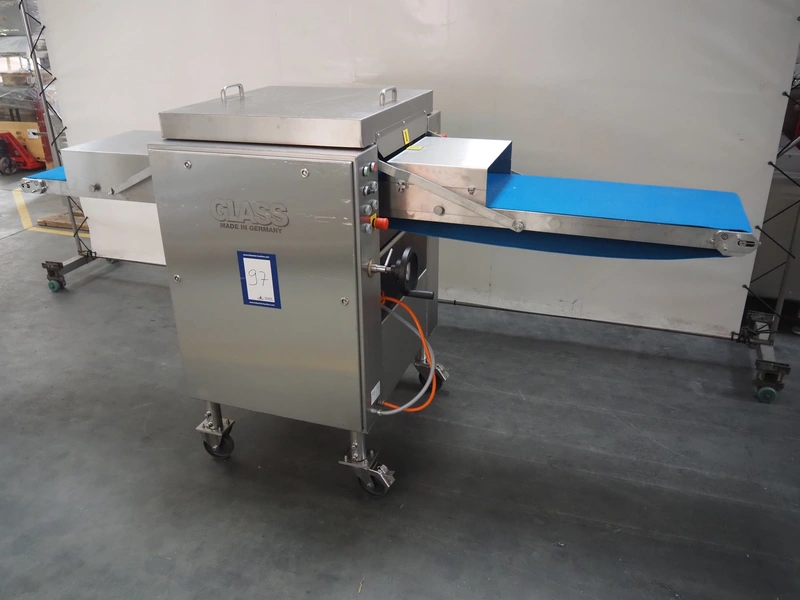 Glass mobile tenderizer, type: GSS-400, number: 4464, year of construction: 2023, 400 V, 3 Ph, 50 Hz, 5.2 A, 2.3 kW, weight: 400 kg, plastic belt, belt width: 440 mm, working width: 420 mm, total dimensions: 2750 mm x 960 mm x 1440 mm.