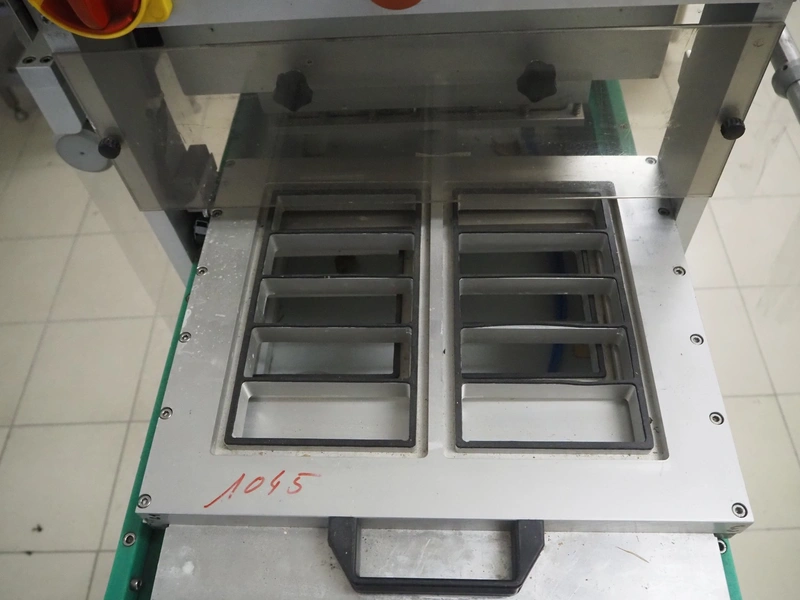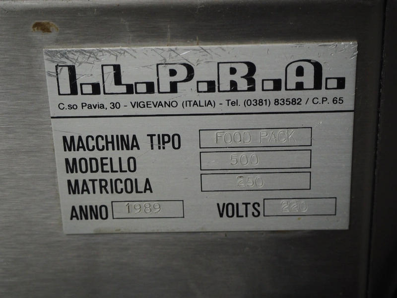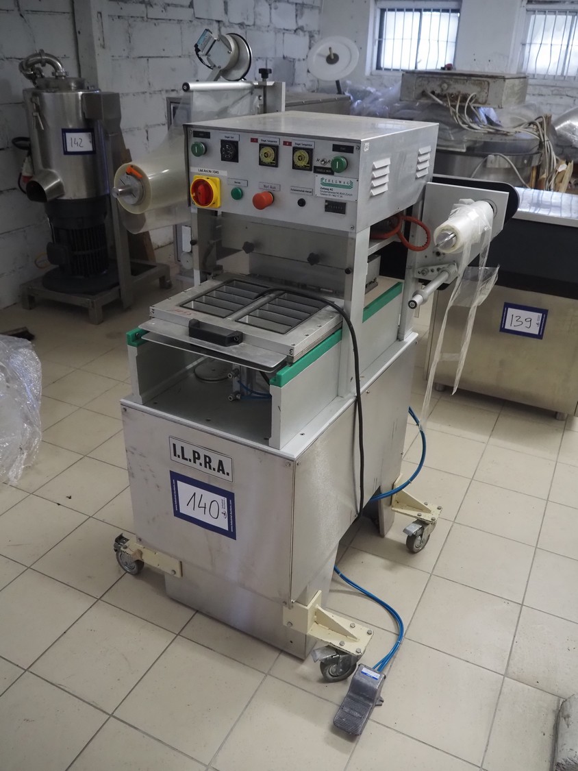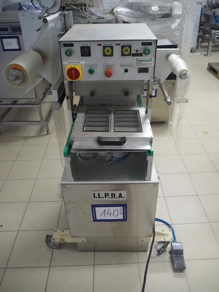 I.L.P.R.A. mobile traysealer, type: Food pack, model: 500, machine number: 250, year of construction: 1989, 220 V, film width: 310 mm, dimensions dye: 2x (5x) 145 mm x 50 mm, total dimensions: 1000 mm x 900 mm x 1600 mm. Including extra dye. Without vacuum pump.