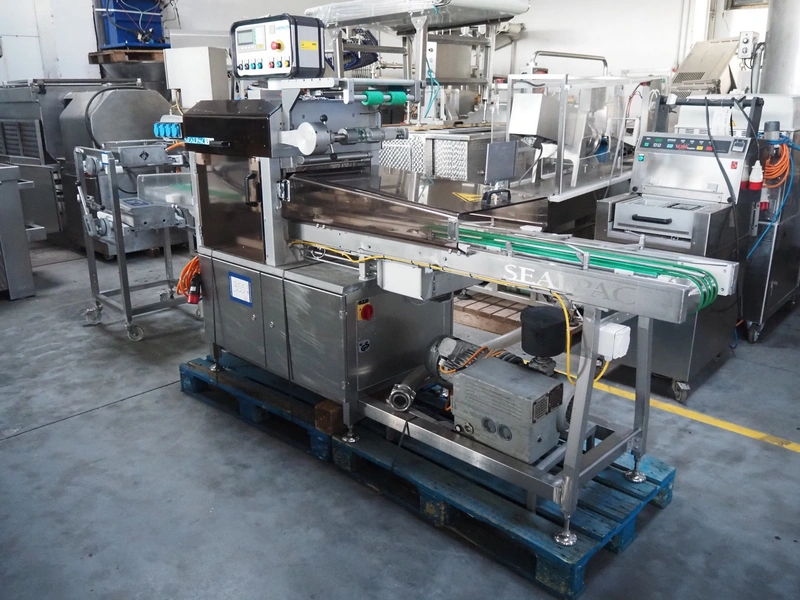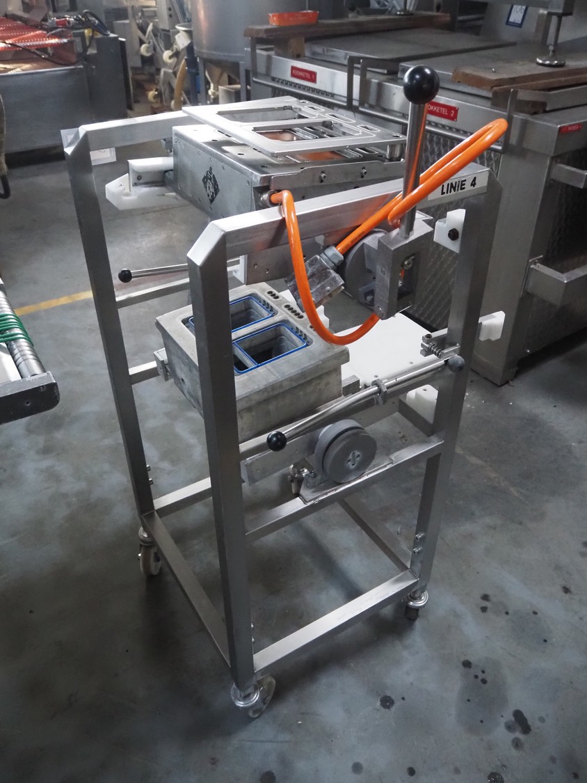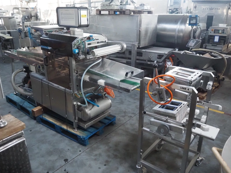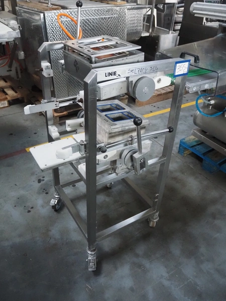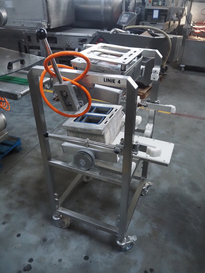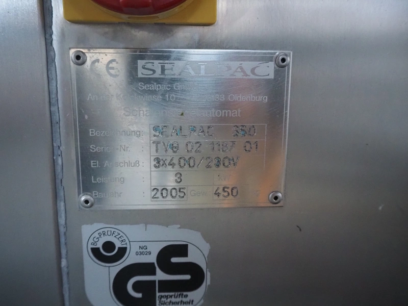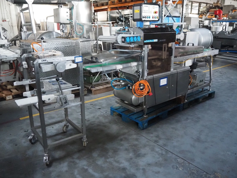 Sealpac traysealer, type: SEALPAC 350, serial number: TVG 02 1187 01, year of construction: 2005, 400/230 V, 3 Ph, 50 Hz, 3 kW, weight: 450 kg, plastic wire belt, belt width: 120 mm and 230 mm, Busch vacuum pump, total dimensions: 3250 mm x 750 mm x 1750 mm. Including trolley with dye set, dye: (2x) 160 mm x 105 mm, total dimensions trolley: 700 mm x 700 mm x 1430 mm.